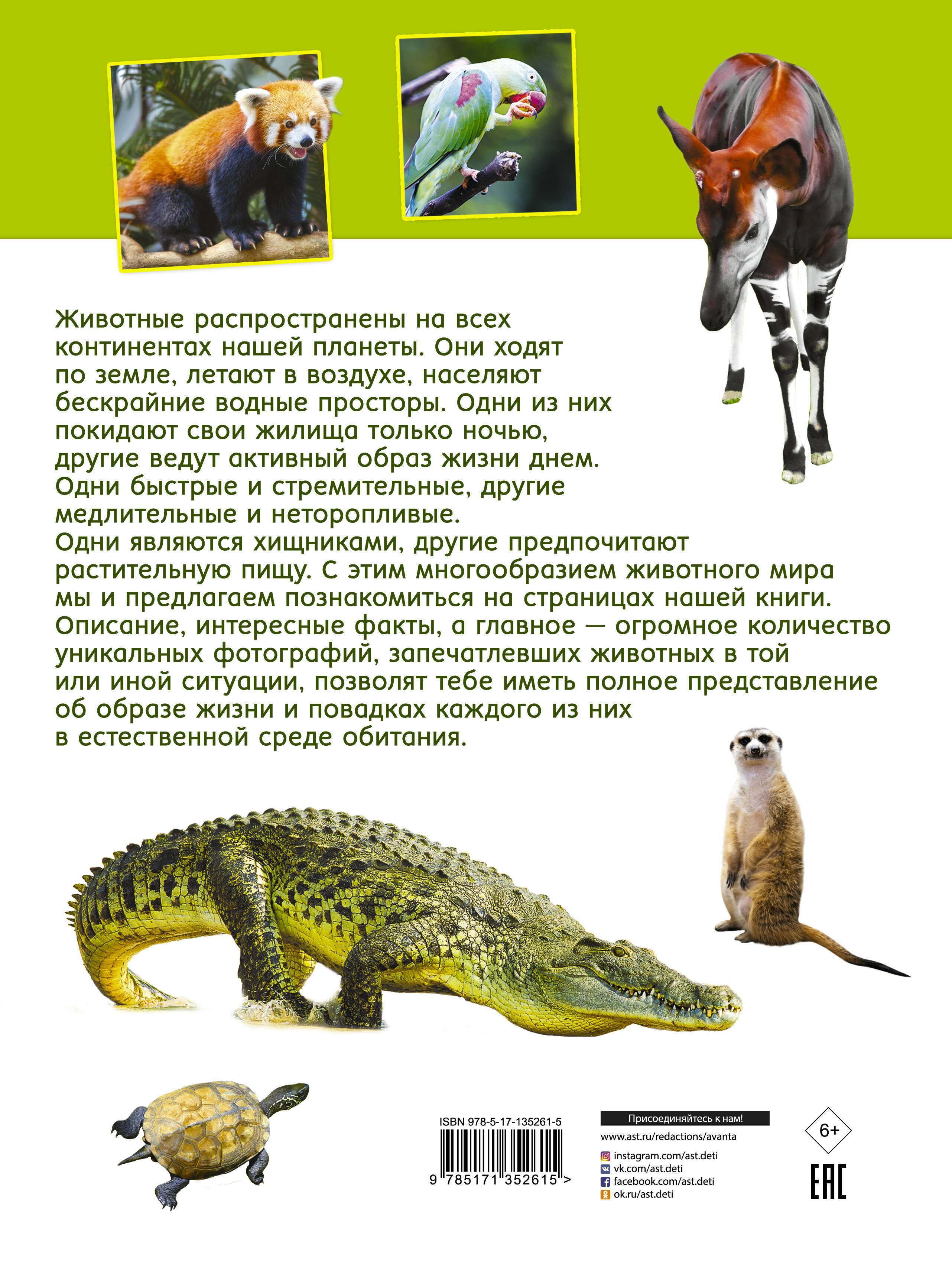 Везде на территории нашей планеты - от раскаленных песков жарких пустынь до закованных во льды полюсов - можно встретить животных. Многие тебе уже, конечно, знакомы: и волк, и лев, и даже азиатский мишка панда, но о некоторых скорее всего, даже не доводилось и слышать. Познакомиться со всем многообразием фауны тебе поможет эта книга. На ее страницах приведены очень интересные статьи, описывающие образ жизни и повадки разных зверей и птиц, но главное - здесь есть большое количество фотографий, благодаря которым ты сможешь рассмотреть во всех подробностях каждое животное в естественной среде обитания. Рассматривай красочные фотографий, читай справочную информацию и увлекательные факты и знакомься ближе с животными миром нашей планеты! Для среднего школьного возраста.