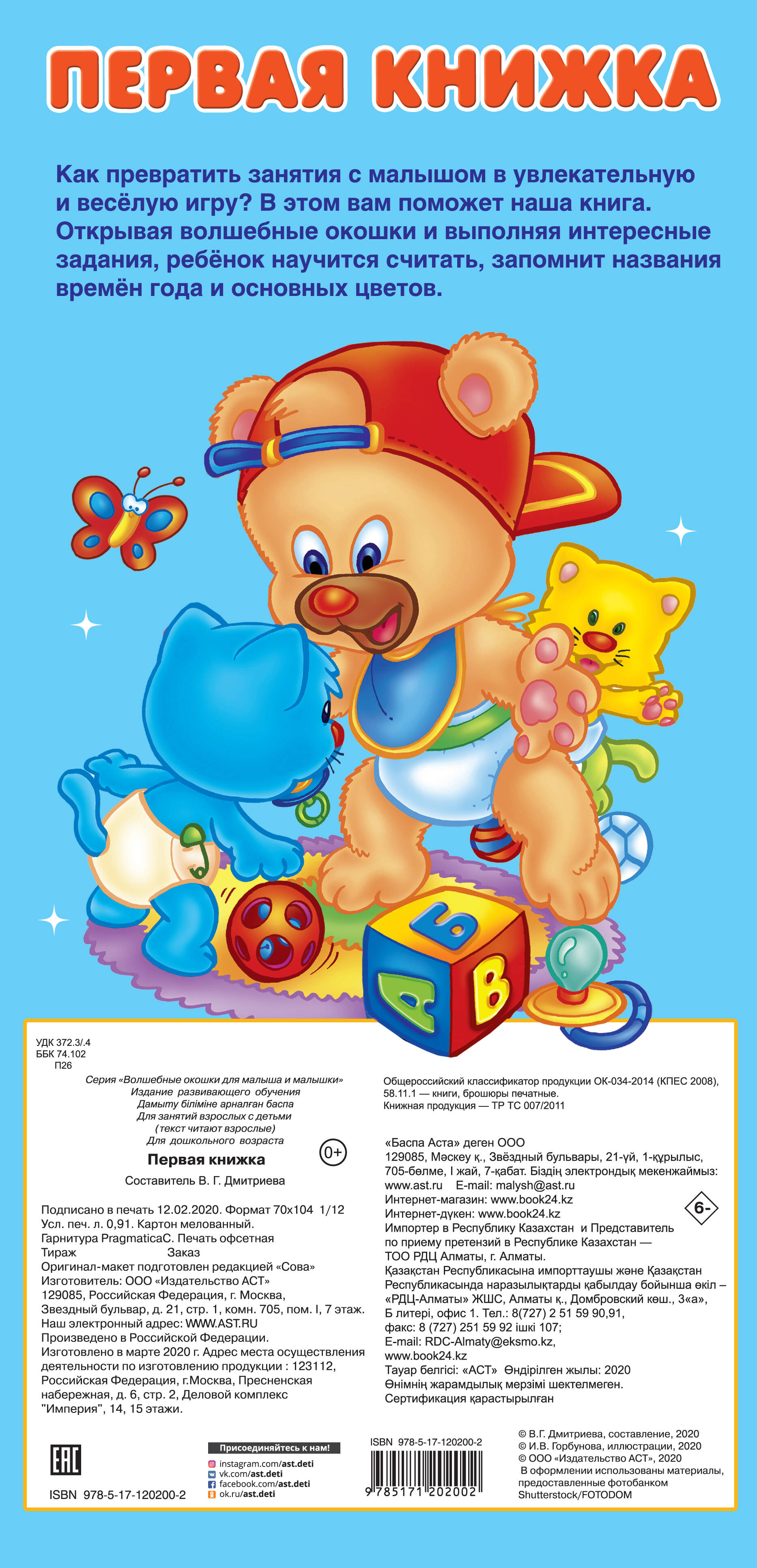 О чём эта книга Благодаря «Первой книге. 32 окошка» ребёнок получит первые знания по темам «Цвета», «Количество», «Времена года», «Еда». Открывая специальные окошки-клапаны и выполняя интересные задания, малыши потренируют память и интеллект, расширят кругозор. Кому эта книга будет интересна Книжка с окошками для детей дошкольного возраста. Каковы особенности этой книги • Работа с окошками способствуют развитию мелкой моторики. • Красочные картинки обязательно заинтересуют малыша и не дадут ему заскучать. Текст на обложку Как превратить занятия с малышом в увлекательную и весёлую игру? В этом вам поможет наша книга. Открывайте окошки, выполняйте интересные задания, разглядывайте красочные картинки - так ребёнок быстро и без лишних усилий получит первые знания об окружающем мире.| Издательство | Издательство "АСТ" |