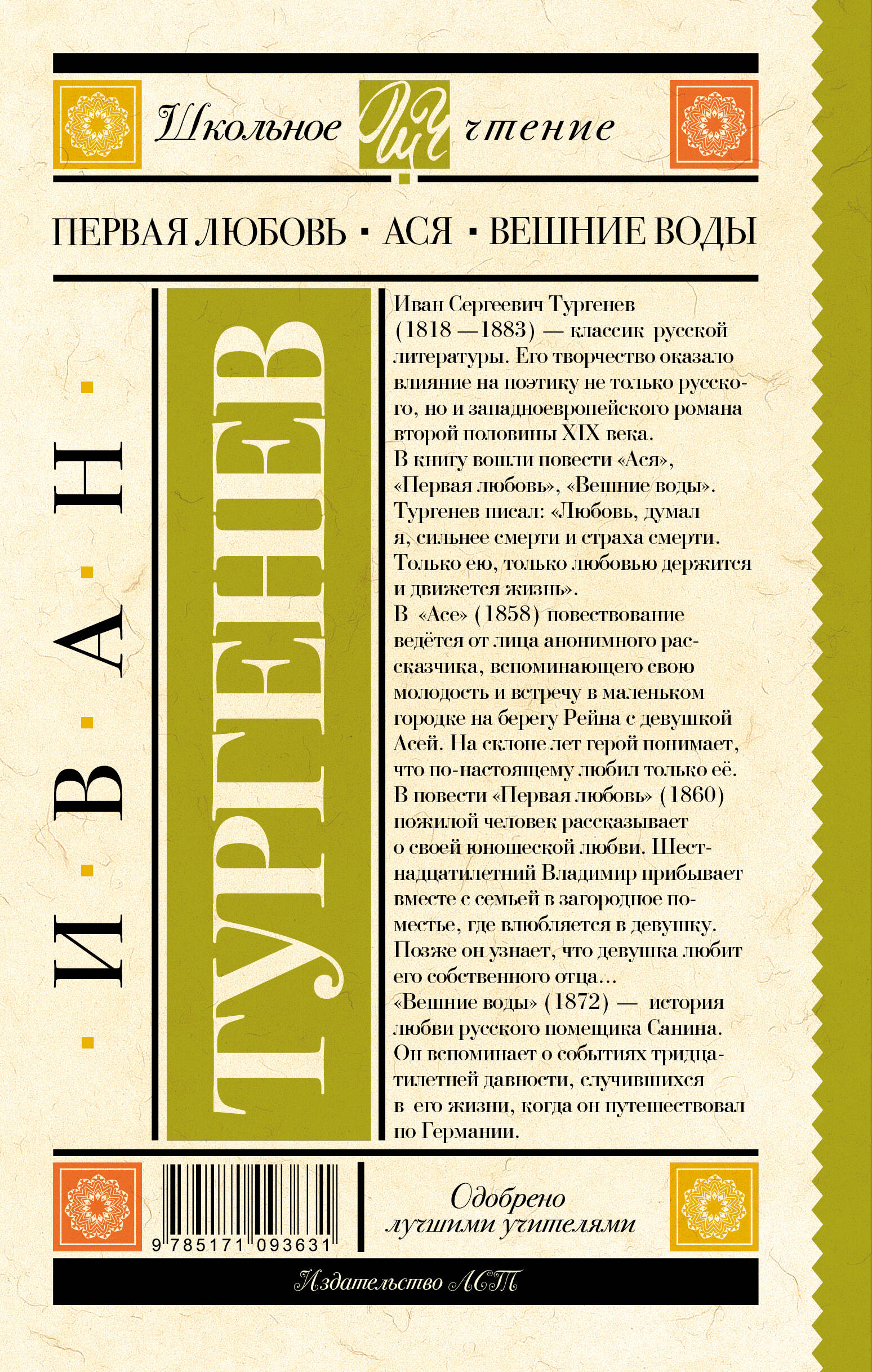 Иван Сергеевич Тургенев (1818 - 1883) - классик русской литературы. Его творчество оказало влияние на поэтику не только русского, но и западноевропейского романа второй половины ХIХ века. В книгу вошли повести «Ася», «Первая любовь», «Вешние воды», которые изучаются в школе.