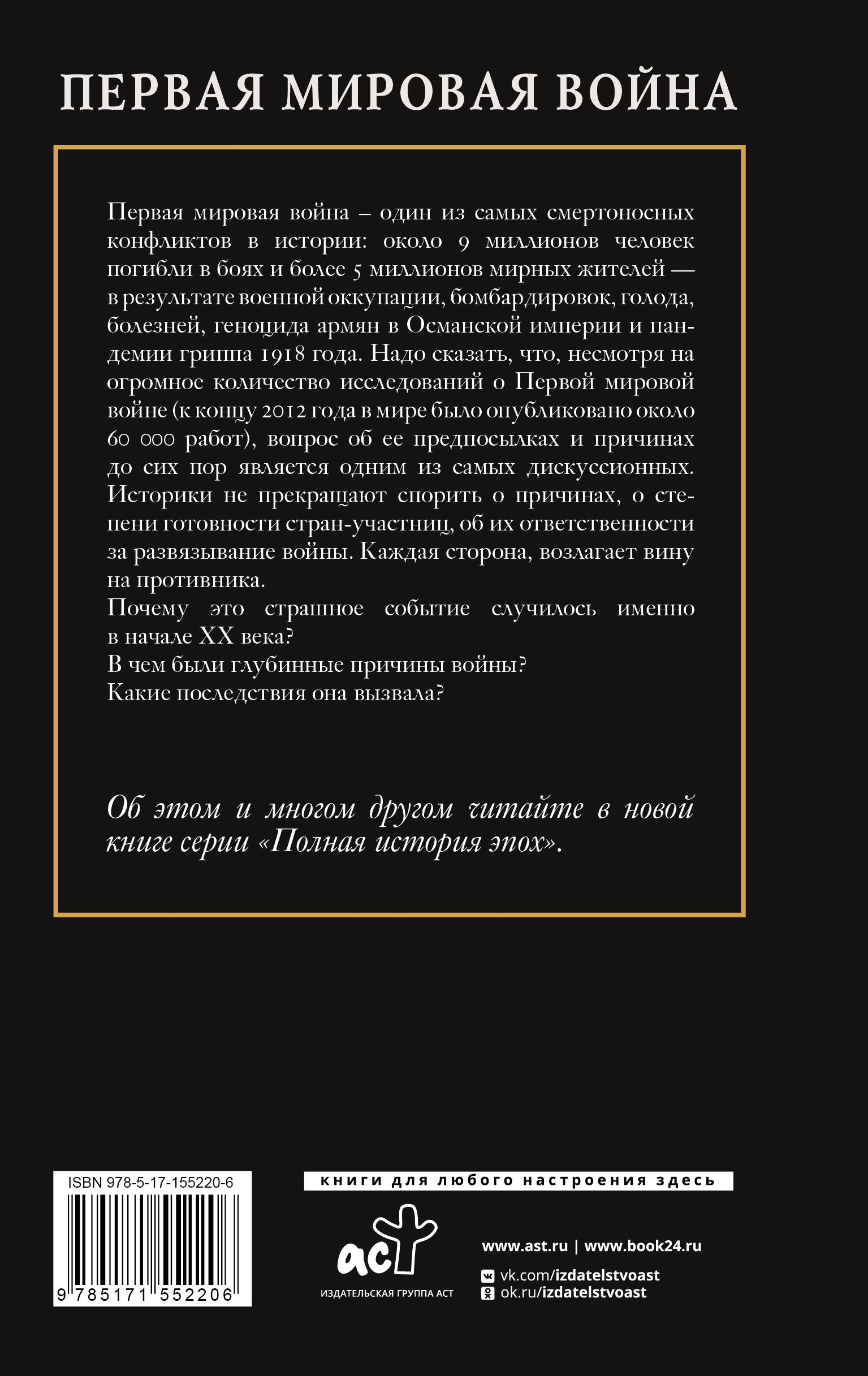 Первая мировая война - один из самых смертоносных конфликтов в истории: около 9 миллионов человек погибли в боях и более 5 миллионов мирных жителей- в результате военной оккупации, бомбардировок, голода и болезней. Миллионы людей погибли в результате геноцида армян в Османской империи и пандемии гриппа 1918 года. Надо сказать, что, несмотря на огромное количество исследований (к концу 2012 года в мире было опубликовано около 60 000 работ о Первой мировой войне), вопрос о предпосылках и причинах этой войны до сих пор является одним из самых дискуссионных. Историки не прекращают спорить о причинах войны, о степени готовности к ней стран-участниц, об ответственности за развязывание конфликта. Каждая сторона, возлагает вину на противника. Почему это страшное событие случилось именно в начале ХХ века? В чем были глубинные причины начала конфликта? Какие последствия он вызвал? Об этом и многом другом читайте в новой книге серии "Полная история эпох".| Издательство | Издательство "АСТ" |