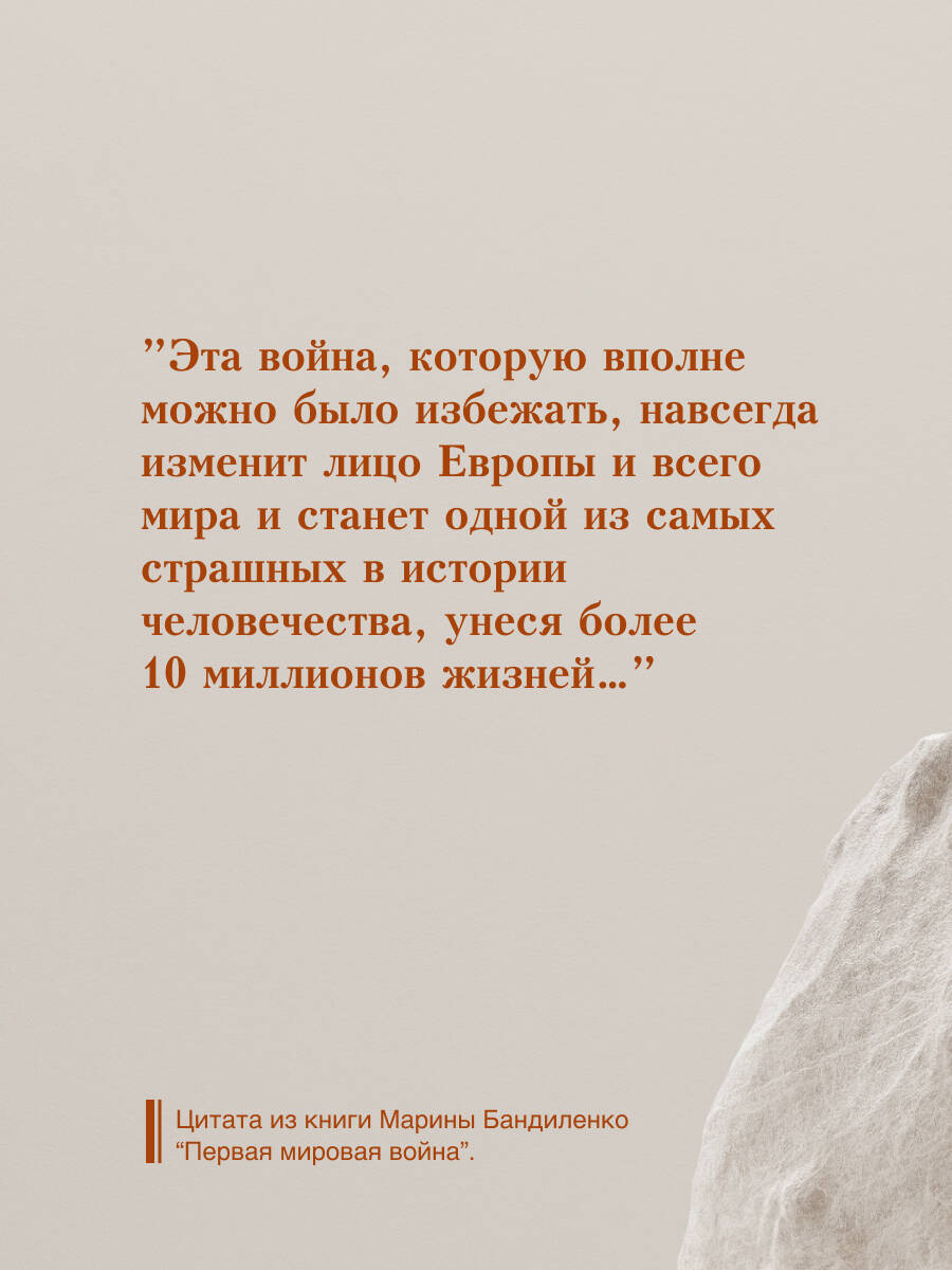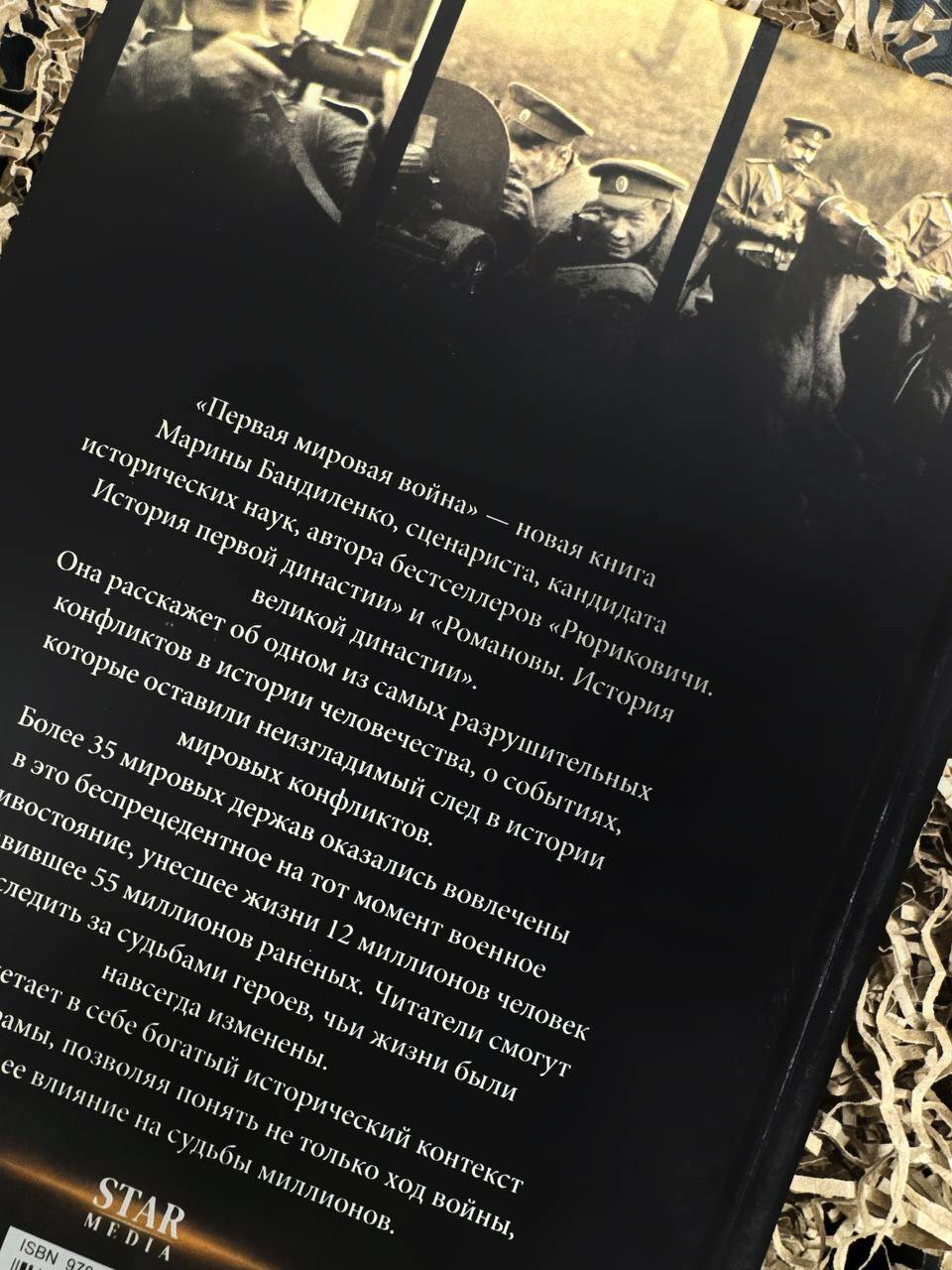 "Первая мировая война" - новая книга Марины Бандиленко, сценариста, кандидата исторических наук, автора бестселлеров "Рюриковичи. История первой династии" и "Романовы. История великой династии". Она расскажет об одном из самых разрушительных конфликтов в истории человечества, о событиях, которые оставили неизгладимый след в истории мировых конфликтов. Более 35 мировых держав оказались вовлечены в это беспрецедентное на тот момент военное противостояние, унесшее жизни 12 миллионов человек и оставившее 55 миллионов раненых. Читатели смогут проследить за судьбами героев, чьи жизни были навсегда изменены. Книга сочетает в себе богатый исторический контекст и личные драмы, позволяя понять не только ход войны, но и её влияние на судьбы миллионов.| Издательство | Издательство "АСТ" |