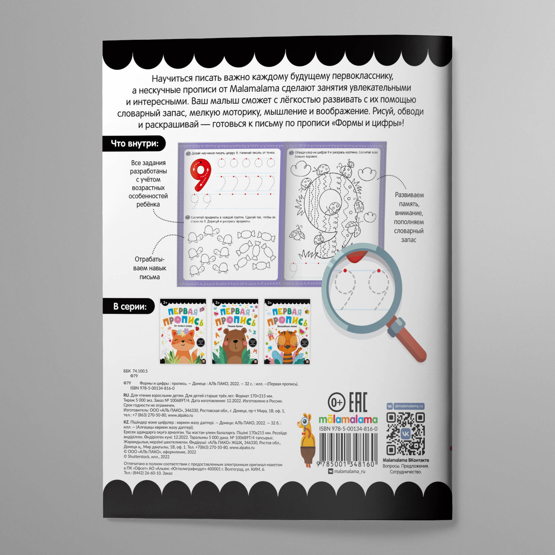 Научиться писать важно каждому будущему первокласснику, а нескучная серия "Первые прописи" от Malamalama сделает занятия увлекательными и интересными. Ваш малыш сможет с лёгкостью развивать с их помощью словарный запас, мелкую моторику, мышление и воображение. Рисуй, обводи и раскрашивай - готовься к письму по прописи "Формы и цифры"!