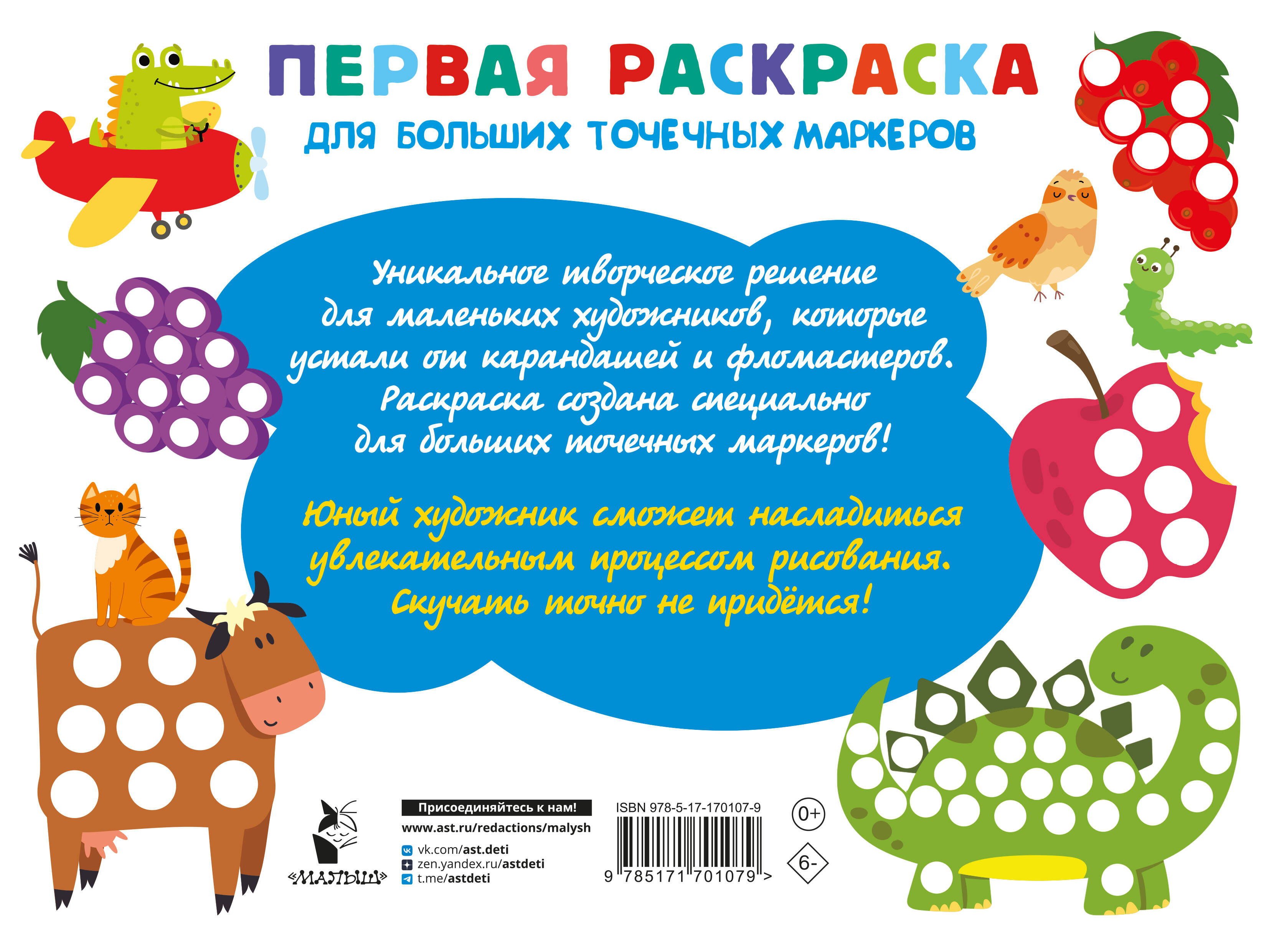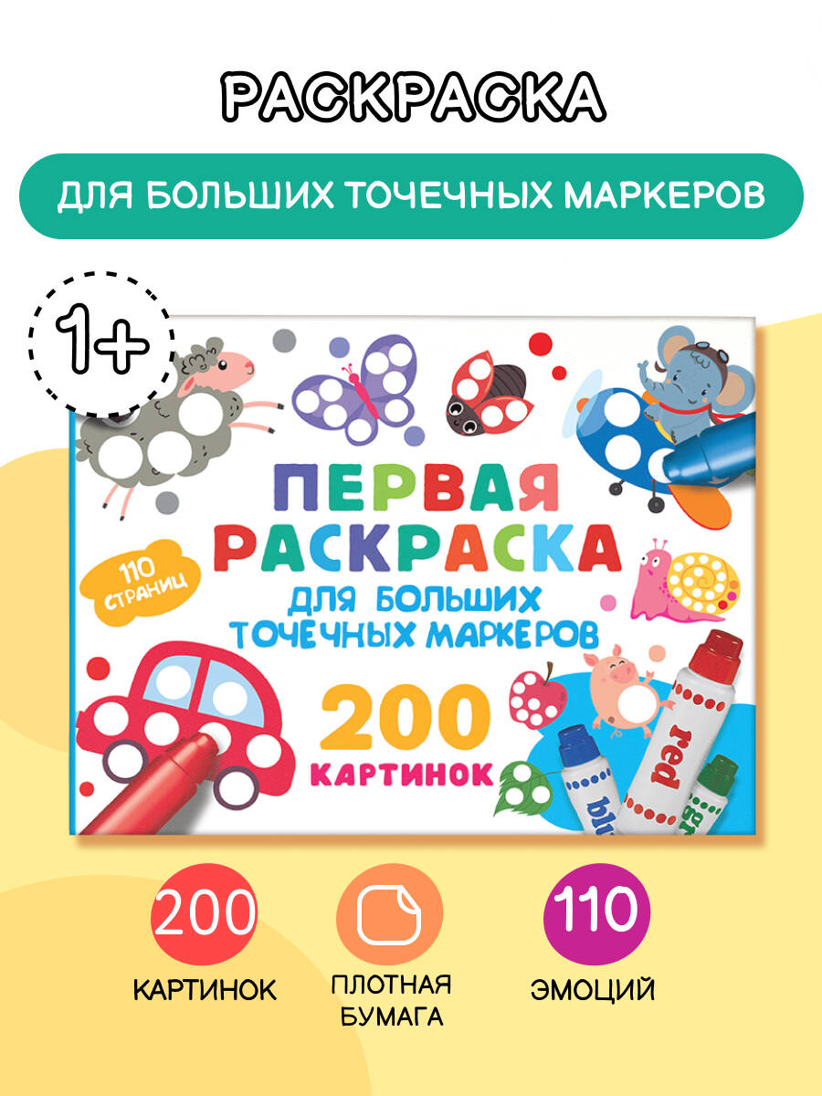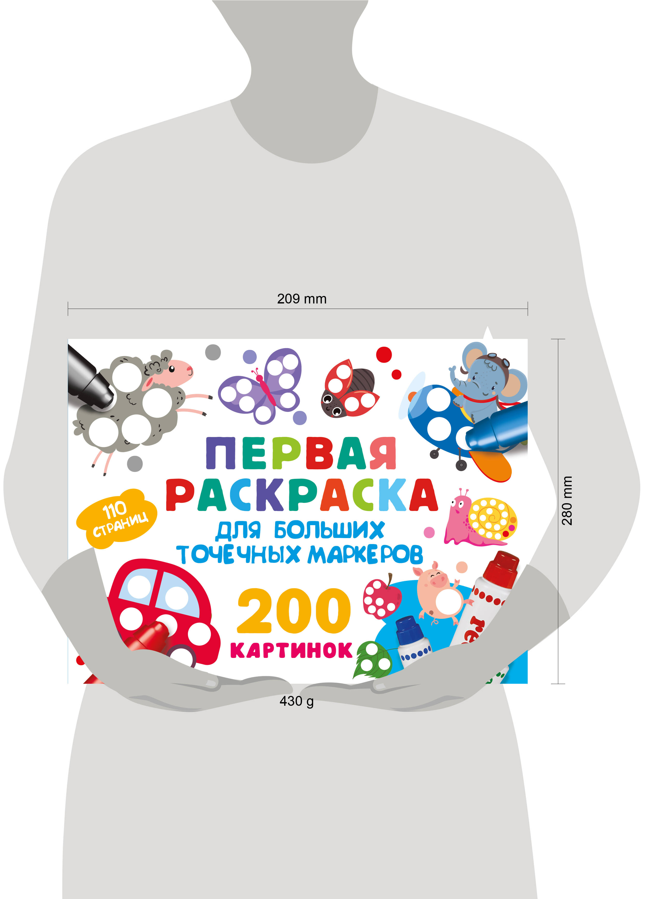 «Первая раскраска для больших точечных маркеров. 200 картинок» - находка для заботливых родителей! Неповторимые картинки из разноцветных круглых отпечатков - это не только отличный способ развлечь малыша, пообщаться с ним и укрепить эмоциональную связь, но и эффективная методика раннего развития мозга и мелкой моторики. Чем активнее и точнее движения пальцев малыша, тем быстрее он научится говорить правильно и красиво. С увлечением пробуя рисовать точечными маркерами, маленький фантазёр расширяет кругозор, развивает внимание, память, воображение, учится быть наблюдательным и любознательным, терпеливым и усидчивым, его пальчики постепенно становятся более ловкими, а движения - точными и слаженными. Необыкновенный простор для творческого мышления. В некоторых заданиях использованы точки разного диаметра, чтобы детям младшего возраста было удобнее работать с точечными маркерами. Настоящий антистресс: раскраска надолго отвлекает дошколят от гаджетов, мультиков. Сертифицирована, сделана из плотной и качественной бумаги, безопасна для использования. Также подходит для пальчиковых красок и картин из пластилина. Готовые работы из нашей книги станут креативным украшением детской комнаты.| Издательство | Издательство "АСТ" |