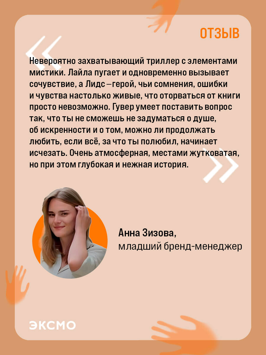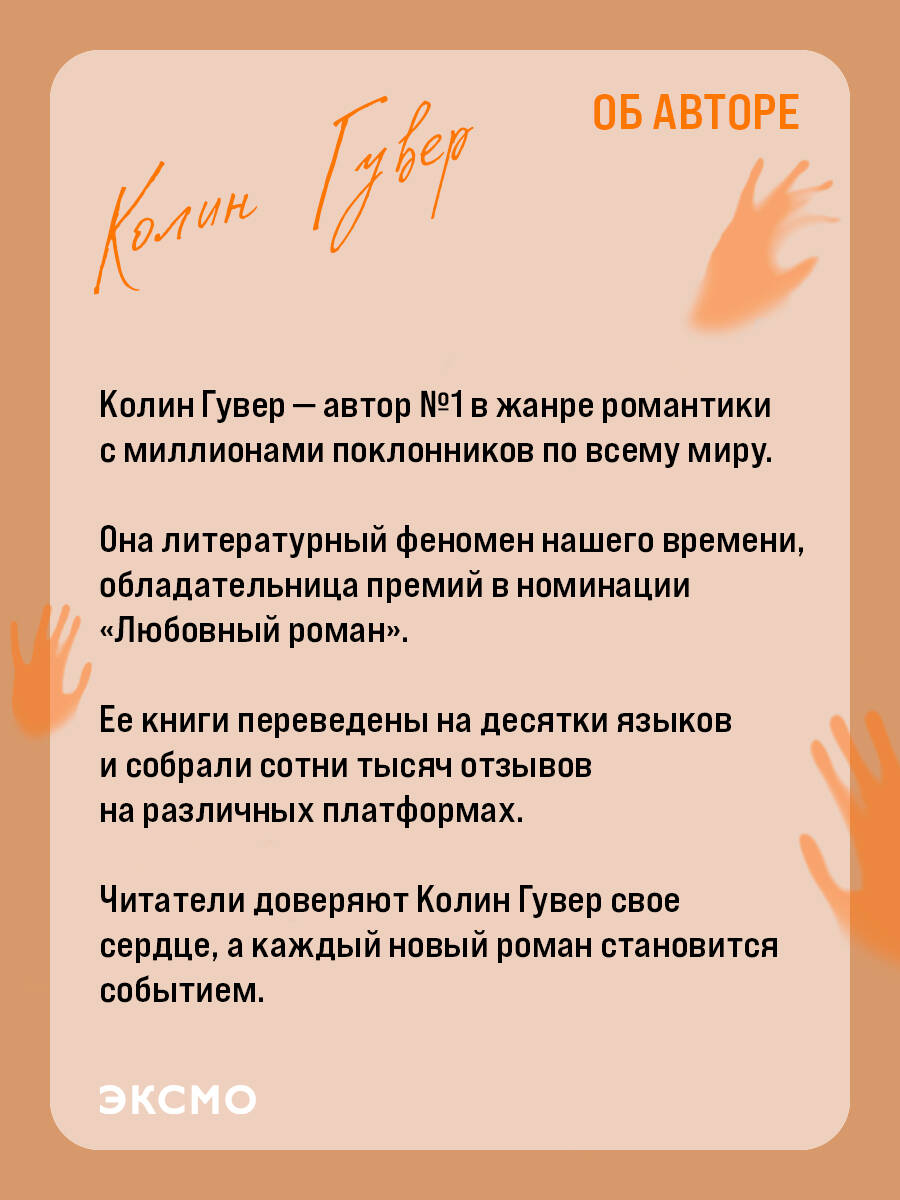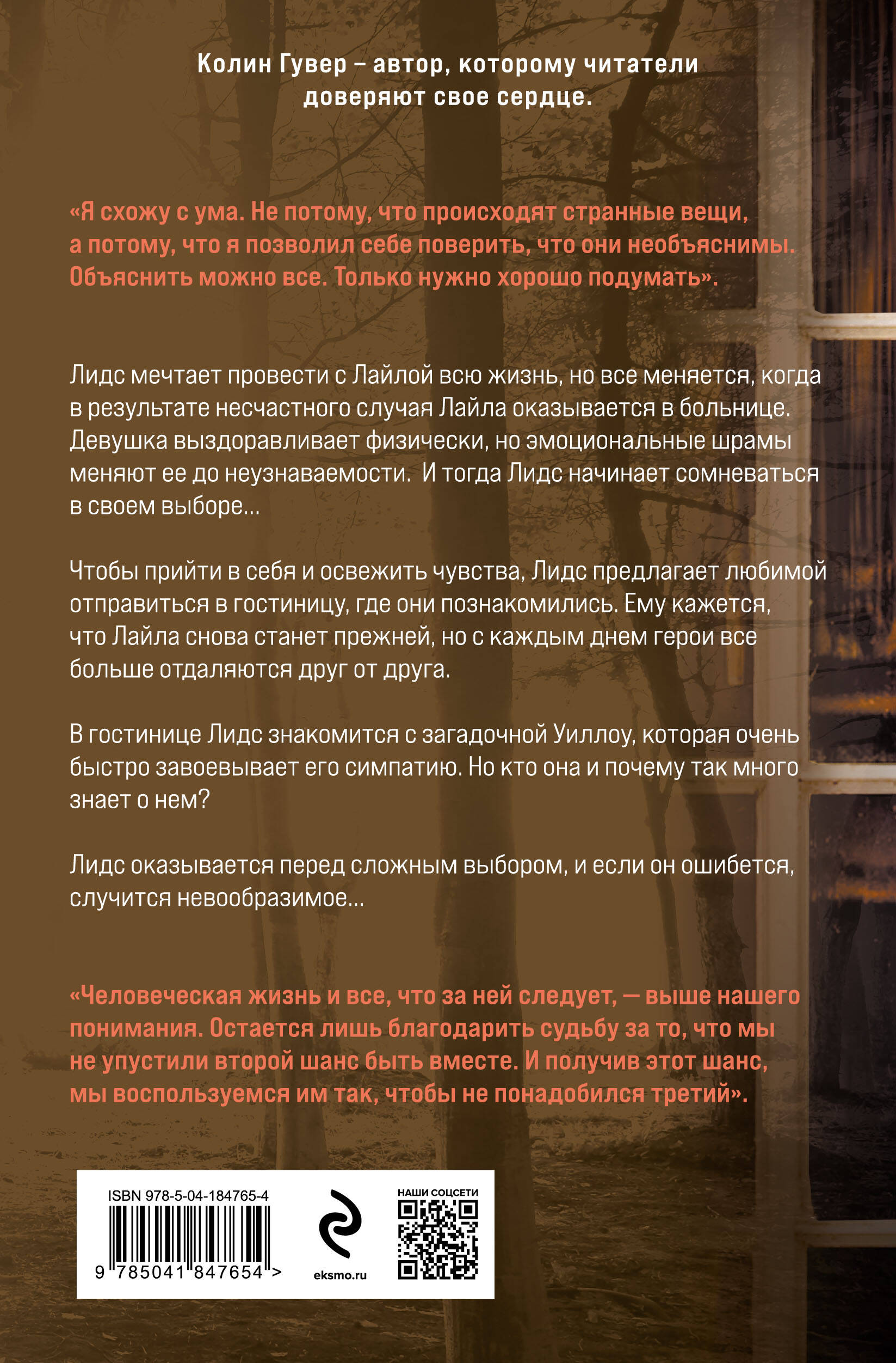 Колин Гувер - автор, которому читатели доверяют свое сердце. Она - мировой тренд, литературный феномен нашего времени, троекратная обладательница премии Goodreads Choice Award в номинации «любовный роман». Ее произведения переведены на десятки языков. Продажи книг Колин Гувер превысили продажи Стивена Кинга и Джорджа Мартина. Более 3 000 000 000 просмотров в TikTok. Красивый и практичный подарок только в первом тираже. Человеческая душа - главный символ этой книги. Что именно мы любим в человеке? Его внешнюю оболочку, сознание, душу? Но что есть душа? Бытует мнение, что когда душа покидает тело, но отказывается перемещаться в новую реальность, она возвращается в то место, которое для нее что-то значило при жизни. «Человеческая жизнь и все, что за ней следует, - выше нашего понимания. Остается лишь благодарить судьбу за то, что мы не упустили второй шанс быть вместе. И получив этот шанс, мы воспользуемся им так, чтобы не понадобился третий». Лидс мечтает провести с Лайлой всю жизнь, но все меняется, когда в результате несчастного случая Лайла оказывается в больнице. Девушка выздоравливает физически, но эмоциональные шрамы меняют ее до неузнаваемости. И тогда Лидс начинает сомневаться в своем выборе… Чтобы прийти в себя и освежить чувства, Лидс предлагает любимой отправиться в гостиницу, где они познакомились. Ему кажется, что Лайла снова станет прежней, но с каждым днем герои все больше отдаляются друг от друга. В гостинице Лидс знакомится с загадочной Уиллоу, которая очень быстро завоевывает его симпатию. Но кто она и почему так много знает о нем? Лидс оказывается перед сложным выбором, и если он ошибется, случится невообразимое… «Я схожу с ума. Не потому что происходят странные вещи, а потому что я позволил себе поверить, что они необъяснимы. Объяснить можно все. Только нужно хорошо подумать».| Издательство | ООО "Издательство "Эксмо" |