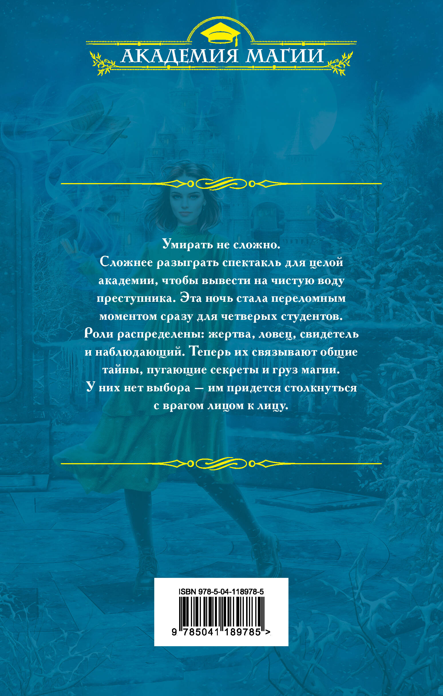 Умирать не сложно. Сложнее разыграть спектакль для целой академии, чтобы вывести на чистую воду преступника. Эта ночь стала переломным моментом сразу для четверых студентов. Роли распределены: жертва, ловец, свидетель и наблюдающий. Теперь их связывают общие тайны, пугающие секреты и груз магии. У них нет выбора - им придется столкнуться с врагом лицом к лицу. 1) Отличное атмосферное фэнтези про магическую школу. 2) В центре внимания несколько персонажей с разными судьбами, найдется фаворит для каждого читателя. 3) Погружение в чувственный эмоциональный мир подростков. 4) Увлекательное детективное расследование внутри сюжета и неожиданное его развитие. 5) Наблюдение за тем, как раскрываются многочисленные тайны и загадки, окружающие героев. Что ждёт их впереди?| Издательство | Эксмо |
