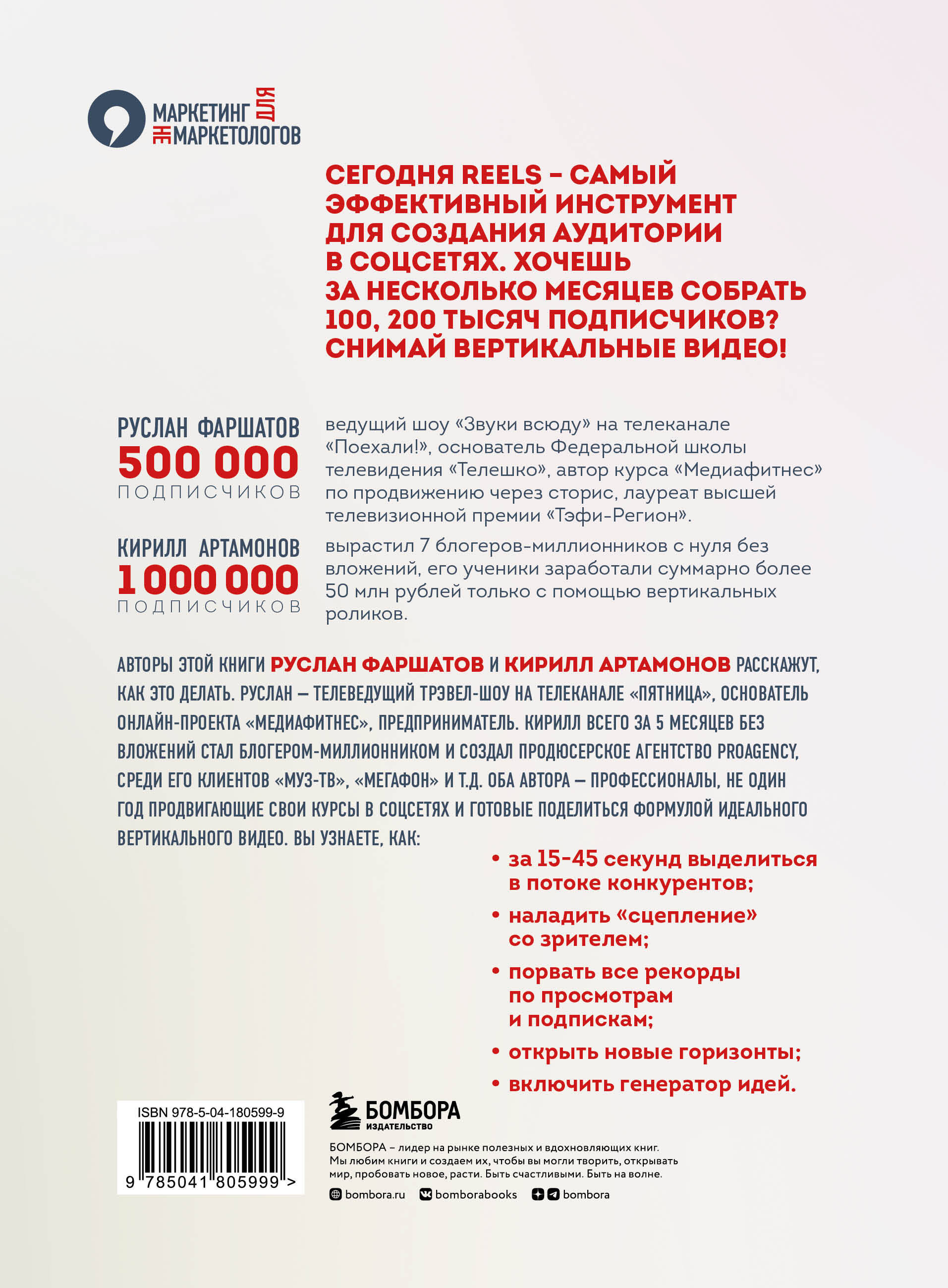 Сегодня Reels - самый эффективный инструмент для создания аудитории в соцсетях. Хочешь за несколько месяцев собрать 100, 200 тысяч подписчиков? Снимай вертикальные видео! Авторы этой книги, Руслан Фаршатов и Кирилл Артамонов, расскажут, как это делать. Руслан - телеведущий трэвел-шоу на телеканале «Пятница», основатель онлайн-проекта «Медиафитнес», предприниматель. Кирилл всего за 5 месяцев без вложений стал блогером-миллионником и создал продюсерское агентство ProAgency, среди его клиентов: Муз-ТВ, Мегафон и т.д. Оба автора - профессионалы, не один год продвигающие свои курсы в соцсетях и готовые поделиться формулой «идеального вертикального видео». Вы узнаете, как: • за 15-45 секунд выделиться в потоке конкурентов; • наладить «сцепление» со зрителем; • порвать все рекорды по просмотрам и подпискам; • открыть новые горизонты; • включить генератор идей.| Издательство | ООО "Издательство "Эксмо" |