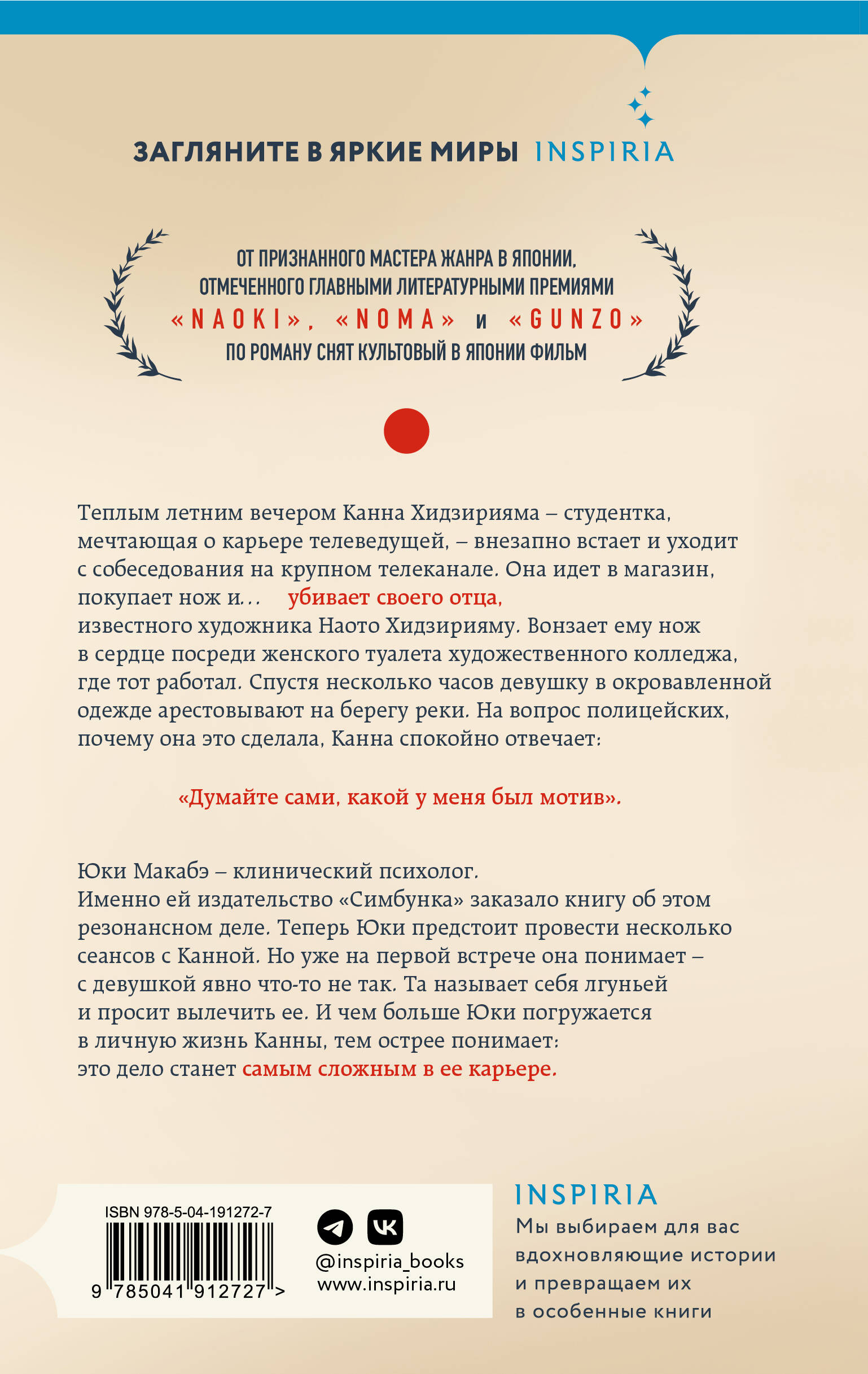 ОТ ПРИЗНАННОГО МАСТЕРА ЖАНРА В ЯПОНИИ, ОТМЕЧЕННОГО ГЛАВНЫМИ ЛИТЕРАТУРНЫМИ ПРЕМИЯМИ «NAOKI», «NOMA» И «GUNZO» ПО РОМАНУ СНЯТ КУЛЬТОВЫЙ В ЯПОНИИ ФИЛЬМ Теплым летним вечером Канна Хидзирияма - привлекательная студентка, мечтающая о карьере телеведущей - внезапно встает и уходит с важного для нее собеседования на крупном телеканале. Она идет в магазин, покупает нож и… убивает своего отца, известного художника Наото Хидзирияму. Вонзает ему нож в сердце посреди женского туалета художественного колледжа, где тот работал. Спустя несколько часов девушку в окровавленной одежде арестовывают на берегу реки. На вопрос полицейских, почему она это сделала, Канна спокойно отвечает: «Думайте сами, какой у меня был мотив». Юки Макабэ - клинический психолог. Именно ей издательство «Симбунка» заказало книгу об этом резонансном деле. Теперь Юки предстоит провести несколько сеансов с Канной. Но уже на первой встрече она видит - с девушкой явно что-то не так. Та называет себя лгуньей и просит вылечить ее. И чем больше Юки погружается в личную жизнь Канны, тем острее понимает: это дело станет самым сложным в ее карьере. Аннотация на оборот титула: Теплым летним вечером Канна Хидзирияма - привлекательная студентка, мечтающая о карьере телеведущей - внезапно встает и уходит с важного для нее собеседования на крупном телеканале. Она идет в магазин, покупает нож и… убивает своего отца, известного художника Наото Хидзирияму. Вонзает ему нож в сердце посреди женского туалета художественного колледжа, где тот работал. Спустя несколько часов девушку в окровавленной одежде арестовывают на берегу реки. На вопрос полицейских, почему она это сделала, Канна спокойно отвечает: «Думайте сами, какой у меня был мотив». Юки Макабэ - клинический психолог. Именно ей издательство «Симбунка» заказало книгу об этом резонансном деле. Теперь Юки предстоит провести несколько сеансов с Канной. Но уже на первой встрече она видит - с девушкой явно что-то не так. Та называет себя лгуньей и просит вылечить ее. И чем больше Юки погружается в личную жизнь Канны, тем острее понимает: это дело станет самым сложным в ее карьере.| Издательство | ООО "Издательство "Эксмо" |