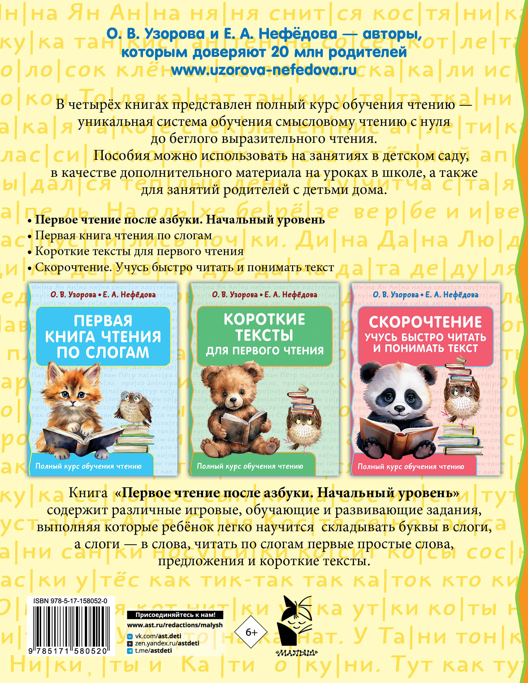 Пособие «Первое чтение после азбуки. Начальный уровень» - первая книга полного курса обучения чтению - уникальной системы обучения смысловому чтению с нуля до беглого выразительного чтения. Книга содержит различные игровые обучающие и развивающие задания, выполняя которые ребёнок легко научится складывать буквы в слоги, а слоги - в слова, читать по слогам первые простые слова, предложения и короткие тексты. • • Первое чтение после азбуки. Начальный уровень • Первая книга чтения по слогам • Короткие тексты для первого чтения • Скорочтение. Учусь быстро читать и понимать текст • • Все, что поможет ребенку подготовиться к школе, стать успешным в учёбе, вы найдёте в книгах известных авторов О.В. Узоровой и Е.А. Нефёдовой: обучение чтению, читаем по слогам, развивающее чтение, развивающее обучение, подготовка к школе, раннее развитие, дошкольное обучение.| Издательство | Издательство "АСТ" |
