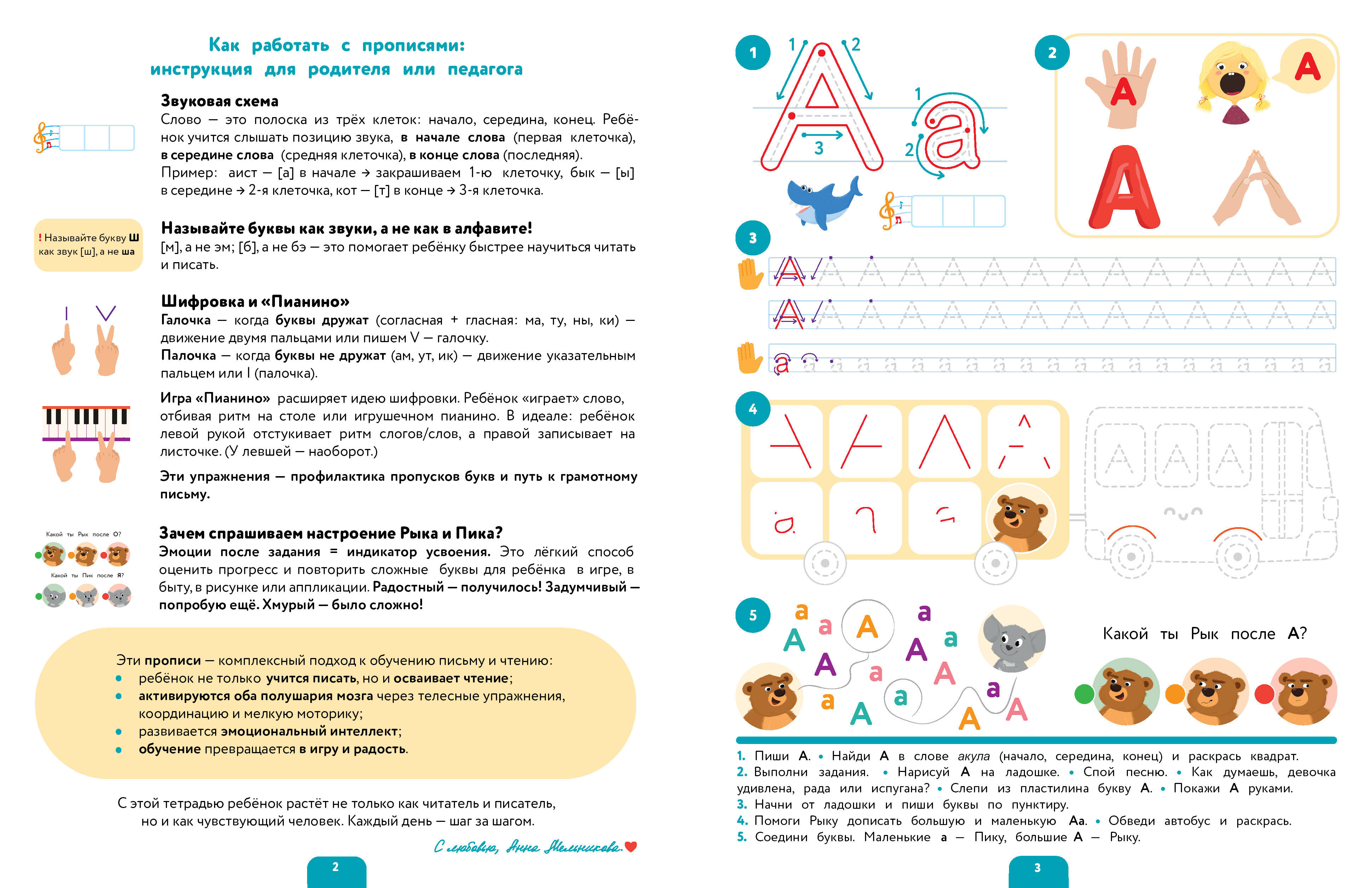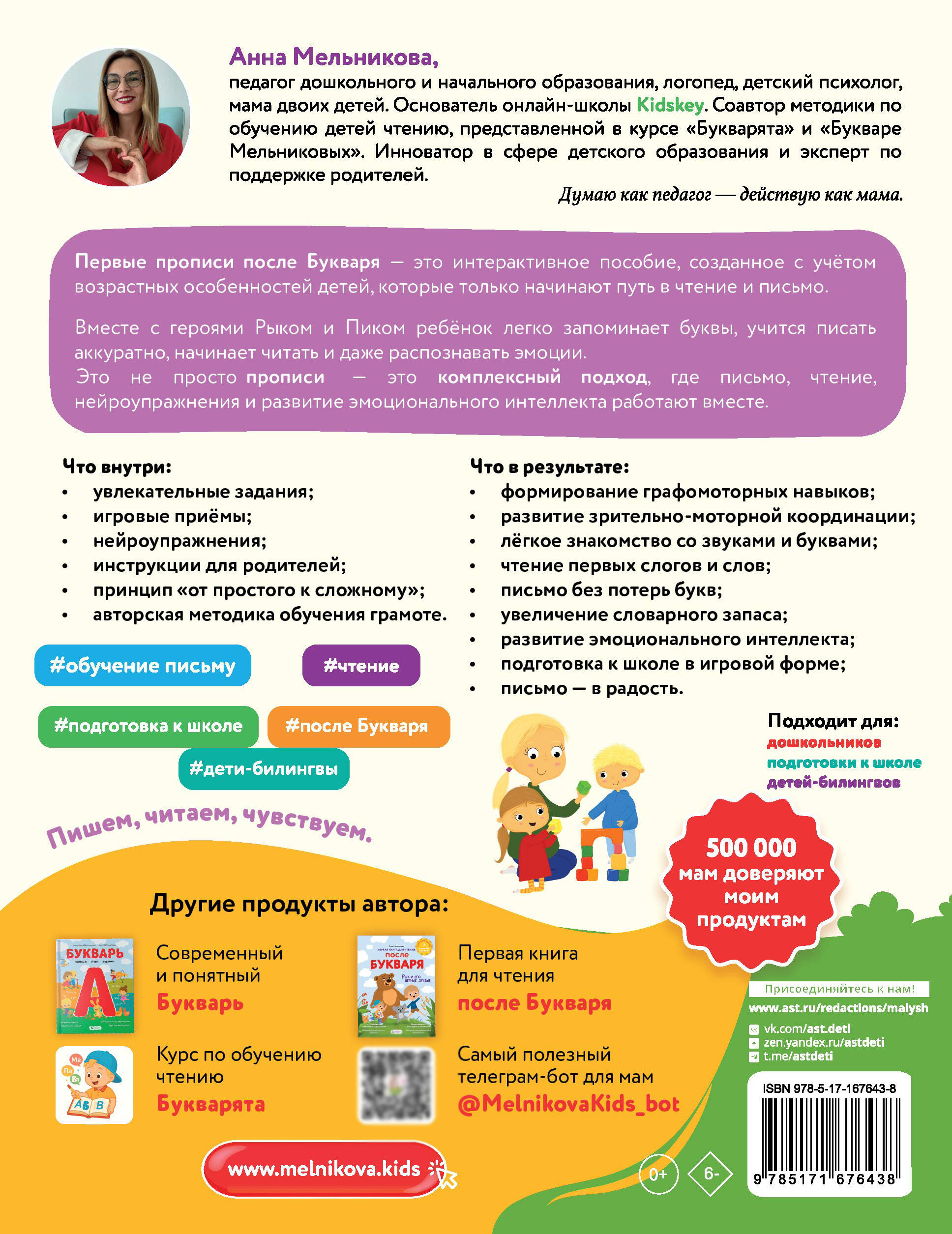 Как научить ребёнка писать? Какие прописи подойдут для современных детей? Автор книги Анна Мельникова, педагог, логопед, основатель онлайн-школы Kidskey, знает как найти подход даже к самому непоседливому малышу. Первые прописи после букваря - это интерактивное пособие для формирования графических навыков и знакомства со звуками и буквами. Вместе с непоседливыми героями Рыком и Пиком дети будут заниматься с удовольствием и покажут прекрасные результаты. Игровые задания способствуют формированию зрительно-моторной координации, развитию межполушарное взаимодействие, тренируют речь, внимание, память и мышление. Прописи созданы с учетом возрастных особенностей детей с использованием ярких образов, движений и тактильных ощущений для лучшего запоминания. Пособие станет отличным подарком для вашего сына или дочки и помогут подготовиться к школе. Учитесь с пользой и удовольствием!| Издательство | Издательство "АСТ" |