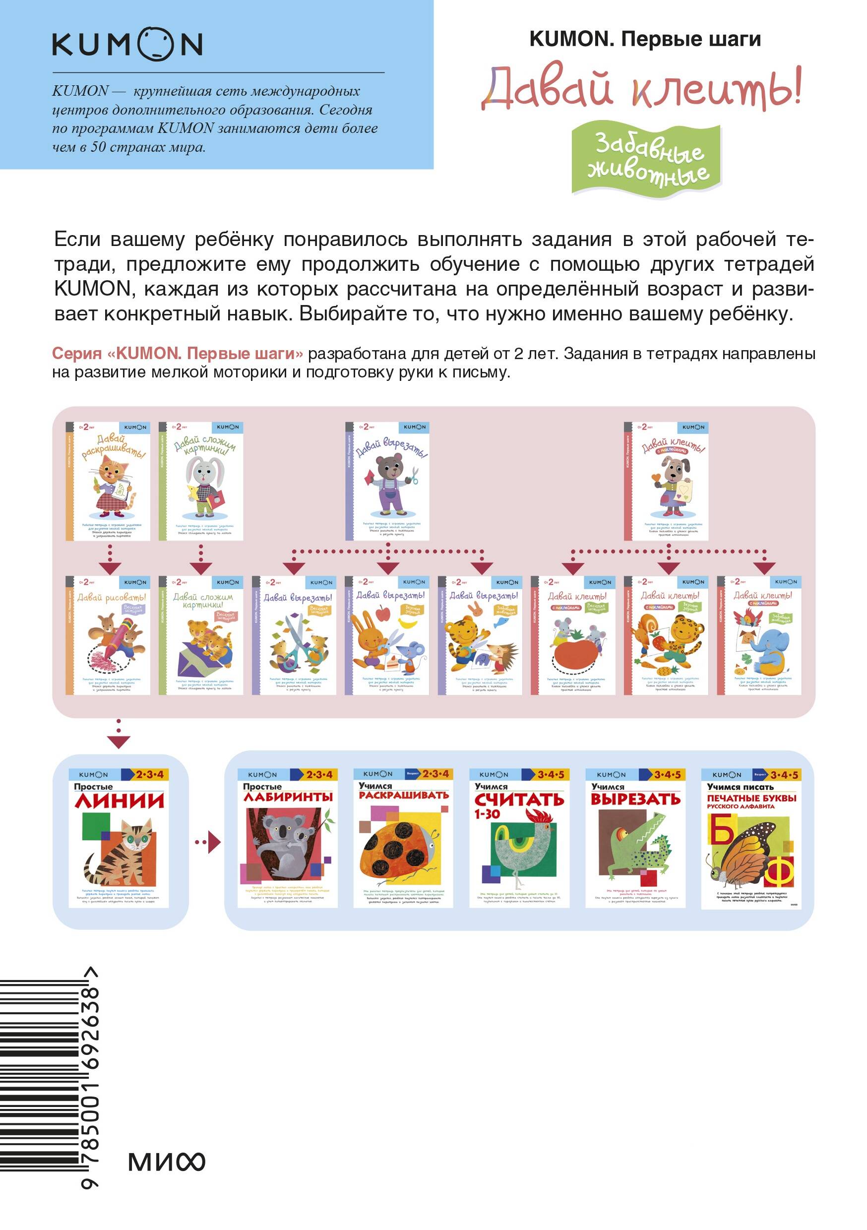 "Давай клеить! Забавные животные" - это рабочая тетрадь для развития мелкой моторики, чувства цвета, пространственного мышления и творческих способностей. Выполняя задания, ребёнок научится приклеивать на картинку детали разных размеров и формы. Тетрадь предназначена для занятий с детьми от двух лет.| Издательство | Манн, Иванов и Фербер |
