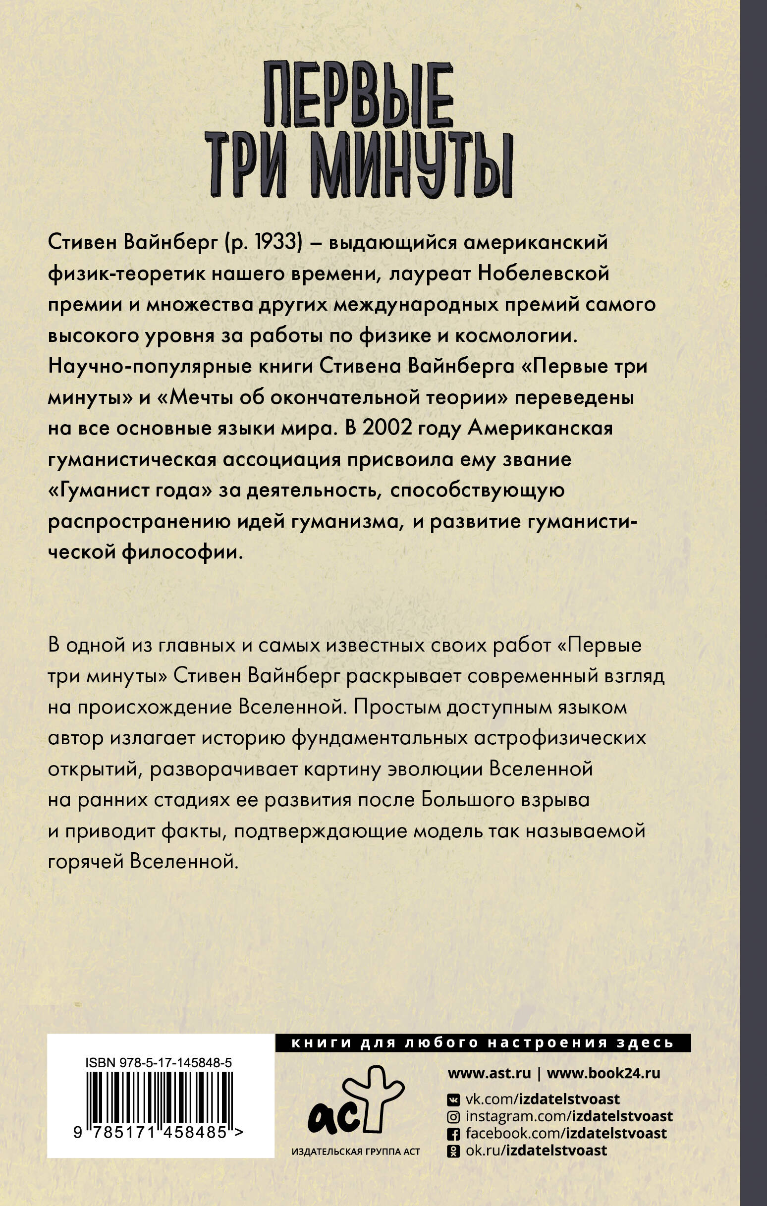 Стивен Вайнберг (р. 1933) - выдающийся американский физик-теоретик нашего времени, лауреат Нобелевской премии и множества других международных премий самого высокого уровня за работы по физике и космологии. Научно-популярные книги Стивена Вайнберга "Первые три минуты" и "Мечты об окончательной теории" переведены на все основные языки мира. В 2002 году Американская гуманистическая ассоциация присвоила ему звание "Гуманист года" за деятельность, способствующую распространению идей гуманизма и развитие гуманистической философии. В одной из главных и самых известных своих работ "Первые три минуты" Стивен Вайнберг раскрывает современный взгляд на происхождение Вселенной. Простым доступным языком автор излагает историю фундаментальных астрофизических открытий, разворачивает картину эволюции Вселенной на ранних стадиях ее развития после "большого взрыва" и приводит факты, подтверждающие модель так называемой "горячей" Вселенной.| Издательство | ИЗДАТЕЛЬСТВО "АСТ" |