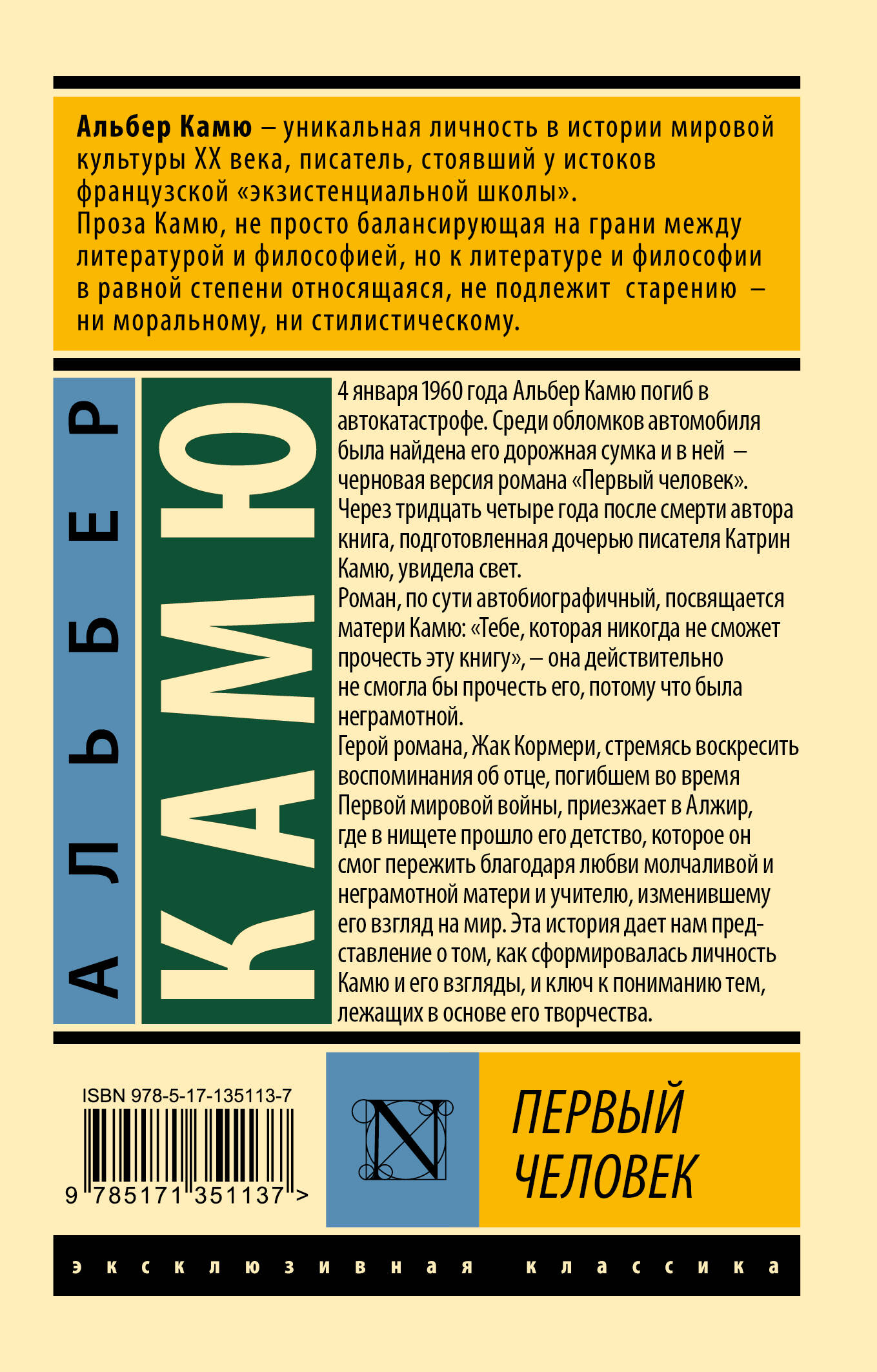 4 января 1960 года Альбер Камю погиб в автокатастрофе. Среди обломков автомобиля была найдена его дорожная сумка и в ней - черновая версия романа "Первый человек". Через тридцать четыре года после смерти автора книга, подготовленная дочерью писателя Катрин Камю, увидела свет. Роман, по сути автобиографичный, посвящается матери Камю: "Тебе, которая никогда не сможет прочесть эту книгу", - она действительно не смогла бы прочесть его, потому что была неграмотной. Герой романа, Жак Кормери, стремясь воскресить воспоминания об отце, погибшем во время Первой мировой войны, приезжает в Алжир, где в нищете прошло его детство, которое он смог пережить благодаря любви молчаливой и неграмотной матери и учителю, изменившему его взгляд на мир. Эта история дает нам представление о том, как сформировалась личность Камю и его взгляды, и ключ к пониманию тем, лежащих в основе его творчества.| Издательство | ИЗДАТЕЛЬСТВО "АСТ" |