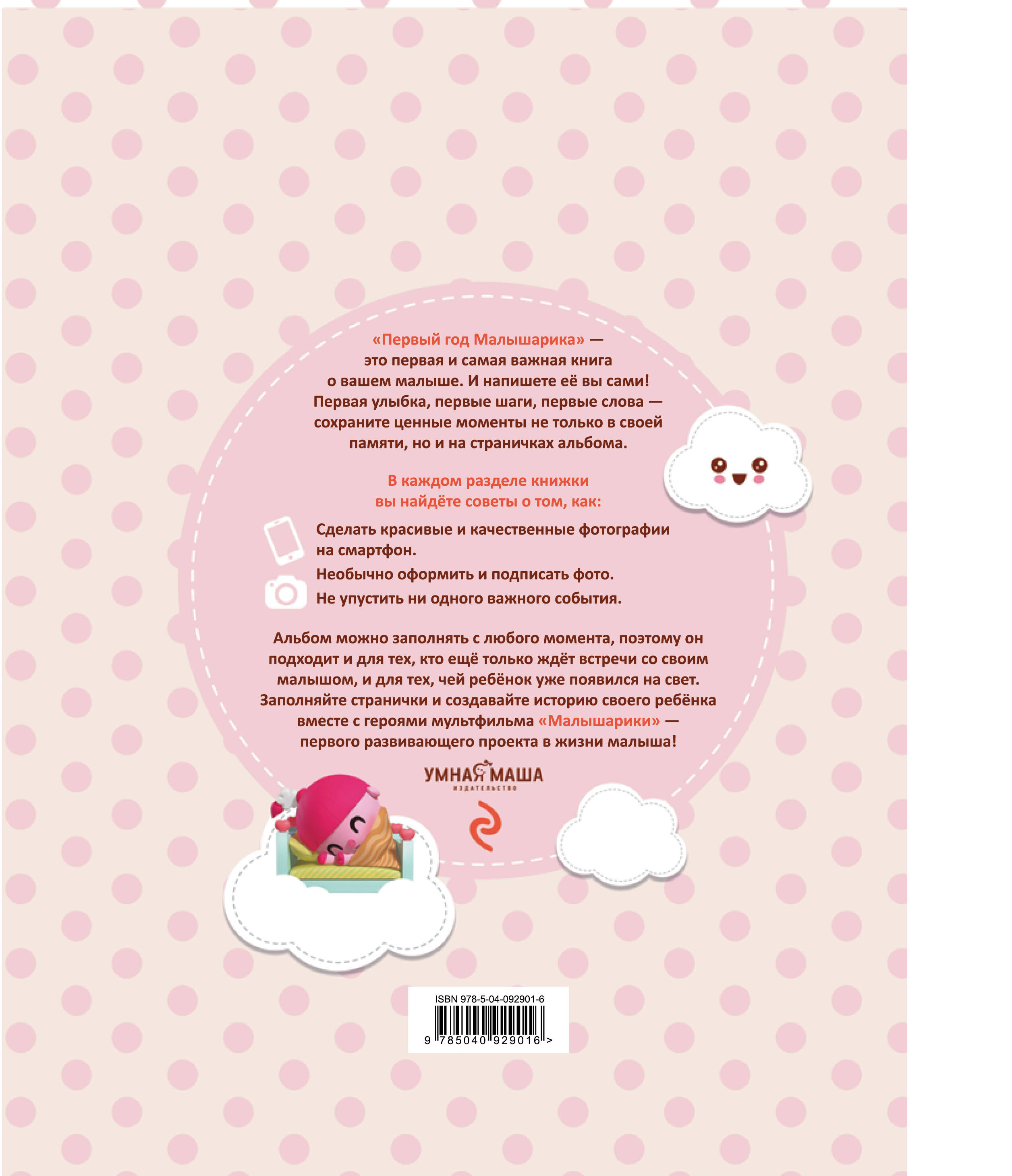 О проекте «Малышарики» - это обучающий и развивающий мультфильм для малышей, продолжение знаменитого проекта «Смешарики», который стал не менее популярным у ребят от 0 до 4 лет. Каждый мультфильм на канале Youtube, на который подписано около 300 тысяч человек, имеет десятки и сотни тысяч просмотров, и транслируется на телеканалах «Карусель» и «Мульт». Жанр Альбом для фотографий и записей. О книге «Первый год Малышарика. Альбом счастливых мгновений» - это красочный и яркий альбом, куда родители могут вклеивать фотографии своего ребенка, а также записывать все, что с ним происходит. Как он родился, кто придумал ему имя, как менялся его вес и рост на протяжении первого года, как ласково зовут его бабушки и дедушки, кому он первому улыбнулся, когда сел и когда пошел. Любимые и узнаваемые персонажи мультфильма подскажут, что лучше всего запечатлеть в этом нежном возрасте и как делать качественные фотографии, выстраивать кадр, интересно фотографировать малыша, как необычно оформить и подписать их и как не упустить ни одного важного события. Особенности Альбом «Первый год Малышарика» выполнен в стилистике мультфильма, преимущественно в пастельных тонах, рекомендованных детскими психологами. Кроме того, он выходит в двух оформлениях: розовом и салатовом, на пружине, а внутри милые наклейки с изображениями персонажей любимого сериала.| Издательство | ООО "Издательство "Эксмо" |