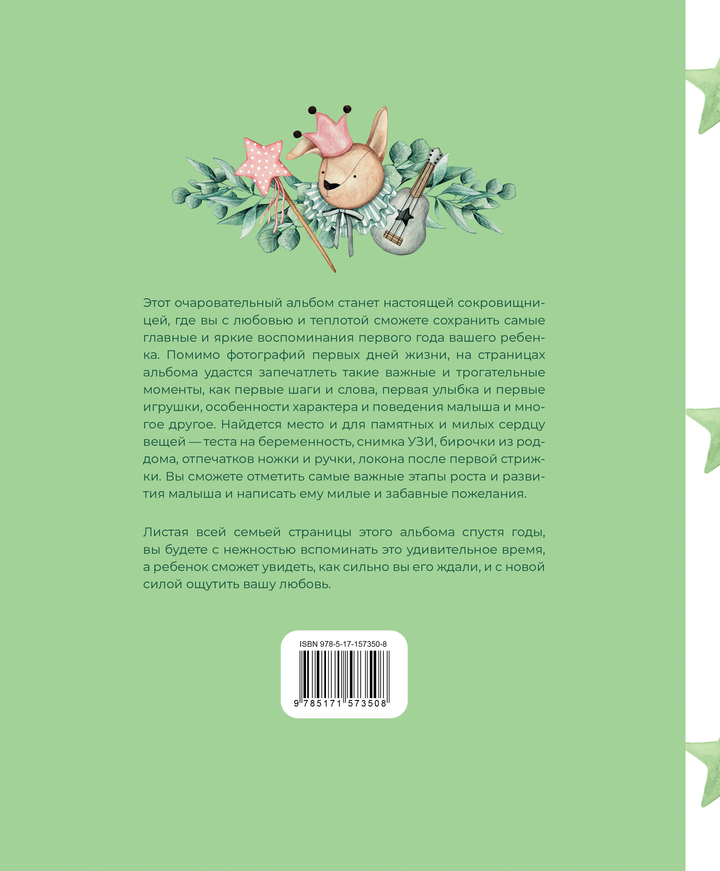 Этот очаровательный альбом станет настоящей сокровищницей, где вы с любовью и теплотой сможете сохранить самые главные и яркие воспоминания первого года вашего ребенка. Помимо фотографий первых дней жизни, на страницах альбома удастся запечатлеть такие важные и трогательные моменты, как первые шаги и слова, первая улыбка и первые игрушки, особенности характера и поведения малыша и многое другое. Найдется место и для памятных и милых сердцу вещей - теста на беременность, снимка УЗИ, бирочки из роддома, отпечатков ножки и ручки, локона после первой стрижки. Вы сможете отметить самые важные этапы роста и развития малыша и написать ему милые и забавные пожелания. Листая всей семьей страницы этого альбома спустя годы, вы будете с нежностью вспоминать это удивительное время, а ребенок сможет увидеть, как сильно вы его ждали, и с новой силой ощутить вашу любовь.| Издательство | Издательство "АСТ" |