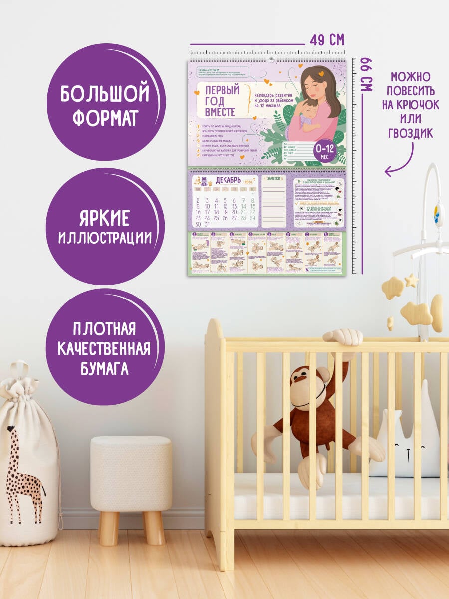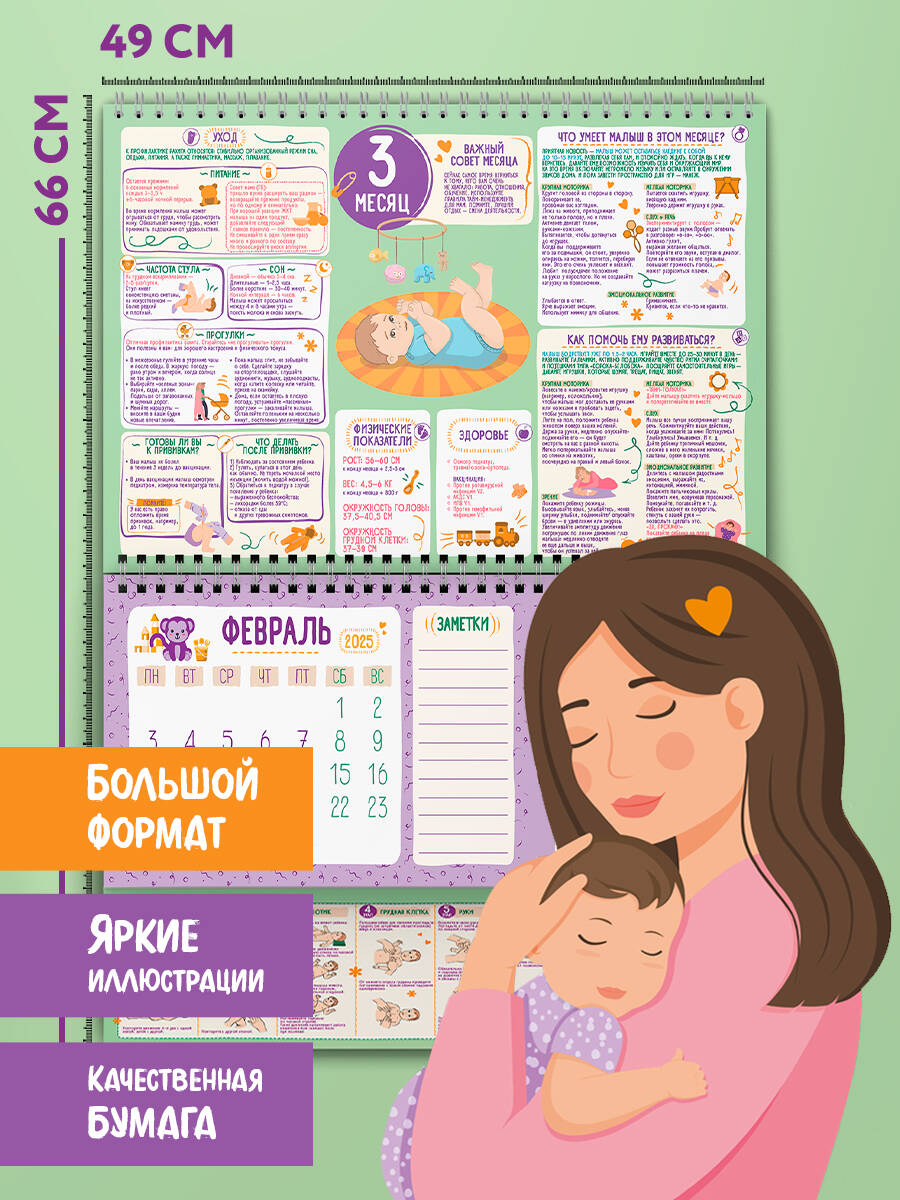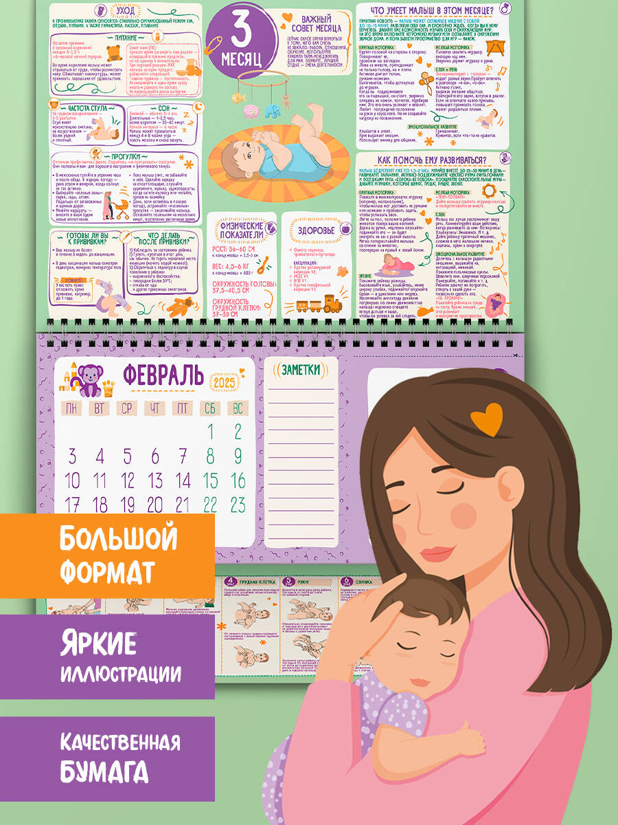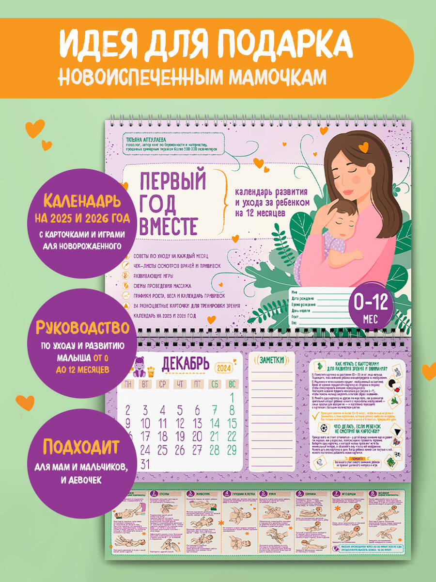 Боитесь, что не справитесь с ролью мамы? Кажется, что упускаете самое важное в развитии вашего малыша? Хотите перестать беспокоиться и превратить ваш первый год в самый счастливый период? Этот календарь - подробное руководство на первые 12 месяцев жизни с вашим крохой. В нем собрана самая важная информация о том, как ухаживать за младенцем и развивать его навыки каждый месяц. Автор Татьяна Аптулаева, практикующий психолог, популярный автор книг по уходу за новорожденными и мама дочки Юли, составила для вас удобный справочник на каждый месяц жизни ребенка до года, в котором вы найдете ответы на самые важные вопросы: • Какие анализы нужно сдавать каждый месяц? • Каких врачей посещать? • Как растет и развивается ваш младенец? • Какой режим питания и сна является нормальным? • Когда у ребенка прорезываются первые зубки? • Когда можно вводить прикорм? КАЛЕНДАРЬ СОДЕРЖИТ: • Справочник по уходу за младенцем от 0 до 12 месяцев. • Список врачей и анализов. • Игры для развития ребенка. • Схемы массажа для новорожденного. • Нормы физического развития. • Графики роста, веса и прививок. • 24 карточки для развития зрения и внимания. • Календарь на 2025 и 2026 год. Вся информация отрецензирована кандидатом медицинских наук Юлией Дмитриевой и врачом-педиатром Анастасией Гостюхиной. Календарь станет идеальным подарком для мам с младенцами, родившимися до конца января 2026 года! «Данный календарь будет прекрасным дополнением к книгам и обучающим видео. Информация набрана из официальных научных источников, написана доступным языком и представлена очень наглядно. Яркие картинки и понятные схемы помогают разобраться, как малыш растет и развивается, а советы по моторному и речевому развитию будут всегда на виду». - ЮЛИЯ АНДРЕЕВНА ДМИТРИЕВА, руководитель Центра лечения целиакии, врач-гастроэнтеролог, к.м.н., доцент кафедры педиатрии им. ак. Г.Н. Сперанского РМАНПО «Рождение ребенка - не только радостное, но и волнительное событие для молодых родителей. Каждая страница календаря бережно создавалась автором с целью облегчения доступа к актуальной и проверенной информации по здоровью и развитию малыша. Очень важными являются и яркие советы-напоминания маме о важности времени для самой себя, ведь давно известно: спокойная мама - спокойный ребенок!» - АНАСТАСИЯ ДМИТРИЕВНА ГОСТЮХИНА, сотрудник Центра лечения целиакии, врач-педиатр, гастроэнтеролог, сотрудник кафедры педиатрии им. ак. Г.Н. Сперанского РМАНПО «Первый год жизни ребенка - самый важный для него, но самый сложный для матери. Потом станет легче, но эти 12 месяцев надо как-то пережить. Читать толстые книги по уходу за новорожденным, когда малыш уже появился и требует постоянной заботы и ухода, невозможно. А вот освоить формат календаря-шпаргалки с инфографикой и яркими карточками - куда проще и приятнее. В этом гиде-подсказке есть вся нужная информация для родителей ребенка от 0 до 12 месяцев. В нем вы найдете советы о том, как правильно ухаживать за новорожденным в разные месяцы его жизни и как его развивать. Когда и какие прививки делать. Когда у ребенка должны появиться первые зубы, когда он должен держать голову, садиться, ползать, улыбаться или сказать первое слово. Сколько младенец должен есть, спать и весить. Как наладить сон и питание ребенка, как купать и тренировать малыша и как делать массаж. В па