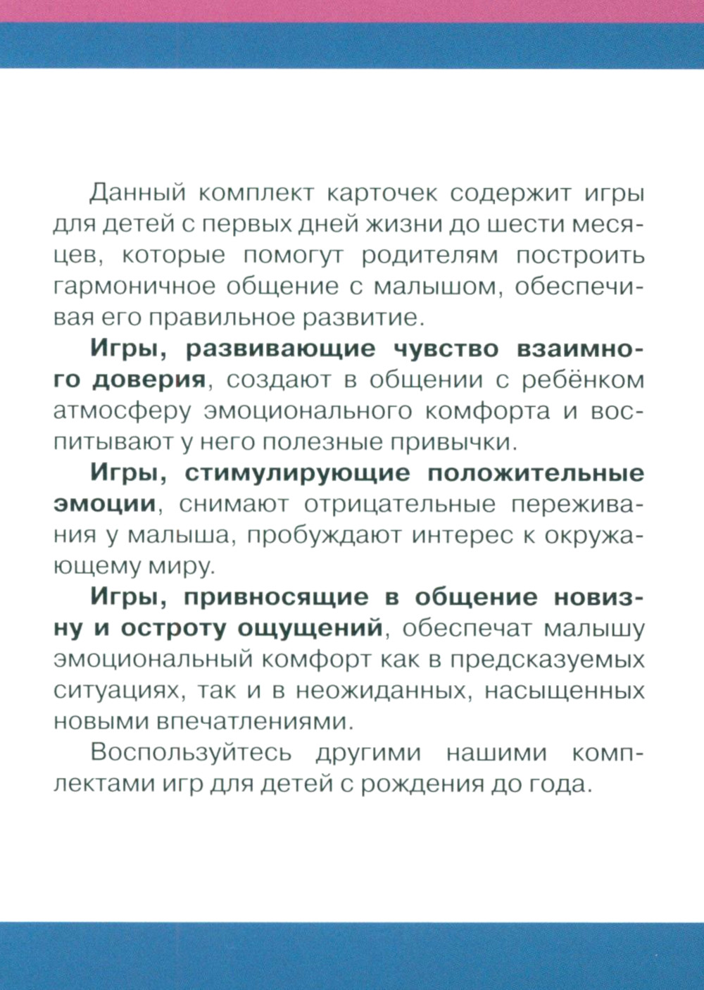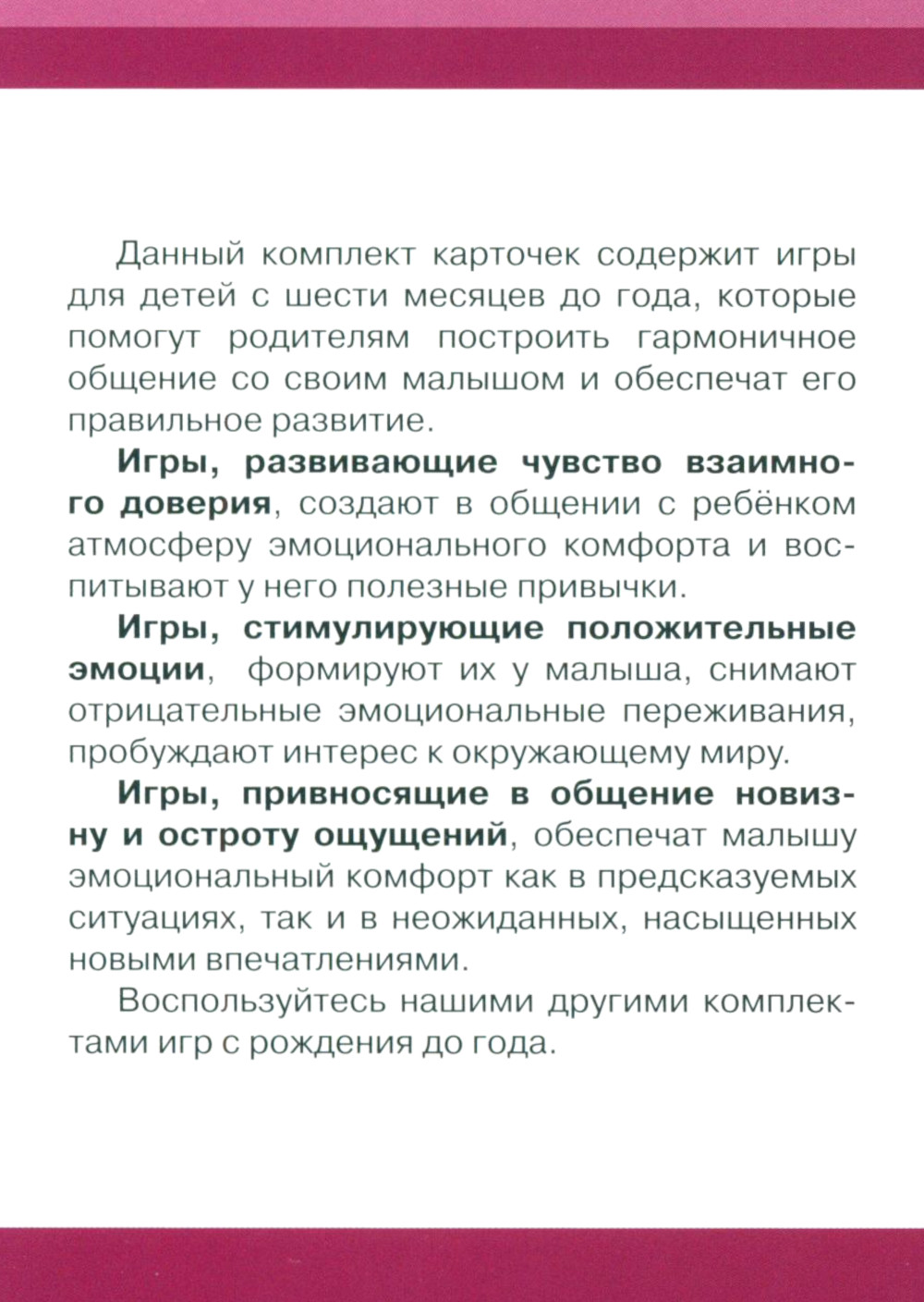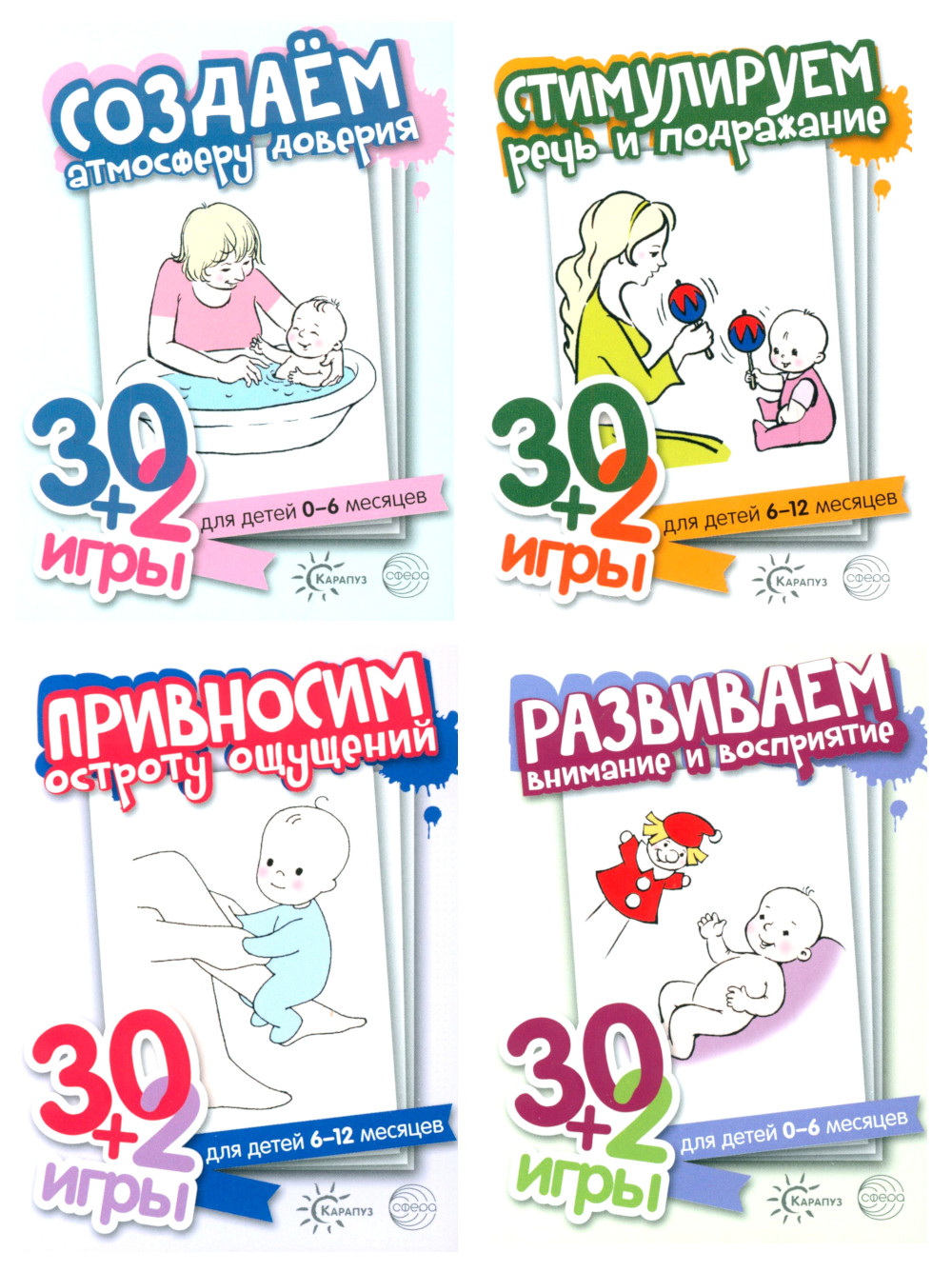 Комплект состоит из 4 книг: 1. 30+2 игры. Привносим остроту ощущений (32 карточки с описанием игр для детей 6-12 месяцев) 2. 30+2 игры. Развиваем внимание и восприятие (32 карточки с описанием игр для детей 0-6 месяцев) 3. 30+2 игры. Создаем атмосферу доверия (32 карточки с описанием игр для детей 0-6 месяцев) 4. 30+2 игры. Стимулируем речь и подражание (32 карточки с описанием игр для детей 6-12 месяцев)| Издательство | Творческий центр Сфера |