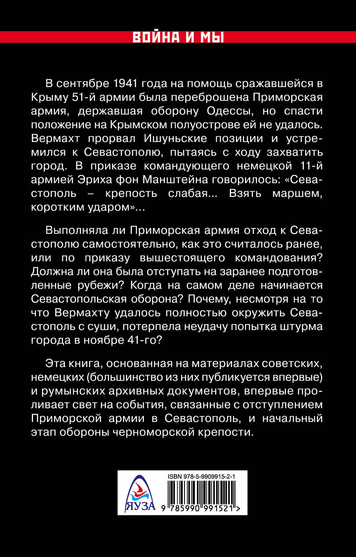 В сентябре 1941 года на помощь сражавшейся в Крыму 51-й армии была переброшена Приморская армия, державшая оборону Одессы, но спасти положение на Крымском полуострове ей не удалось. Вермахт прорвал Ишуньские позиции и устремился к Севастополю, пытаясь с ходу захватить город. В приказе командующего немецкой 11-й армией Эриха фон Манштейна говорилось: "Севастополь - крепость слабая... Взять маршем, коротким ударом"… Выполняла ли Приморская армия отход к Севастополю самостоятельно, как это считалось ранее, или по приказу вышестоящего командования? Должна ли она была отступать на заранее подготовленные рубежи? Когда на самом деле начинается севастопольская оборона? Почему, несмотря на то, что Вермахту удалось полностью окружить Севастополь с суши потерпела неудачу попытка штурма города в ноябре 41-го? Эта книга, основанная на материалах советских, немецких (большинство из них публикуется впервые) и румынских архивных документов, впервые проливает свет на события, связанные с отступлением Приморской армии в Севастополь и начальный этап обороны черноморской крепости.| Издательство | Издательство Яуза ООО |