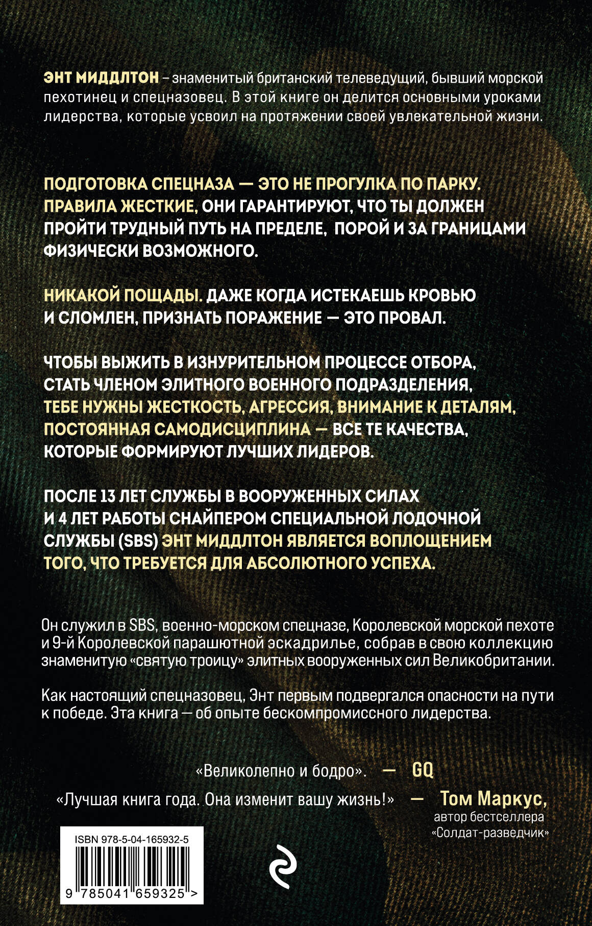 № 1 SUNDAY TIMES BESTSELLER. Энт Миддлтон - знаменитый британский телеведущий, бывший морской пехотинец и спецназовец. В этой книге он делится основными уроками лидерства, которые усвоил на протяжении своей увлекательной жизни. Подготовка спецназа - это не прогулка по парку. Правила жесткие, и они гарантируют, что ты должен пройти трудный путь на пределе, а порой и за границами физически возможного. Никакой пощады. Даже когда ты истекаешь кровью и сломлен, признать поражение - это провал. Чтобы выжить в изнурительном процессе отбора и стать членом элитного военного подразделения, тебе нужны жесткость, агрессия, внимание к деталям и постоянная самодисциплина - все те качества, которые формируют лучших лидеров. После 13 лет службы в вооруженных силах и 4 лет работы снайпером специальной лодочной службы (SBS) Энт Миддлтон является воплощением того, что требуется для абсолютного успеха. Он служил в SBS, военно-морском спецназе, Королевской морской пехоте и 9-й Королевской парашютной эскадрилье - собрав в свою коллекцию знаменитую «Святую троицу» элитных вооруженных сил Великобритании. Как настоящий спецназовец, Энт всегда первым подвергался опасности и добивался победы. Эта книга об опыте бескомпромиссного лидерства и успеха. ------------------------------------------------------------------------------------------------------------------------------------------ «Ошеломляющий бестселлер… обжигающий и честный». - Sunday Times «Живая и мотивирующая книга года». - Daily Mail «Великолепно и бодро». - GQ «Лучшая книга года. Она изменит вашу жизнь!» - Том Маркус, автор бестселлера «Солдат-разведчик»| Издательство | ООО "Издательство "Эксмо" |
