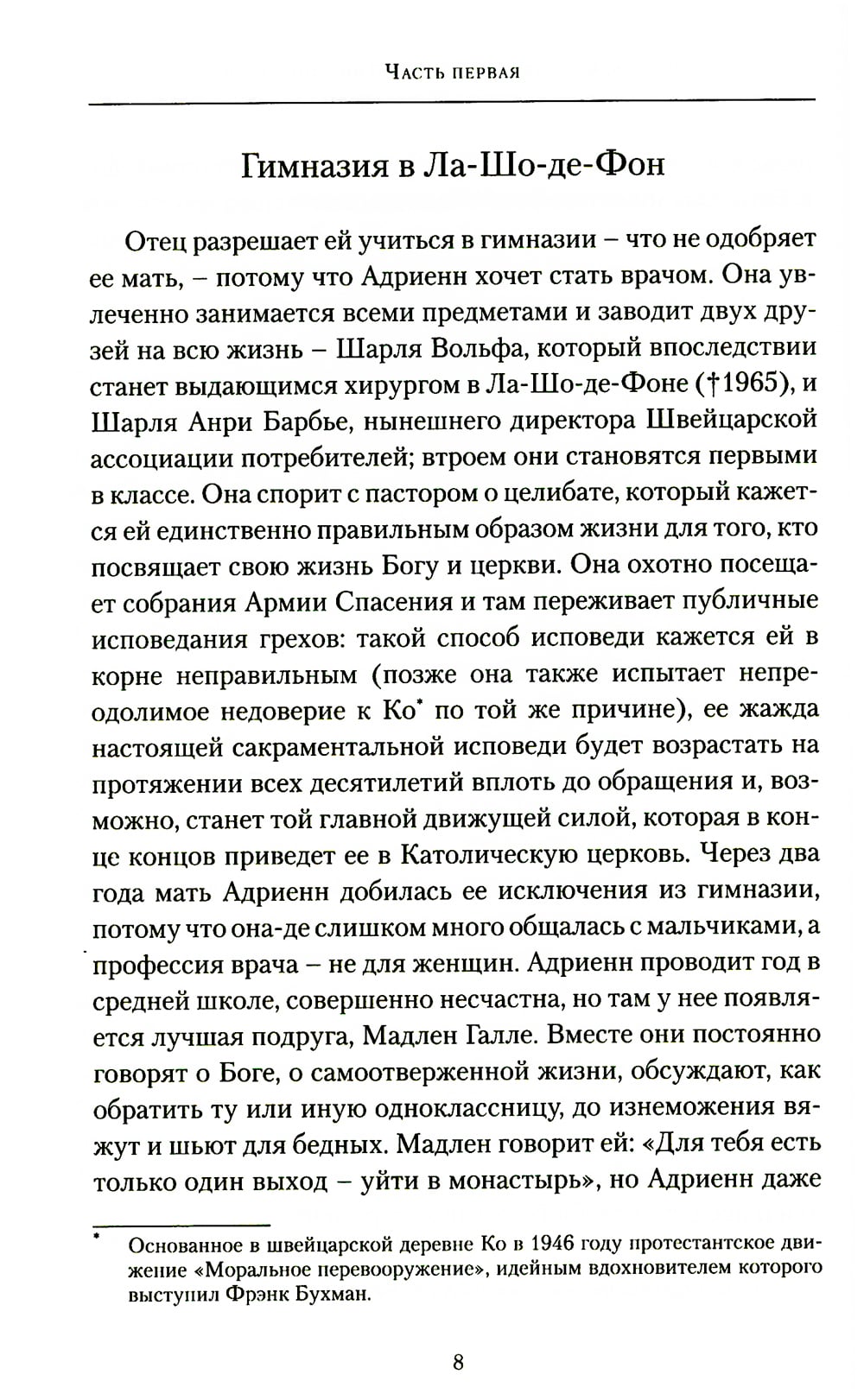 В течение двадцати семи лет Ганс Урс фон Бальтазар сотрудничал с богословом и мистиком Адриенн фон Шпайр, которая во многом повлияла на его богословскую мысль. Вместе с ней в 1944 году он основал общину св. ап. Иоанна Богослова. В первой части книги Бальтазар рассказывает о ее духовной биографии и уникальной личности, описывает их общую богословскую миссию, а также представляет обзор ее трудов, которых насчитывается около шестидесяти. Во второй части собраны яркие высказывания Адриенн о самой себе, с разных сторон освещающие ее индивидуальность, богословские идеи и духовные переживания. Третья часть книги объединяет молитвы фон Шпайр, которые отличаются особой живостью и образностью.| Издательство | Изд. ББИ |