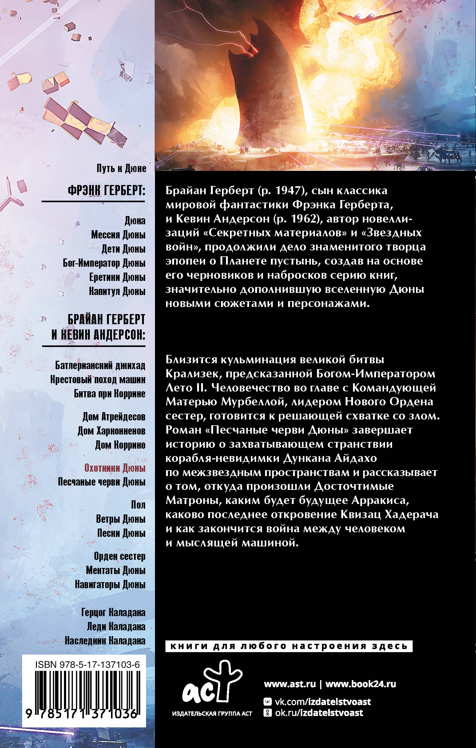Близится кульминация великой битвы Крализек, предсказанной Богом-Императором Лето II. Человечество во главе с Командующей Матерью Мурбеллой, лидером Нового Ордена сестер, готовится к решающей схватке со злом. Роман "Песчаные черви Дюны" завершает историю о захватывающем странствии корабля-невидимки Дункана Айдахо по межзвездным пространствам и рассказывает о том, откуда произошли Досточтимые Матроны, каким будет будущее Арракиса, каково последнее откровение Квизац Хадерача и как закончится война между человеком и мыслящей машиной.| Издательство | Издательство "АСТ" |
