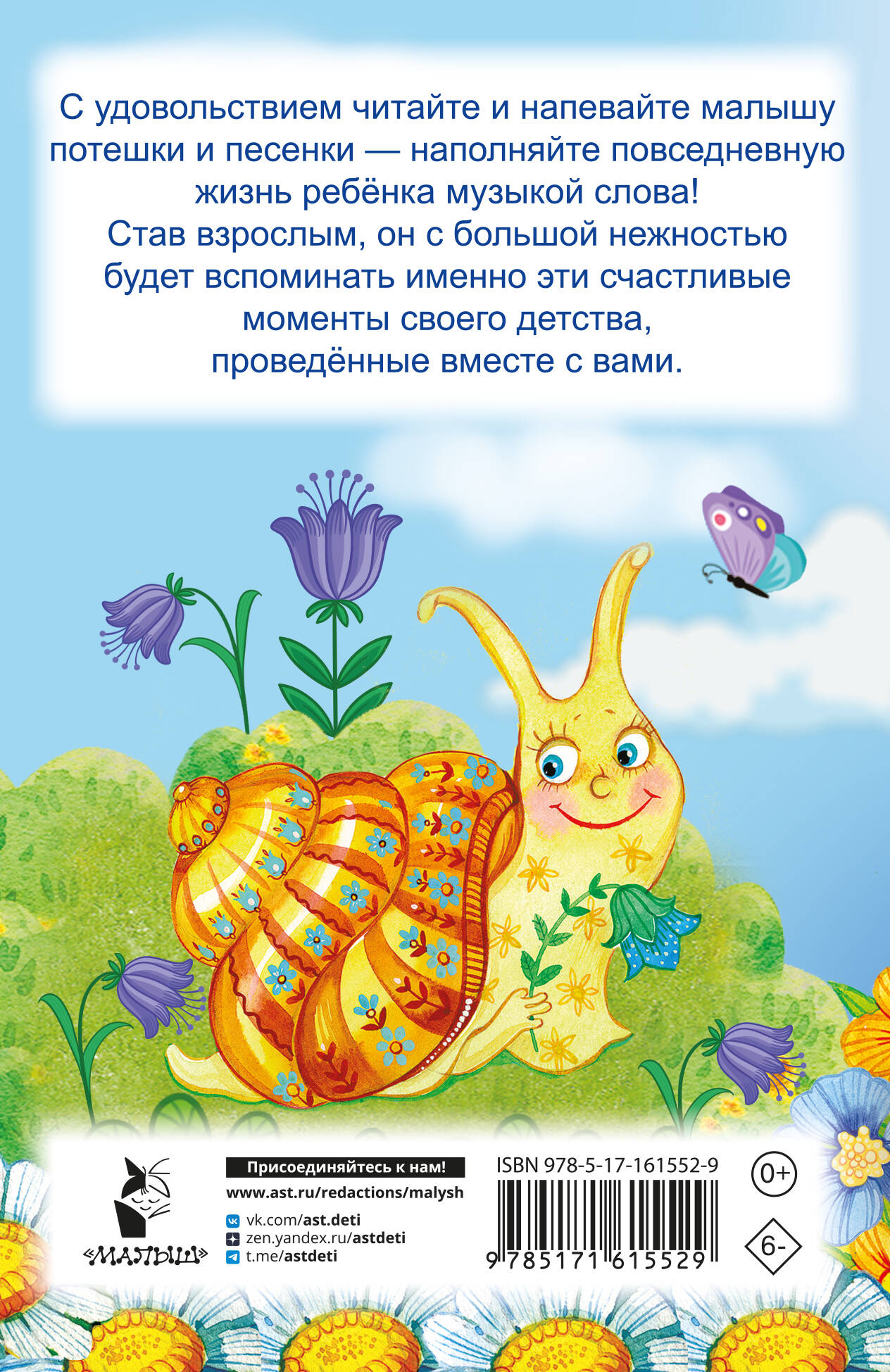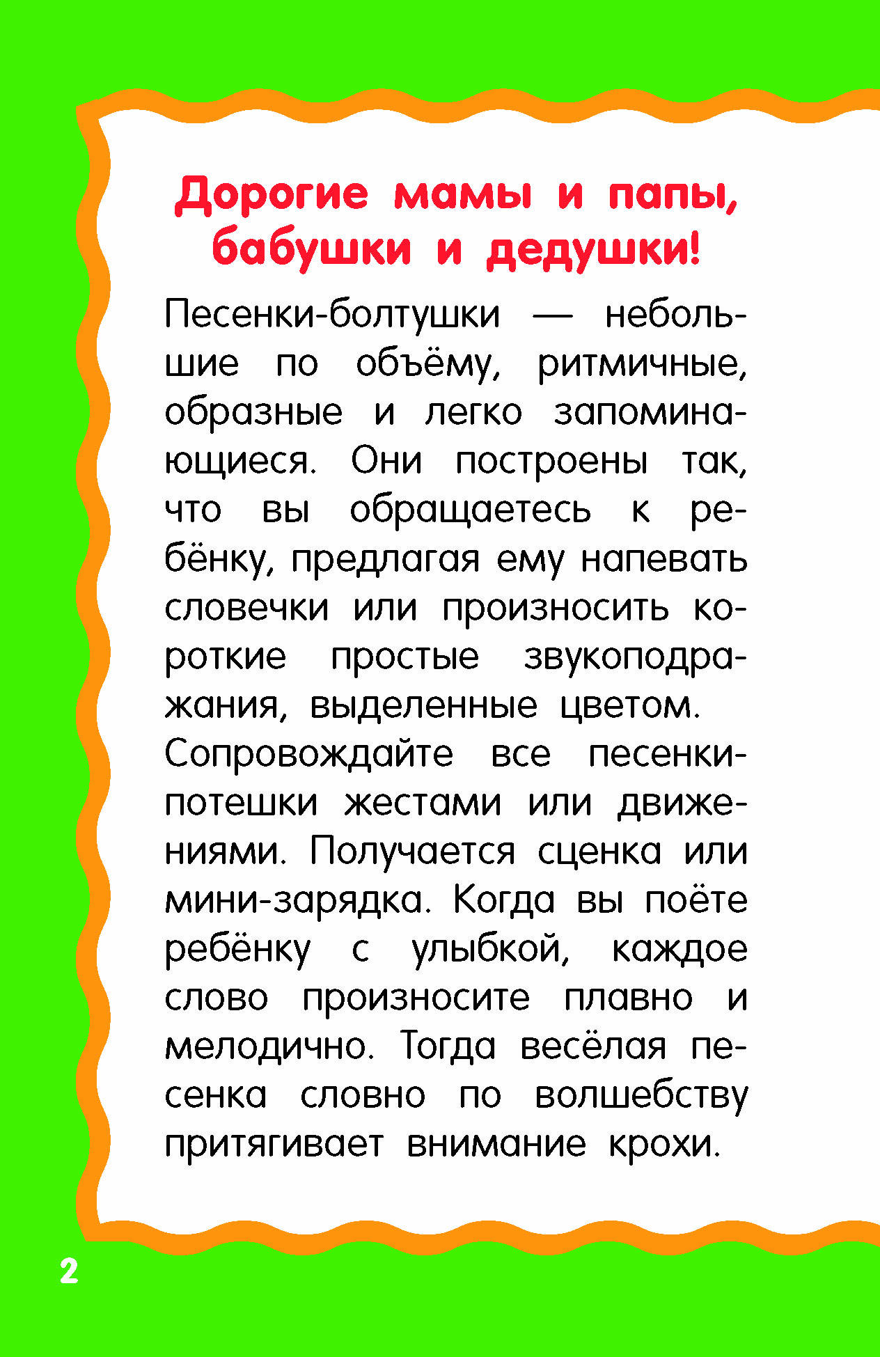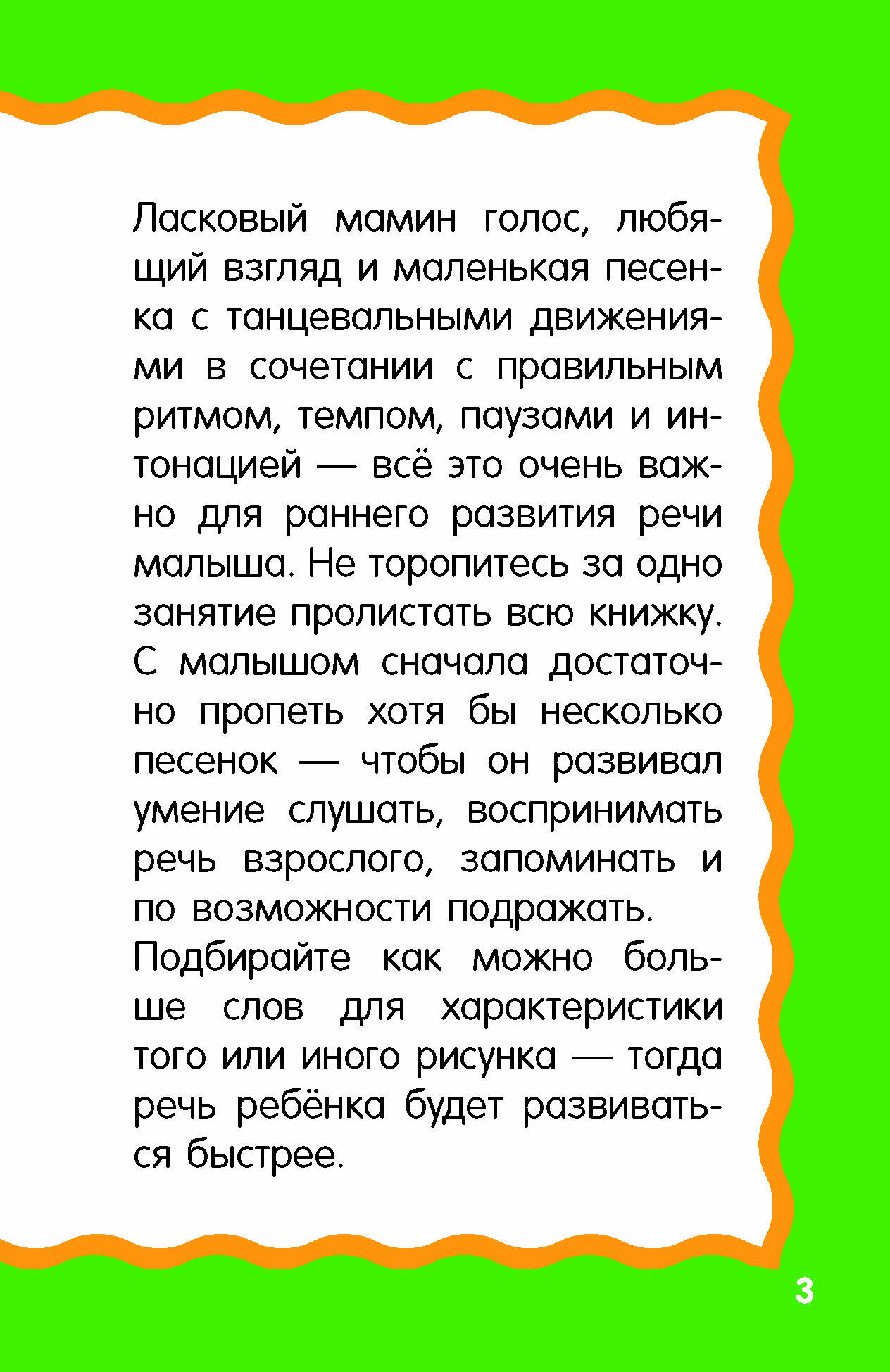 Каждая книжка этой серии - занимательная, полезная, красочная. Как без капризов собрать малыша на прогулку или уложить спать? На помощь заботливой маме придут песенки-болтушки - добрые и мелодичные, которые деткам обязательно понравится подпевать, хлопать в ладошки, топать, прыгать, танцевать, убаюкивать куклу. Ласковый мамин голос и весёлая песенка-игралочка развеселят малыша и подарят хорошее настроение. Пусть карапуз открывает замечательную книжку - и встречает новый день с улыбкой. Песенки-болтушки - добрые и весёлые, небольшие по объёму, чёткие по ритму, образные и легко запоминающиеся. Чем наполнены первые песенки для малыша? Конечно, маленькими сюжетами, знакомыми звукоподражаниями и короткими словами, которые малыш с удовольствием подпоёт маме. Рифмованные диалоги построены так, что взрослый обращается к ребёнку, предлагая ему спеть одно словечко или простую фразу. Иногда строчки песенки сопровождаются жестами или движениями - получается сценка или мини-зарядка. Повторять вслед за мамой слова песенки так здорово - это доставляет малышам радость и приносит огромную пользу. Ребёнок чисто выговаривает звуки, чётко и с выражением произносит каждое слово. Петь и танцевать обязательно понравится малышам, подвижные речевые игры помогут им вырасти добрыми и любознательными. Напевать малышу ритмичные и мелодичные песенки - известная методика раннего развития: • развиваем речь, мелкую моторику и координацию движений; • знакомим с окружающим миром, формируем познавательный интерес; • стимулируем логическое и образное мышление; • тренируем память, концентрацию внимания; • развиваем слуховое восприятие; • улучшаем эмоциональное состояние малыша.| Издательство | Издательство "АСТ" |
