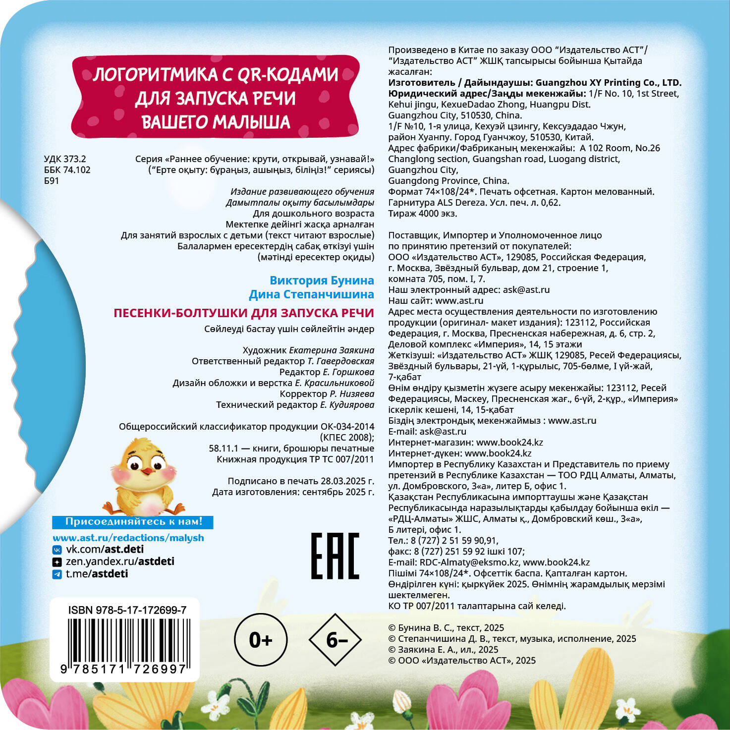 Красочная книга-игра, книга-подарок с окошками, колёсиками из плотного картона и простыми песенками по QR-кодам для запуска речи детей 1-3 лет - настоящая находка для заботливых родителей! Задания на выбор угощение для домашних животных, на поиски спрятавшихся малышей, а также логоритмические упражнения способствуют развитию речи, мышления, мелкой моторики рук, глазодвигательной координации, памяти и внимания. В процессе увлекательной игры с книгой, ребенок сможет сказать первые слова. Книга разработана на основе методики запуска речи опытного логопеда, нейрореабилитолога Виктории Буниной и талантилвого музыкального педагога, логопеда Дины Степенчишиной. Для детей до 3 лет.| Издательство | Издательство "АСТ" |