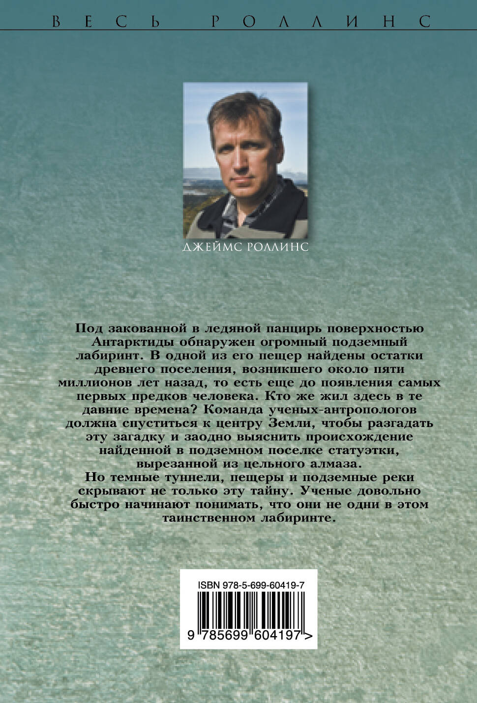 Под закованной в ледяной панцирь поверхностью Антарктиды обнаружен огромный подземный лабиринт. В одной из его пещер найдены остатки древнего поселения, возникшего около пяти миллионов лет назад, то есть еще до появления самых первых предков человека. Кто же жил здесь в те давние времена? Команда ученых-антропологов должна спуститься к центру Земли, чтобы разгадать эту загадку и заодно выяснить происхождение найденной в подземном поселке статуэтки, вырезанной из цельного алмаза. Но темные туннели, пещеры и подземные реки скрывают не только эту тайну. Ученые довольно быстро начинают понимать, что они не одни в этом таинственном лабиринте.| Издательство | Эксмо |