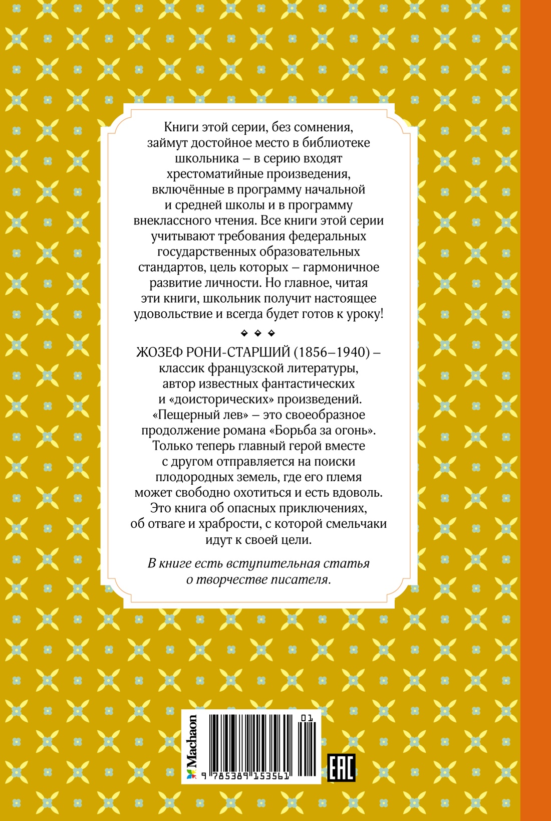 Уже ставший классическим роман известного французского писателя Жозефа Рони-Старшего из его «доисторического цикла». Повествование переносит читателя в эпоху каменного века, когда первобытные люди были вынуждены бороться за выживание. «Пещерный лев» - это своеобразное продолжение романа «Борьба за огонь», в котором читатель впервые знакомится с племенем уламров. Только теперь главный герой по имени Ун вместе с другом Зуром отправляется на поиски плодородных земель, где его племя может свободно охотиться на многочисленных животных и есть вдоволь. Автор ярко и увлекательно рассказывает об их опасных приключениях, об отваге и храбрости, с которой смельчаки идут к своей цели.| Издательство | Махаон |