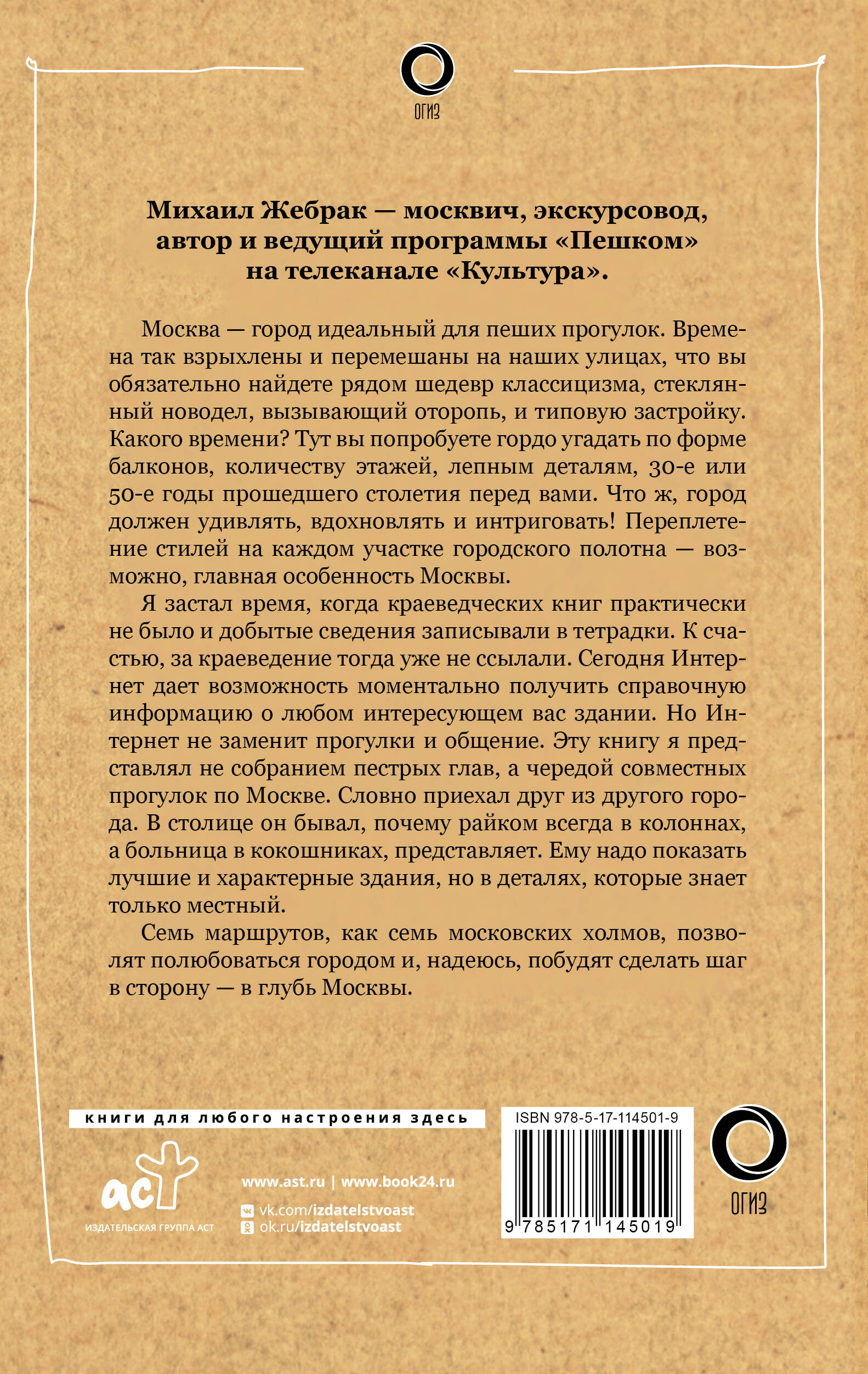 Михаил Жебрак - москвич, экскурсовод, автор и ведущий программы «Пешком» на телеканале «Культура». Узнавая с каждым годом все новые факты о достопримечательностях столицы, автор собрал свои любимые маршруты и показал лучшие и характерные здания, но в деталях, которые знает только местный. Семь маршрутов, как семь московских холмов, позволят полюбоваться городом. Читайте об архитектурных шедеврах и узнавайте занимательные истории о знаменитых жителях, рассматривайте фотографии. Надеемся, это побудит вас совершить прогулку. Для удобства, в начале каждой главы представлена подробная схема маршрута.| Издательство | ИЗДАТЕЛЬСТВО "АСТ" |