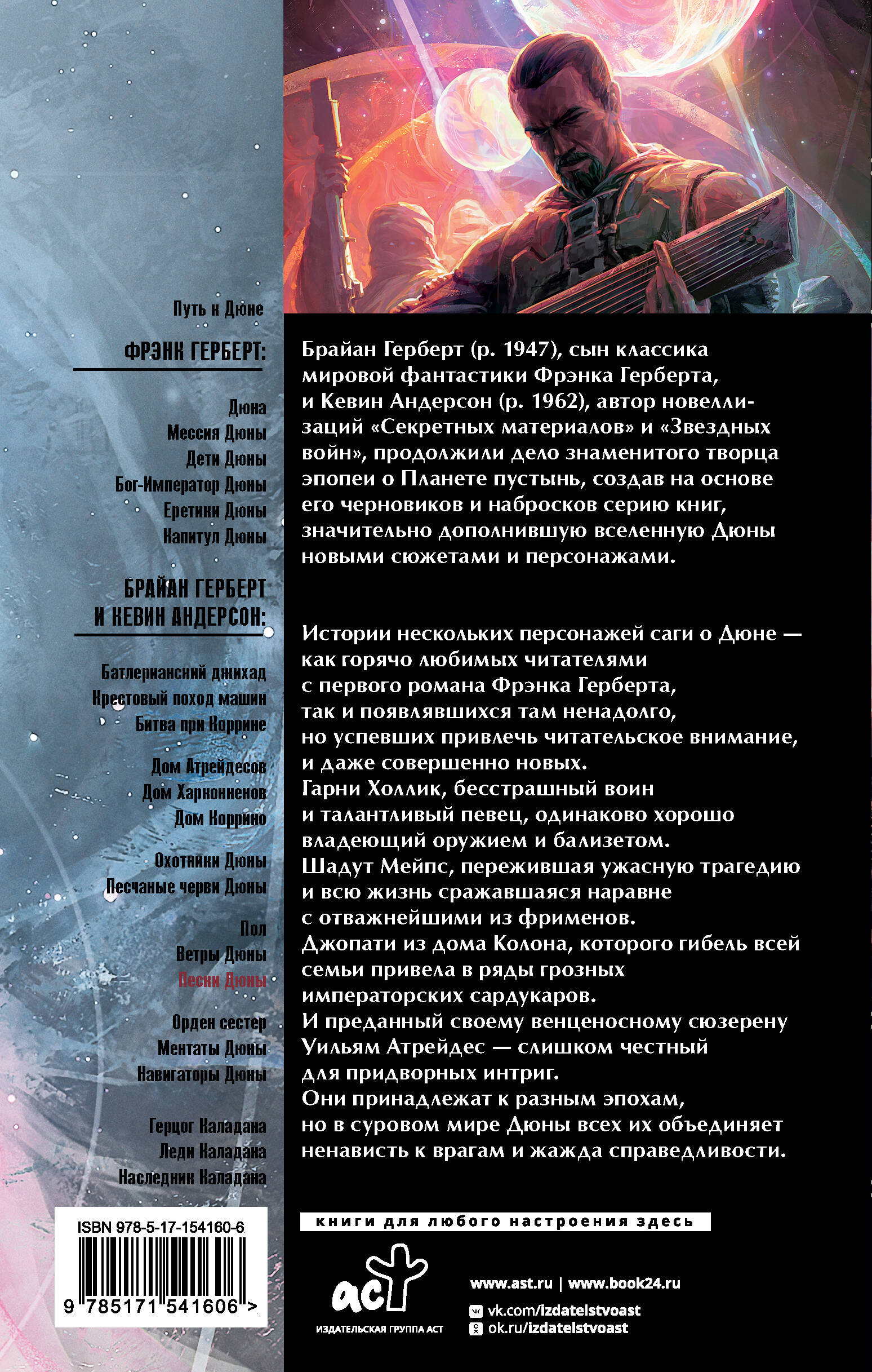 Истории нескольких персонажей саги о Дюне - как горячо любимых читателями с первого романа Фрэнка Герберта, так и появлявшихся там ненадолго, но успевших привлечь читательское внимание, и даже совершенно новых. Гарни Холлик, бесстрашный воин и талантливый певец, одинаково хорошо владеющий оружием и бализетом. Шадут Мейпс, пережившая ужасную трагедию и всю жизнь сражавшаяся наравне с отважнейшими из фрименов. Джопати из дома Колона, которого гибель всей семьи привела в ряды грозных императорских сардукаров. И преданный своему венценосному сюзерену Уильям Атрейдес - слишком честный для придворных интриг. Они принадлежат к разным эпохам, но в суровом мире Дюны всех их объединяет ненависть к врагам и жажда справедливости.| Издательство | ИЗДАТЕЛЬСТВО "АСТ" |