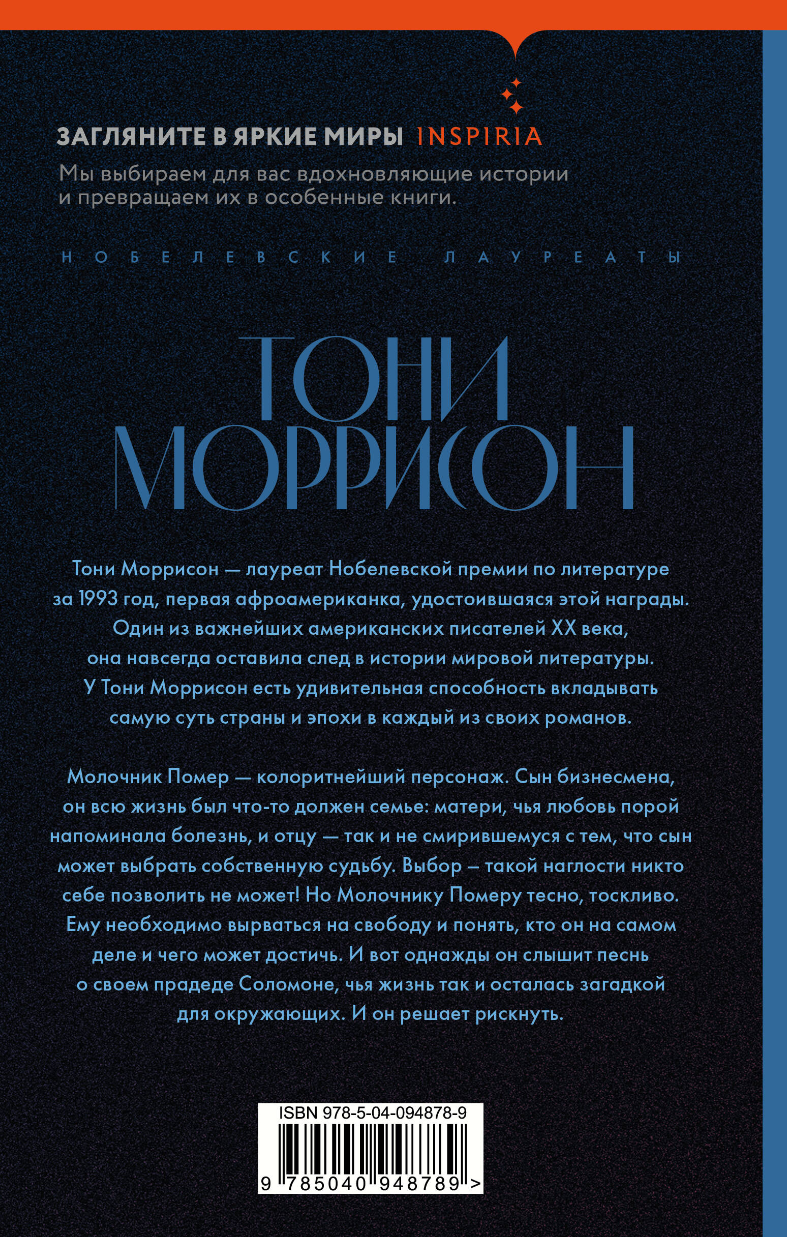 Тони Моррисон - уже классик, первая писательница-афроамериканка, которая была удостоена Нобелевской премии. Каждый ее роман - ярчайший представитель современной американской литературы, ведь сквозь историю и поэтику она рисует истинную судьбу человека. Молочник Помер - колоритнейший персонаж. Сын бизнесмена, он всю жизнь был что-то должен семье: матери, чья любовь порой напоминала болезнь, и отцу - так и не смирившемуся с тем, что сын может выбрать собственную судьбу. Выбор - такой наглости никто себе позволить не может! Но Молочнику Померу тесно, тоскливо. Ему необходимо вырваться на свободу и понять, кто он на самом деле и чего может достичь. И вот однажды он слышит песнь о своем прадеде Соломоне, чья жизнь так и осталась загадкой для окружающих. И он решает рискнуть. «Масштабный роман... многослойный и новаторский». - The New Yorker «Тони Моррисон оказалась в первом ряду современных американских писателей. Она написала роман, который выдержит испытание временем». - The Washington Post| Издательство | ООО "Издательство "Эксмо" |