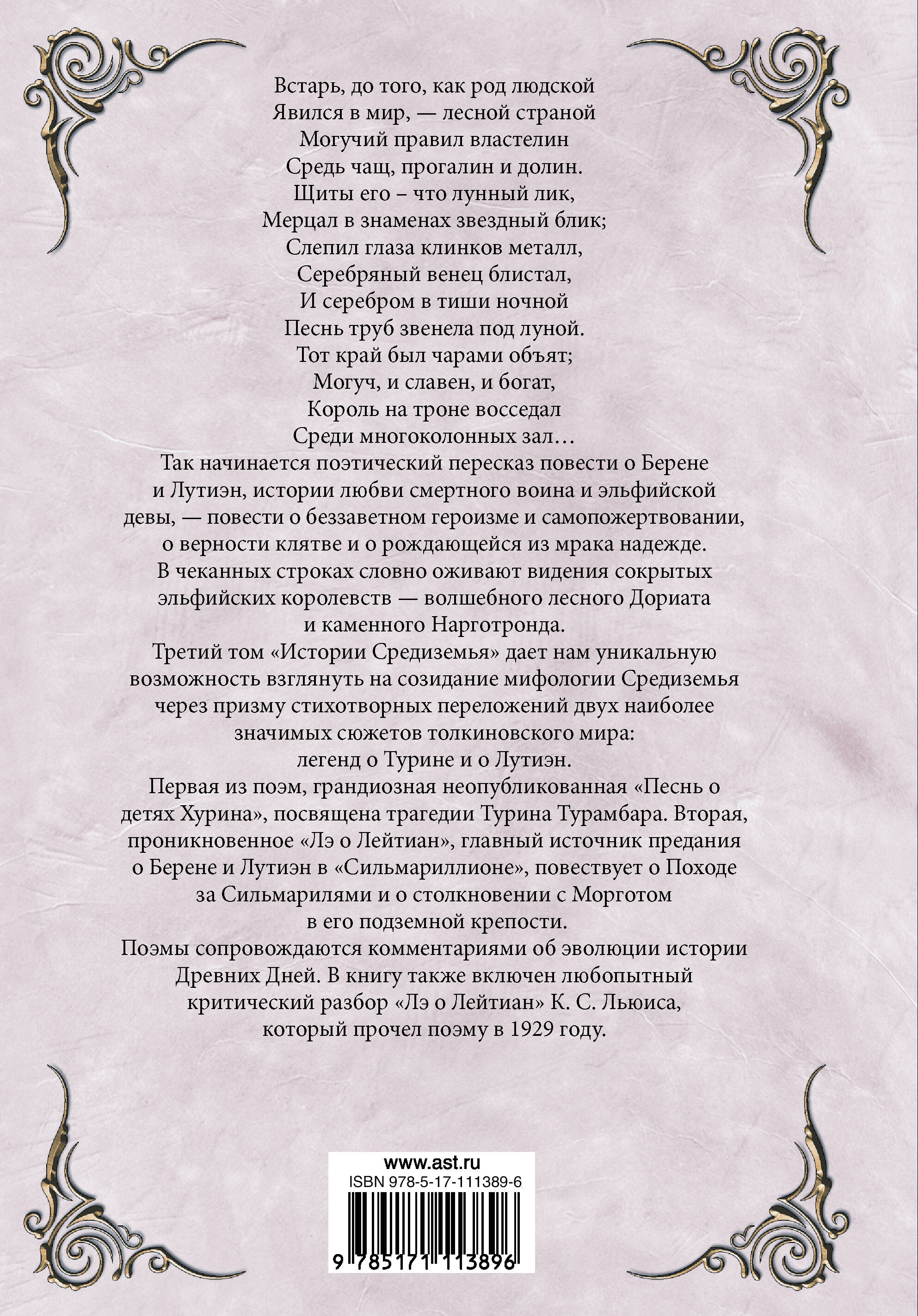 Третий том "Истории Средиземья" дает нам уникальную возможность взглянуть на созидание мифологии Средиземья через призму стихотворных переложений двух наиболее значимых сюжетов толкиновского мира: легенд о Турине и о Лутиэн. Первая из поэм, грандиозная неопубликованная "Песнь о детях Хурина", посвящена трагедии Турина Турамбара. Вторая, проникновенное "Лэ о Лейтиан", главный источник предания о Берене и Лутиэн в "Сильмариллионе", повествует о Походе за Сильмарилями и о столкновении с Морготом в его подземной крепости. Поэмы сопровождаются комментариями об эволюции истории Древних Дней. В книгу также включен любопытный критический разбор "Лэ о Лейтиан" К. С. Льюиса, который прочел поэму в 1929 году.| Издательство | ИЗДАТЕЛЬСТВО "АСТ" |