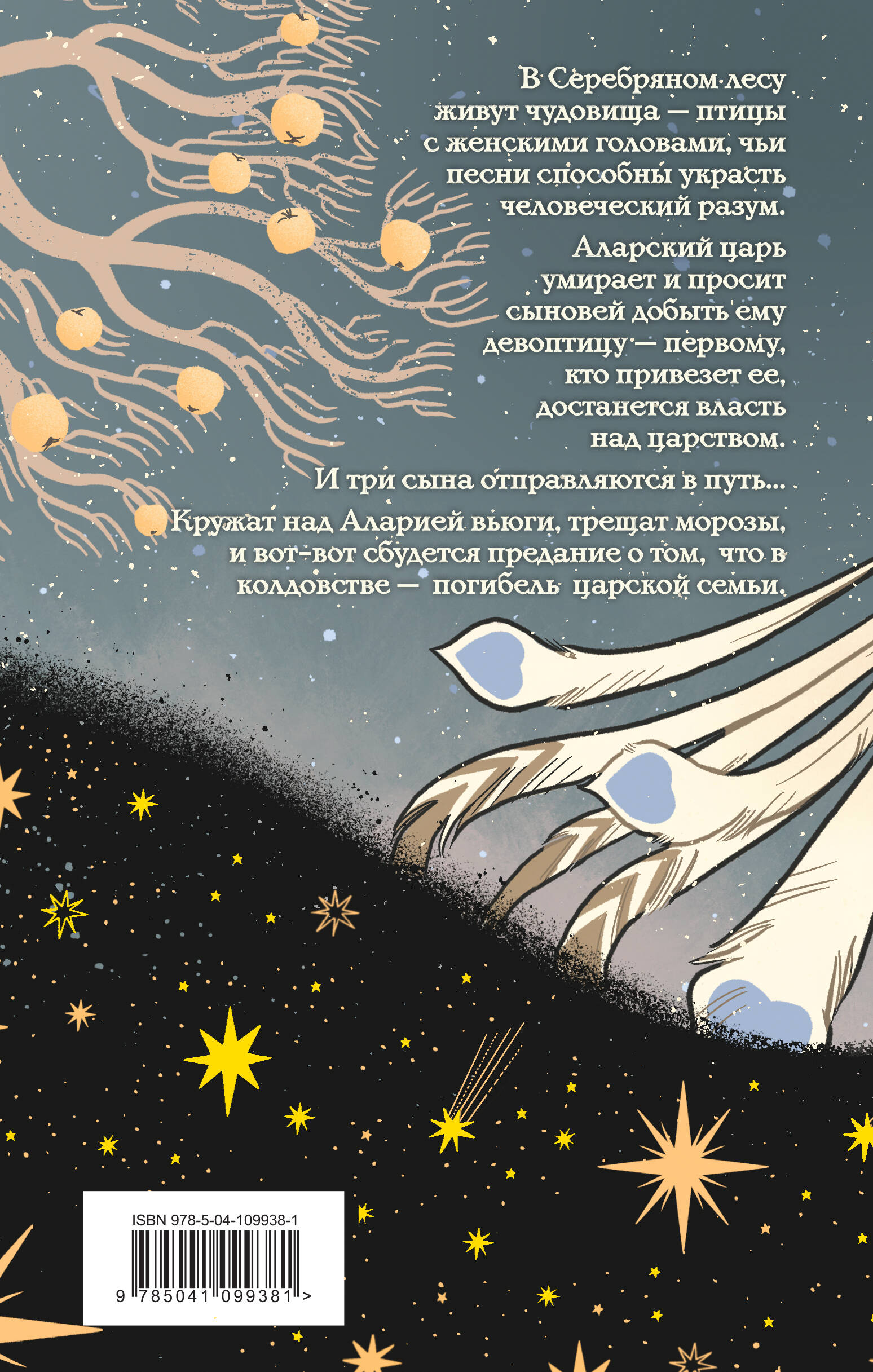 В Серебряном лесу живут чудовища - птицы с женскими головами, чьи песни способны украсть человеческий разум. Аларский царь умирает и просит сыновей добыть ему девоптицу - первому, кто привезёт чудовище, достанется власть над царством. Старший царевич Ружан готов пойти на всё, лишь бы занять место отца на престоле. Он жаждет отомстить колдунам Стрейвина за поражение, нанесённое его армии несколько лет назад. Средний, Домир, во всём потакает Ружану, пока однажды не осмеливается перейти ему дорогу, пленившись дивным пением. Младший царевич, Ивлад. не думает о власти, он лишь хочет исполнить последнее желание отца и отправляется в путь, несмотря на запрет покидать дворец. Кружат над Аларией вьюги, трещат морозы, и вот-вот сбудется предание о том, что в колдовстве - погибель царской семьи. «Песня чудовищ» - завораживающая сказка для взрослых. Актуальный жанр ретеллинга, в котором виртуозно переплетаются мягко стилизованное под легенду повествование и современные тенденции жанра славянского фэнтези. Анастасия Андрианова в своей истории возрождает мотивы сказок, вспоминая об удивительных созданиях, алконостах, птицах-сиринах, издревле присутствующих в фольклорных мотивах старой Руси. Обложка книги выполнена популярной художницей Вельгой Северной, а внутри издание дополнено иллюстрациями Зои Эклер и Юлии Бетехтиной.