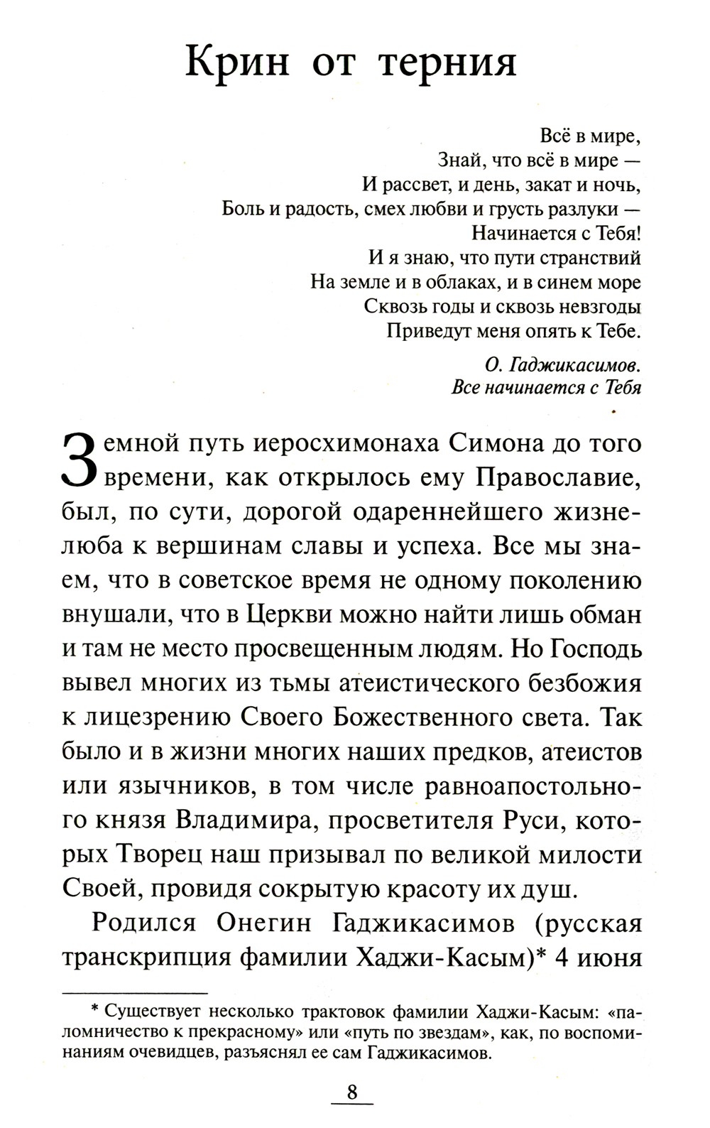 «В каждой строчке только точки после буквы "л"» - эти слова популярной в 70-80-е годы прошлого столетия песни знакомы многим, но мало кому известно, почему сейчас имя ее автора не звучит с эстрады. О необычной судьбе Онегина Гаджикасимова - советского поэта азербайджанского происхождения, а затем оптинского постриженника и миссионера иеросхимонаха Симона расскажет эта книга. В издание также вошли избранные беседы батюшки.| Издательство | Духовное преображение |