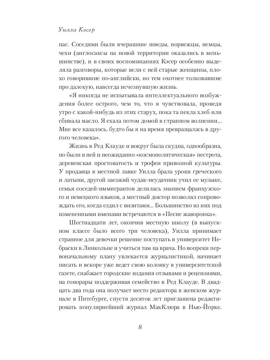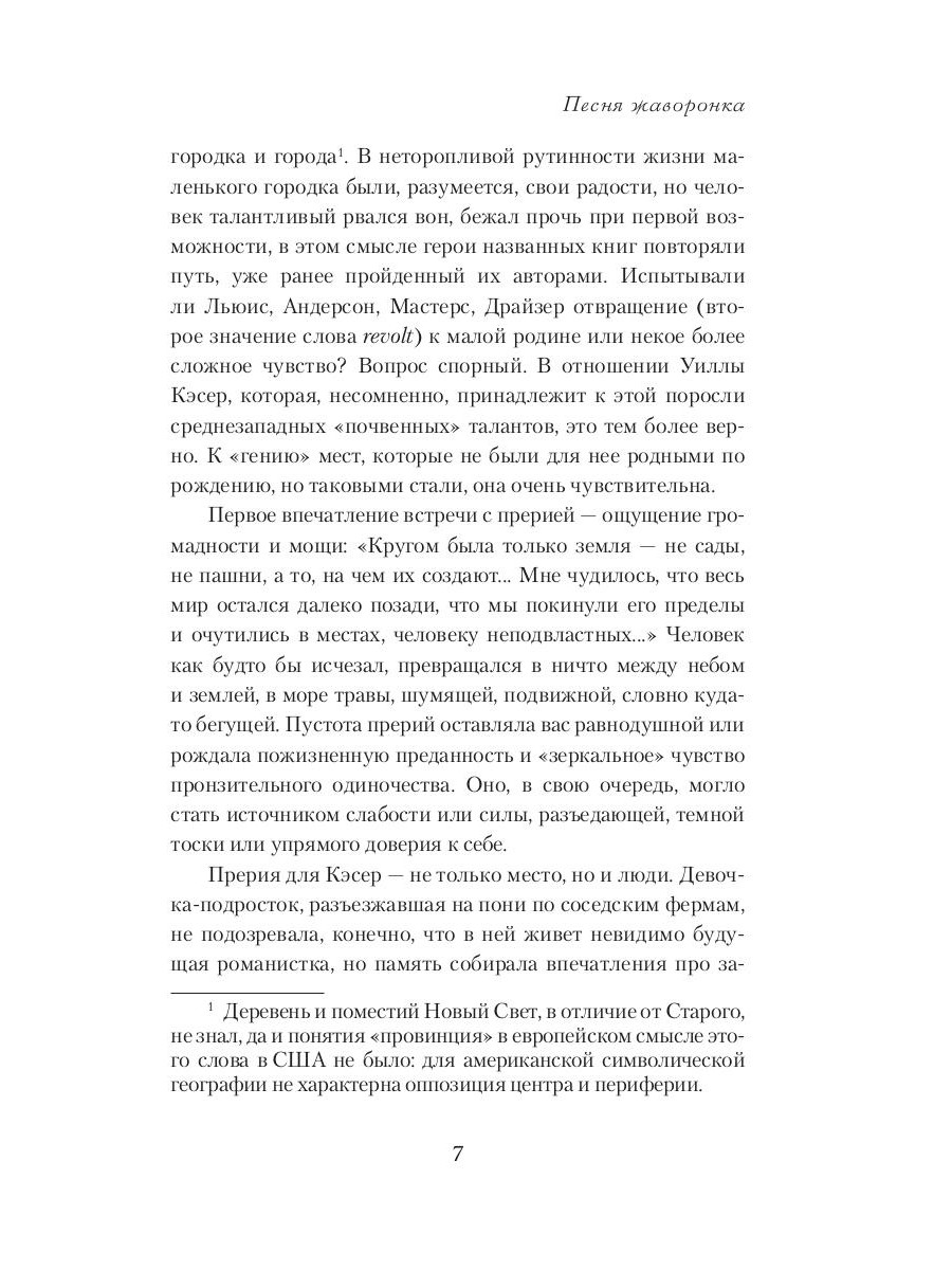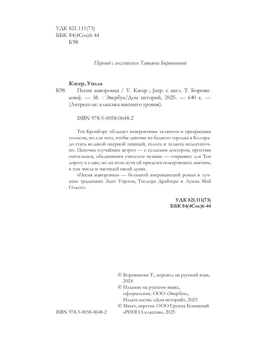 Тея Кронборг обладает невероятным талантом и прекрасным голосом, но для того, чтобы девочке из бедного городка в Колорадо стать великой оперной певицей, голоса и таланта недостаточно. Цепочка случайных встреч - с сельским доктором, простым скитальцем, обедневшим учителем музыки - открывает для Теи дорогу к славе, но на этом пути ей придется пожертвовать многим, в том числе и частицей своей души. «Песня жаворонка» - большой американский роман в лучших традициях Эдит Уортон, Теодора Драйзера и Луизы Мэй Олкотт.| Издательство | Дом историй |