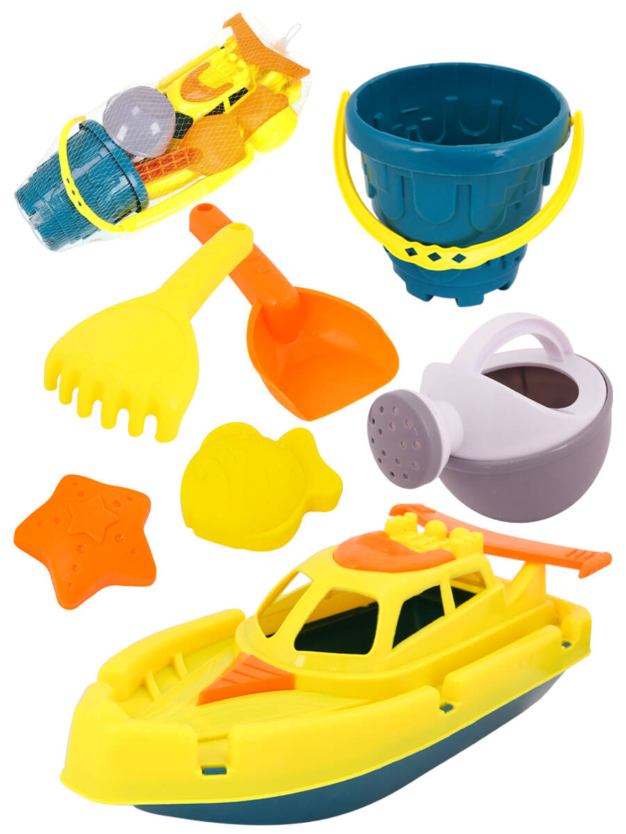 Песочный набор (лопатка, 2 формочки,лейка,ведерко,катер,в сетке)( Арт. ИК-2344)