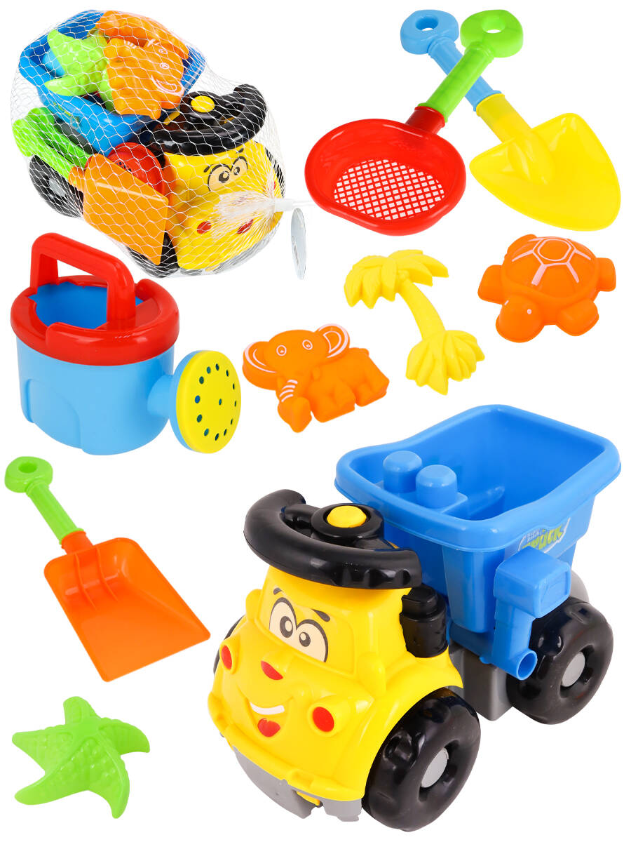 Песочный набор "Грузовик" (лейка,4 формочки,ситичко,грабли,лопатка,грузовик,в сетке) ( Арт. ИК-2341)