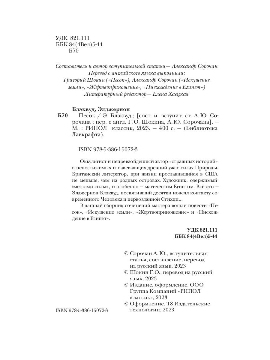 Оккультист и непревзойденный автор «страшных историй» о непостижимых и навевающих древний ужас силах Природы. Британский литератор, при жизни прославившийся в США не меньше, чем на родных островах. Художник, одержимый «местами силы», и особенно - магическим Египтом. Всё это - Элджернон Блэквуд, посвятивший десятки новелл контакту современного Человека и первозданной Стихии… В данный сборник сочинений мастера вошли повести «Песок», «Искушение земли», «Жертвоприношение» и «Нисхождение в Египет». «Дарование мистера Блэквуда бесспорно: еще никто с такой серьезностью и сверхъестественной интуицией не передавал странности обычных вещей и происшествий… Он заставляет читателя совершить переход из реального мира в мир видений». Говард Лавкрафт