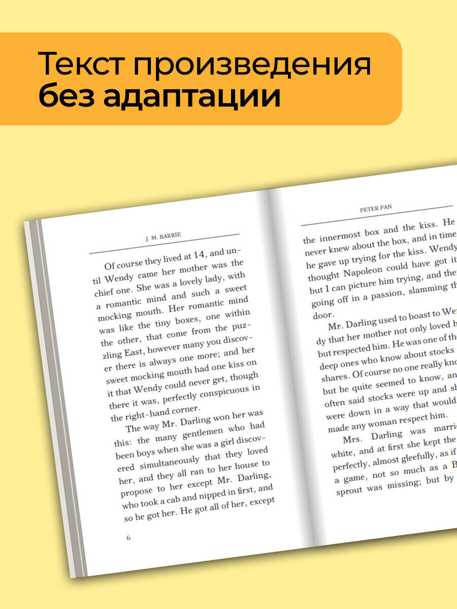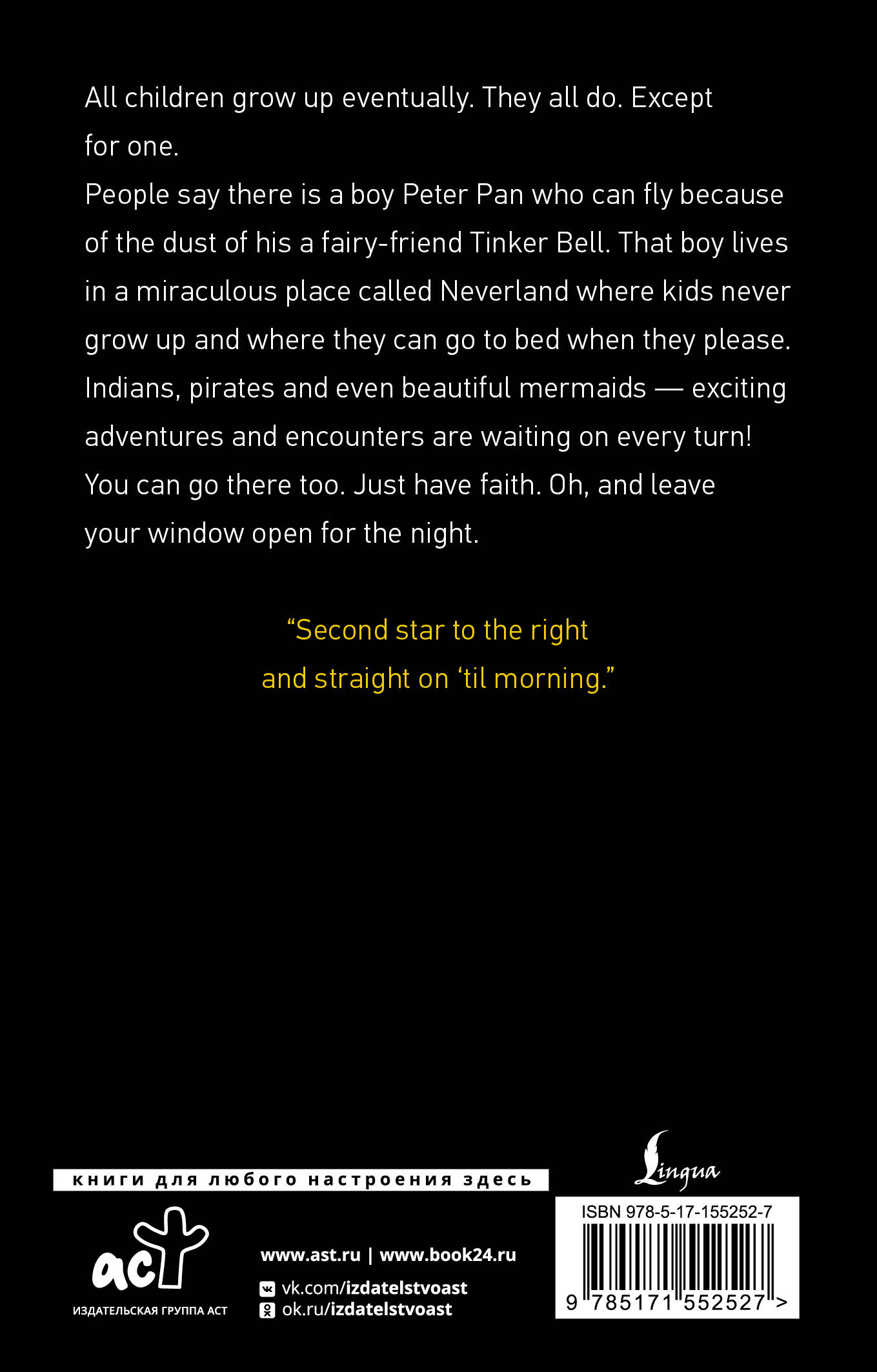 Джеймс Барри - шотландский драматург и романист, подаривший миру незабываемую историю о мальчике, который хотел навсегда остаться ребенком. Но как же так? Ведь все дети рано или поздно взрослеют. Да, все. Кроме одного. Перед сном родители рассказывают своим детям удивительную историю о мальчике по имени Питер Пен. Говорят, он умеет летать, благодаря волшебной пыльце феи Тинкер Белл. Живет Питер Пен в сказочной стране Неверленд, где дети никогда не взрослеют и ложатся спать, когда захотят. Где можно увидеть русалок, примкнуть к племени индейцев или сразиться с пиратами. Приключения ждут на каждом шагу! Вы тоже можете попасть туда. Главное - верить! И да, оставьте окно на ночь открытым. Книга издана в неадаптированной версии. Наслаждайтесь историей, покорившей сердца читателей по всему миру, в оригинале!| Издательство | ИЗДАТЕЛЬСТВО "АСТ" |