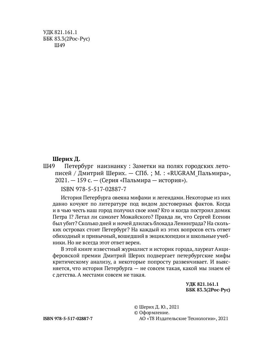 В этой книге известный журналист и историк города, лауреат Анциферовской премии Дмитрий Шерих подвергает петербургские мифы критическому анализу, а некоторые попросту развенчивает. И выясняется, что история Петербурга - не совсем такая, какой мы знаем её с детства. А местами совсем не такая.