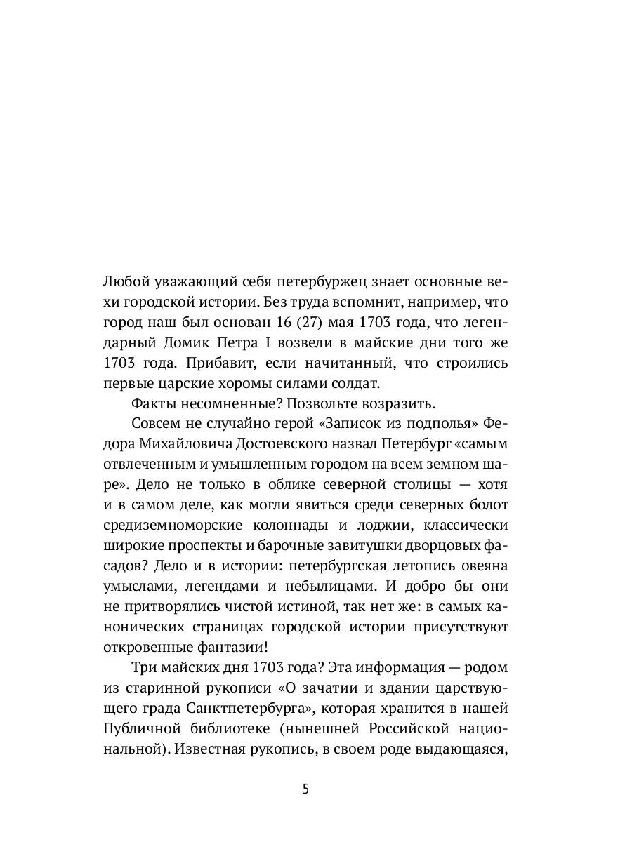 История Петербурга овеяна мифами и легендами. Некоторые из них давно кочуют по литературе под видом достоверных фактов. Когда и в чью честь наш город получил своё имя? Кто и когда построил домик Петра I? Летал ли самолёт Можайского? Правда ли, что Сергей Есенин был убит? Сколько дней и ночей длилась блокада Ленинграда? На скольких островах стоит Петербург? На каждый из этих вопросов есть ответ обиходный и привычный, вошедший в энциклопедии и школьные учебники. Но не всегда этот ответ верен.