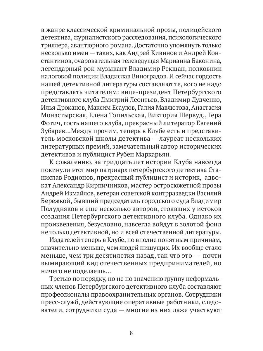 Книга представляет собой своего рода посвящение "Петербургскому детективному клубу", который уже более тридцати лет активно развивает школу детективно-приключенческого романа и организует вокруг себя сообщество профессиональных литераторов, мастеров криминальной публицистики, издателей, журналистов, а также действующих и бывших сотрудников криминальной полиции, адвокатов и представителей судебной системы. В сборнике "Петербургский детектив" представлены избранные произведения семнадцати авторов, работающих в литературных формах совершенно разных направлений - документальный очерк, классический детективный рассказ, исторический, детский, романтический, иронический и даже фантастический детектив. А среди авторов не только признанные классики жанра, но и те, кто только пробует себя на новом поприще. Объединяет авторов характерный и сохраненный еще с 1990-х годов стиль петербургской школы детективно-приключенческого романа.| Издательство | Т8 RUGRAM |