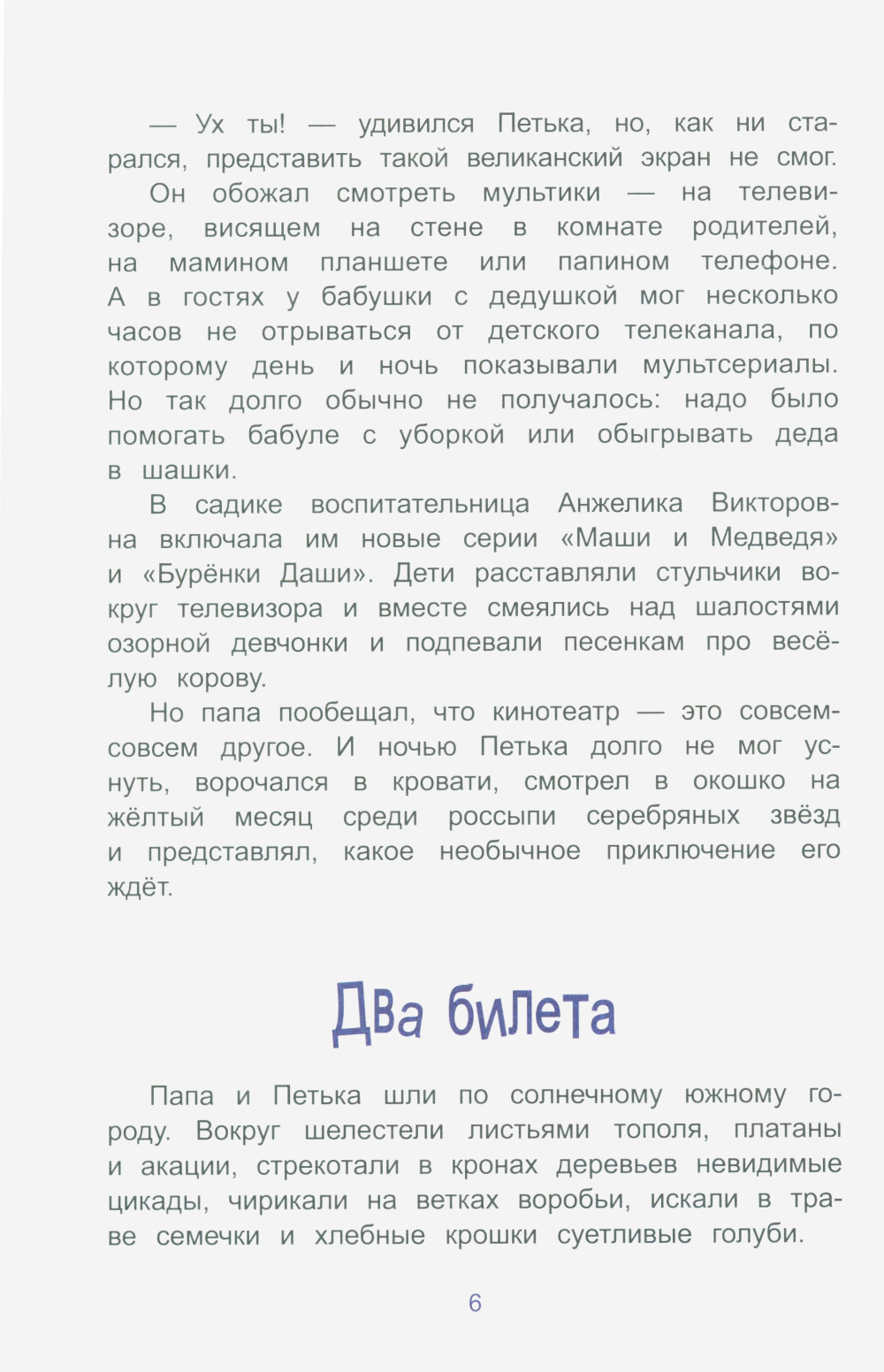 А чтобы читать было ещё увлекательнее, в книге есть сюрприз. Найдите на страницах кинохлопушки с QR-кодами, наведите смартфон и узнаете много интересного: когда в нашей стране открылся первый кинотеатр и кто такой тапёр, какие российские фильмы завоевали «Оскар» и что такое кульминационная сцена. Скорее занимайте свои места и усаживайтесь поудобнее: сеанс начинается. Добро пожаловать в «Петькино кино»!