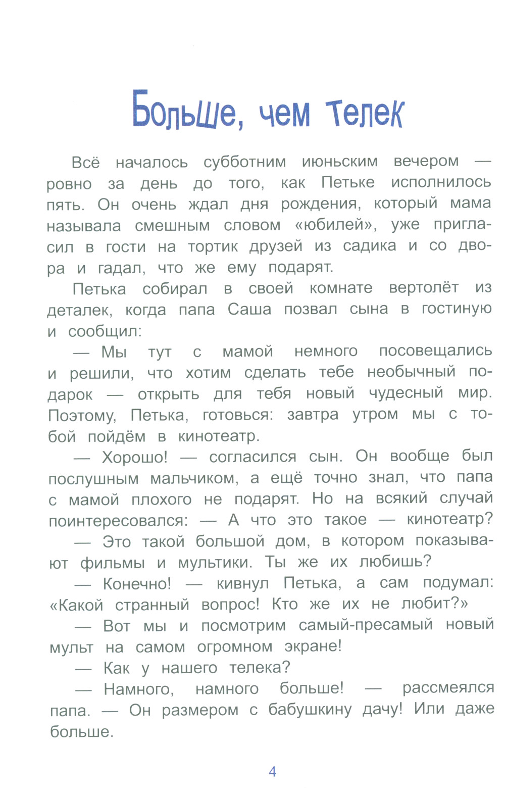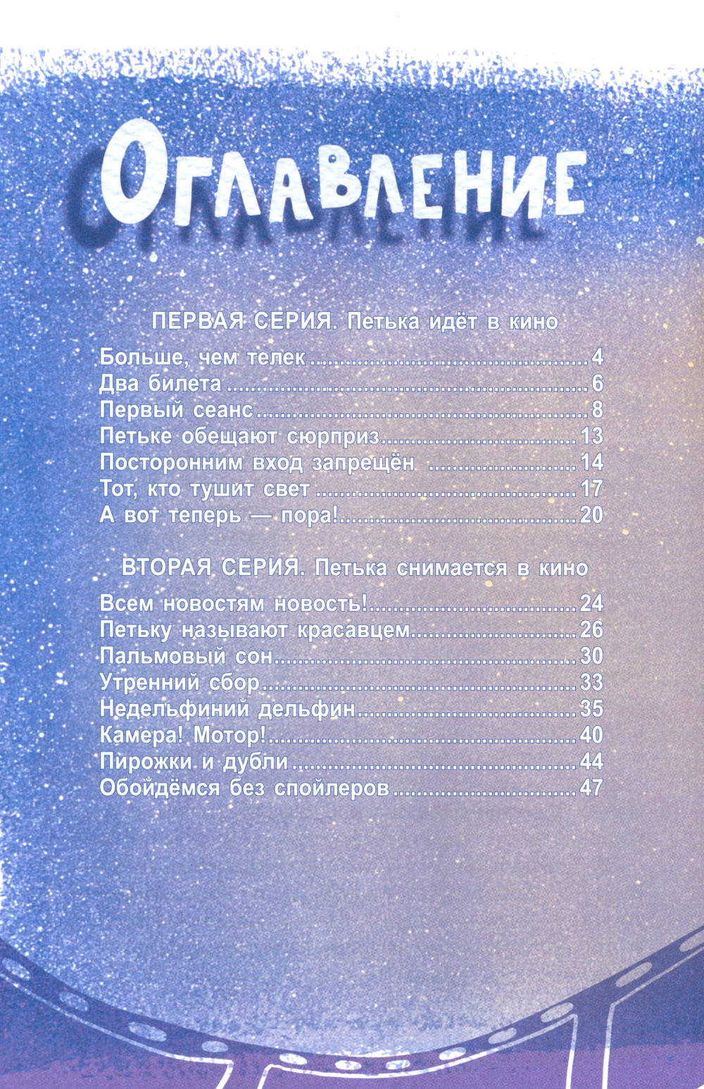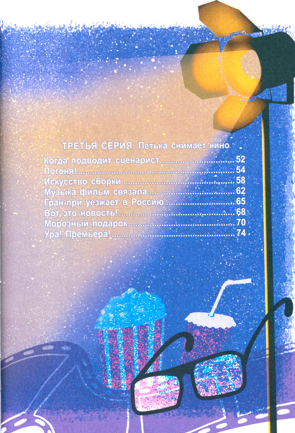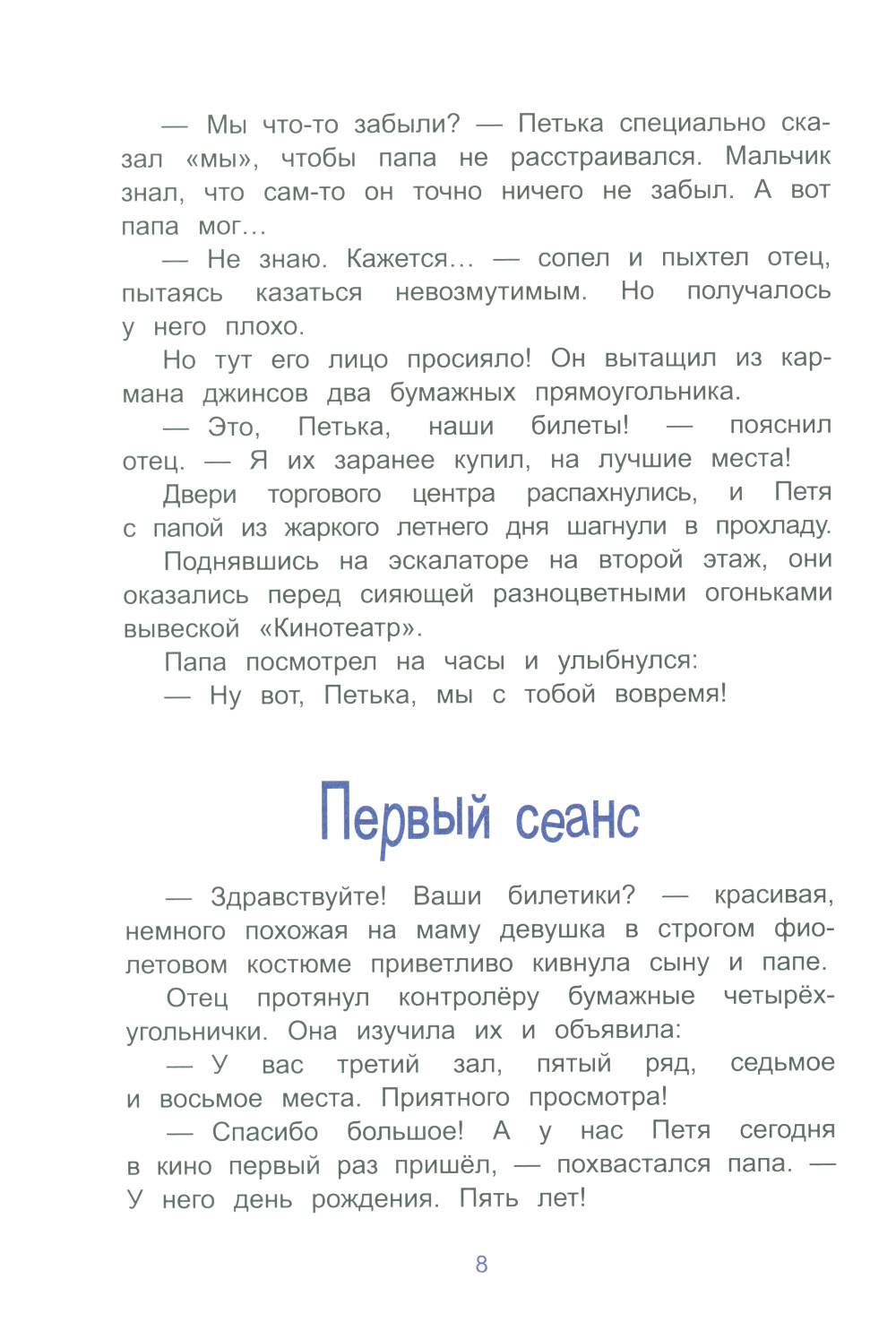 А вы знаете, как снимается кино? Как его показывают в кинотеатрах Сколько людей работает над одним фильмом? Петька не знал. Но однажды пришёл с папой на киносеанс и открыл для себя целый мир - красочный, волшебный, полный невероятных приключений. Вместе с маленьким героем повести читатели узнают, как работает кинопроектор, пройдут кастинг, побывают на самой настоящей съёмочной площадке и даже снимут короткометражку.