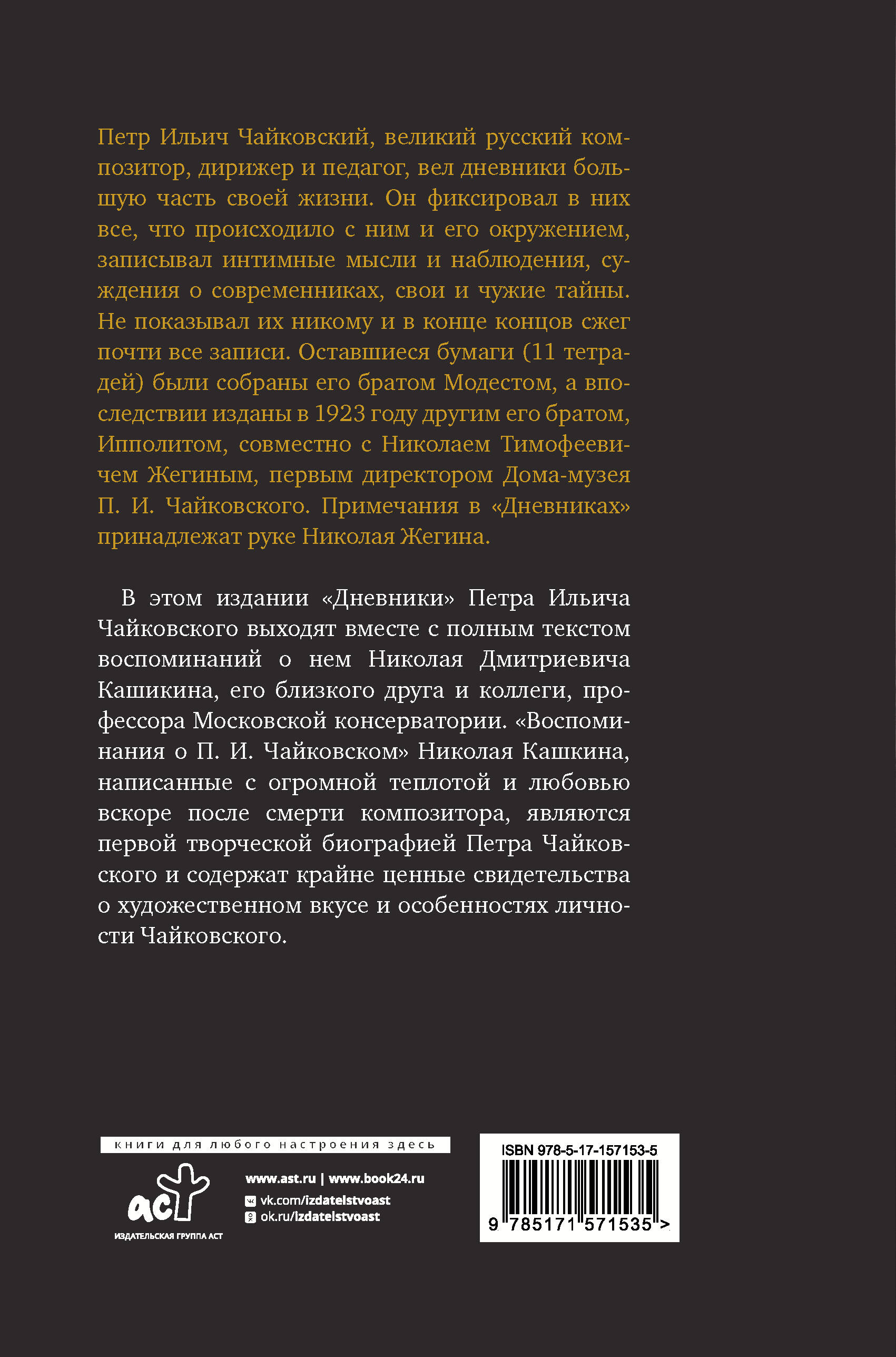 Петр Ильич Чайковский, великий русский композитор, дирижер и педагог, вел дневники большую часть своей жизни. Он фиксировал в них все, что происходило с ним и его окружением, записывал интимные мысли и наблюдения, суждения о современниках, свои и чужие тайны. Не показывал их никому и в конце концов сжег почти все записи. Оставшиеся бумаги (11 тетрадей) были собраны его братом Модестом, а впоследствии изданы в 1923 году другим его братом, Ипполитом, совместно с Николаем Тимофеевичем Жегиным, первым директором Дома-музея П. И. Чайковского. Примечания в "Дневниках" принадлежат руке Николая Жегина. В этом издании "Дневники" Петра Ильича Чайковского выходят вместе с полным текстом воспоминаний о нем , его близкого друга и коллеги, профессора Московской консерватории. "Воспоминания о П. И. Чайковском" Николая Кашкина, написанные с огромной теплотой и любовью вскоре после смерти композитора, являются первой творческой биографией Петра Чайковского и содержат крайне ценные свидетельства о художественном вкусе и особенностях личности Чайковского.
