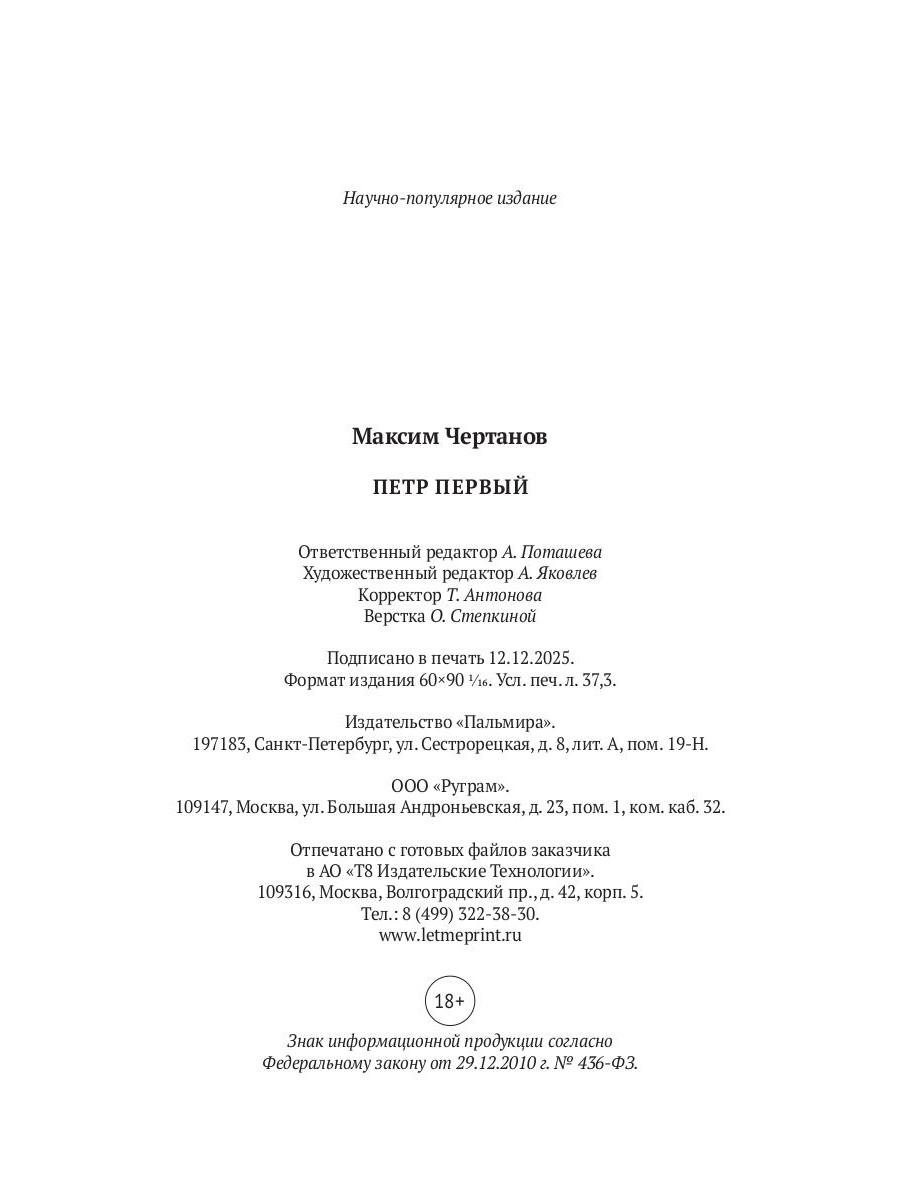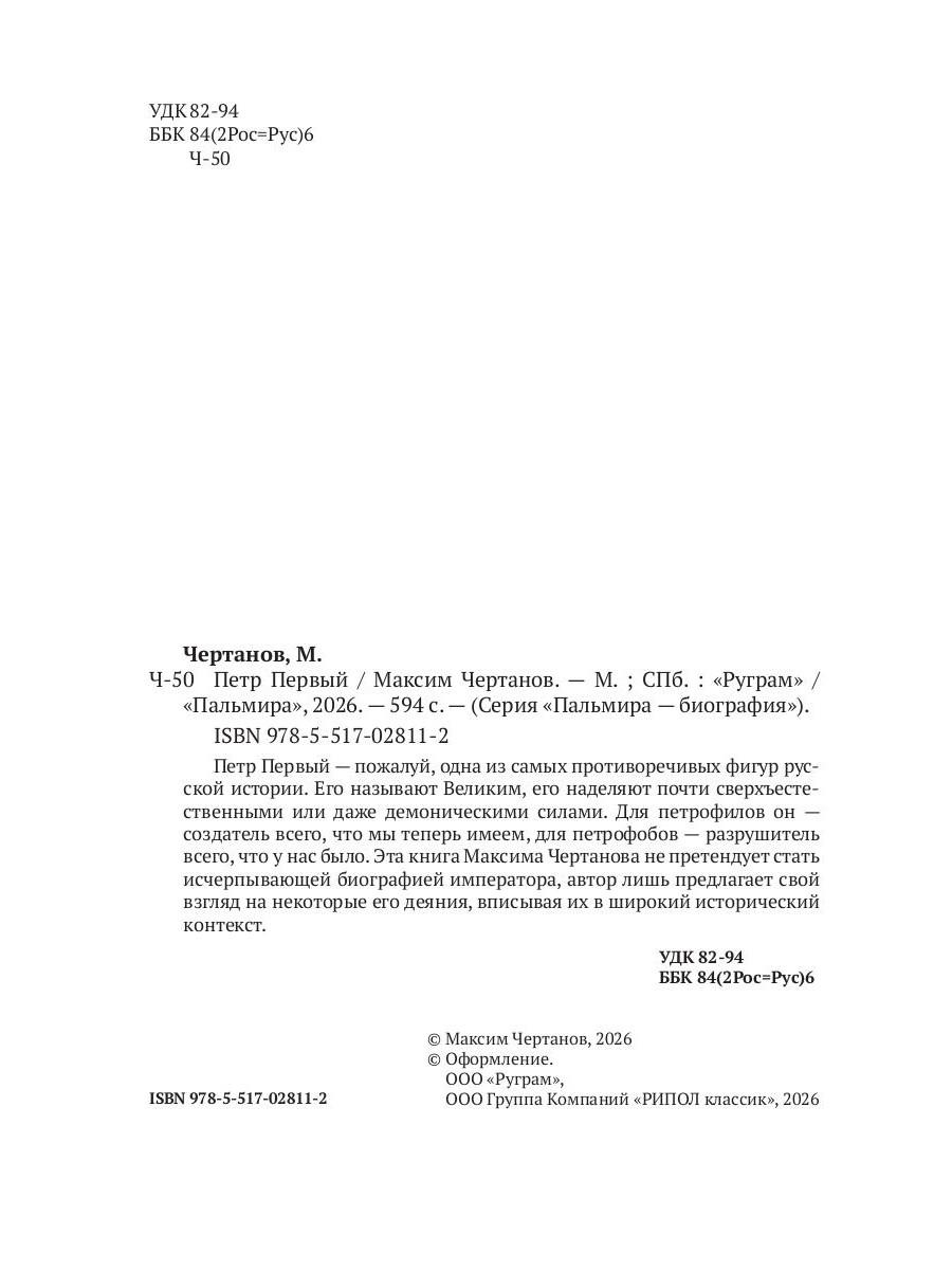Петр Первый - пожалуй, одна из самых противоречивых фигур русской истории. Его называют Великим, его наделяют почти сверхъестественными или даже демоническими силами. Для петрофилов он - создатель всего, что мы теперь имеем, для петрофобов - разрушитель всего, что у нас было. Эта книга Максима Чертанова не претендует стать исчерпывающей биографией императора, автор лишь предлагает свой взгляд на некоторые его деяния, вписывая их в широкий исторический контекст.| Издательство | Т8 RUGRAM |