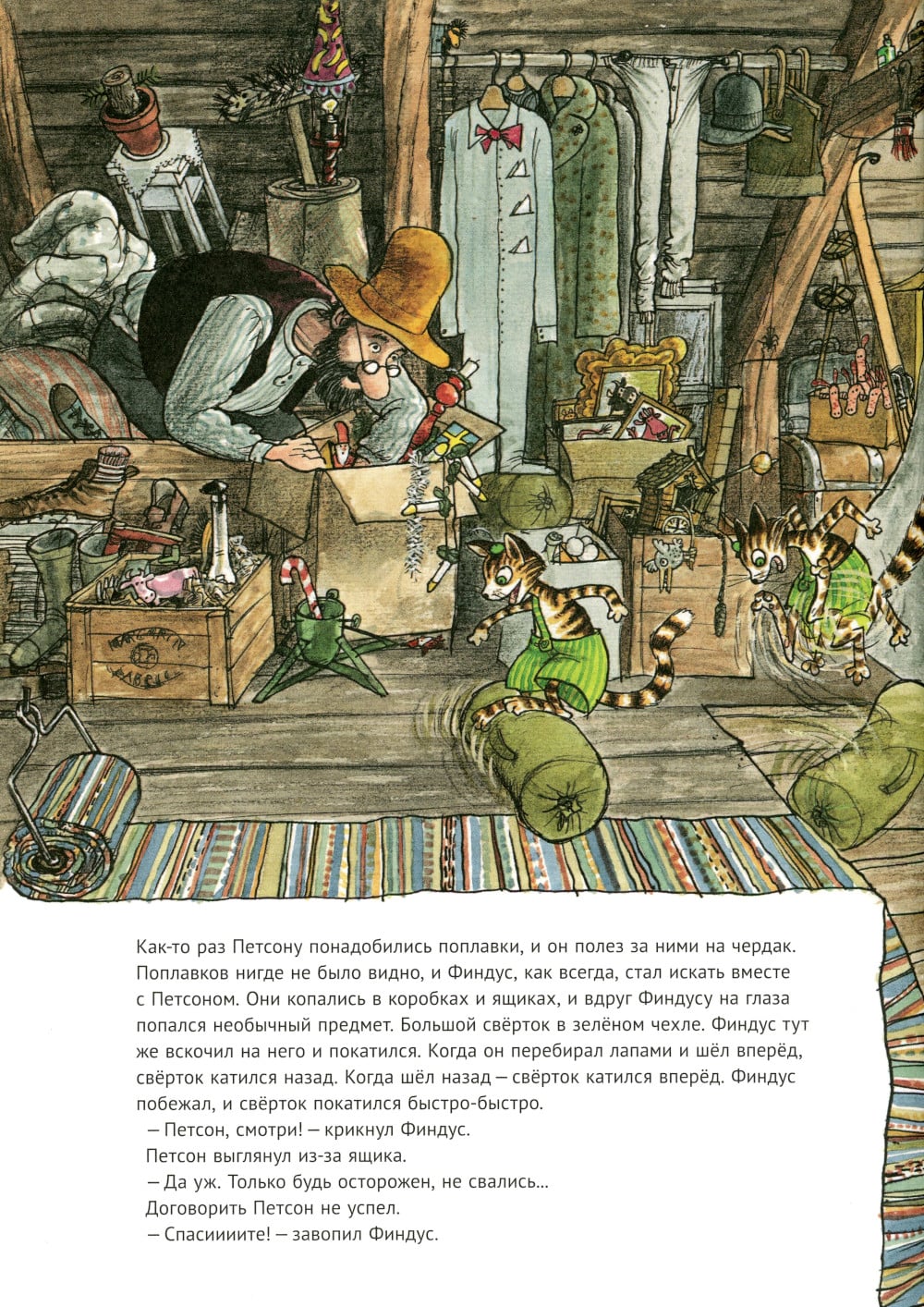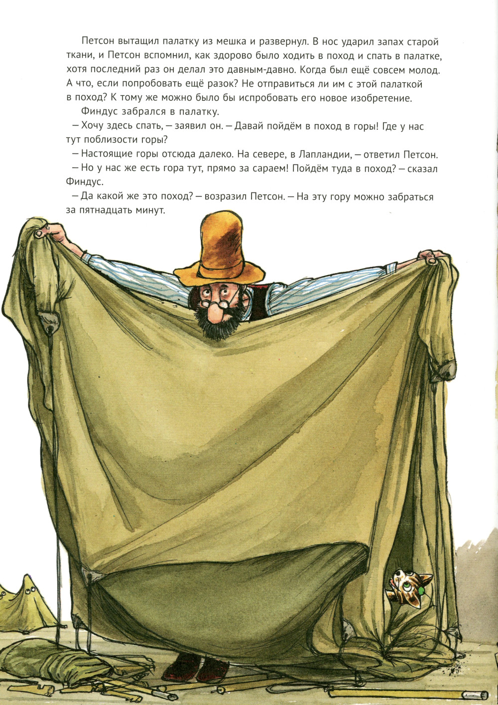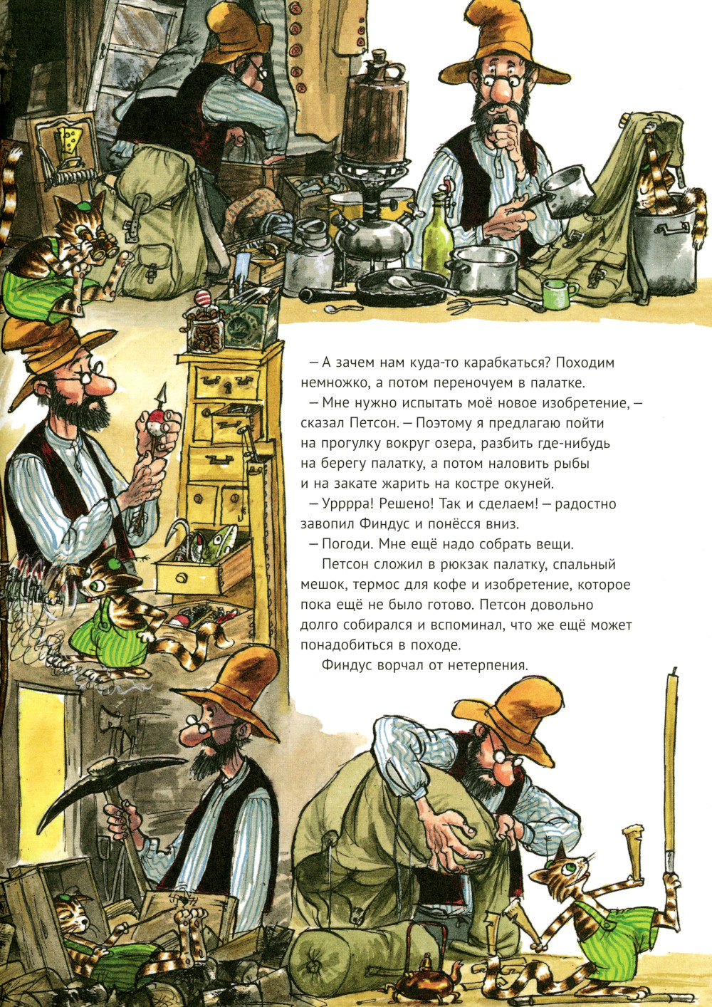 Чего только нет у Петсона на чердаке! Неудивительно, что Финдус нашел там палатку. Сами понимаете, где палатка - там и дальние странствия. Недолго думая, друзья пускаются в путь.