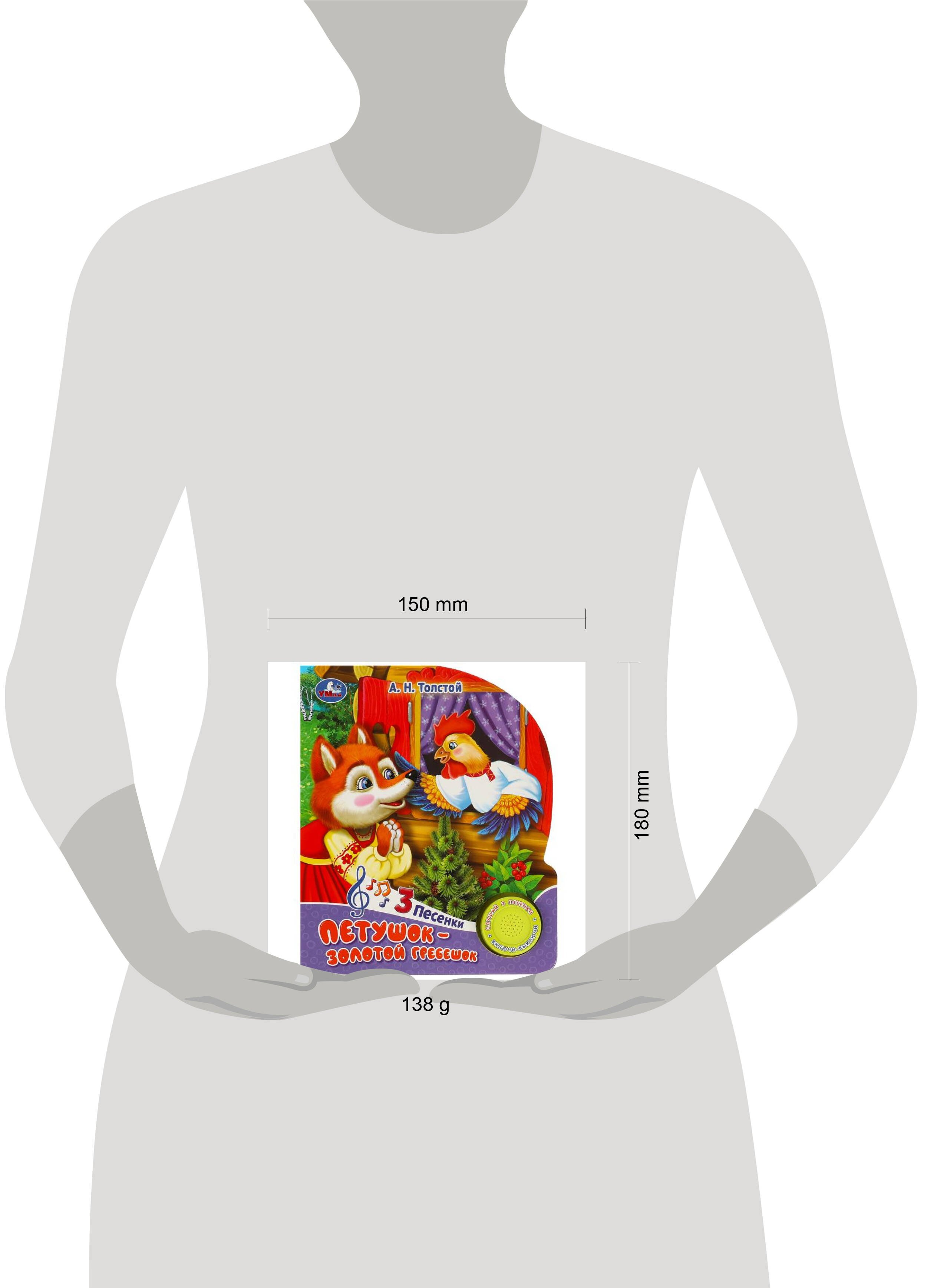 Музыкальная книга "Петушок - золотой гребешок" ТМ "УМка" станет прекрасным подарком для малыша: - 1 звуковая кнопка - 3 песенки по мотивам сказки - любимая сказка в обработке А. Н. Толстого - красочные иллюстрации - фигурная вырубка Ребёнок с удовольствием будет листать плотные страницы, рассматривать красочные картинки, вместе с родителями читать известную русскую народную сказку и, конечно, нажимать на кнопку и слушать весёлые песенки. Малыш легко освоит включение звука: по нажатию на кнопку песенка включится, при втором нажатии выключится, при третьем - заиграет следующая композиция. Благодаря компактному размеру книгу удобно взять с собой в дорогу. Музыкальная книга ТМ "УМка" развивает: - слуховое восприятие - навык чтения - фантазию - образное мышление - память Объём: 8 стр. Формат: 152 х 185 мм. Материал: пластмасса + картон. Работает от 3-х батареек типа LR1130 (в комплекте). Рекомендовано детям младшего дошкольного возраста.| Издательство | С-Маркет ООО |