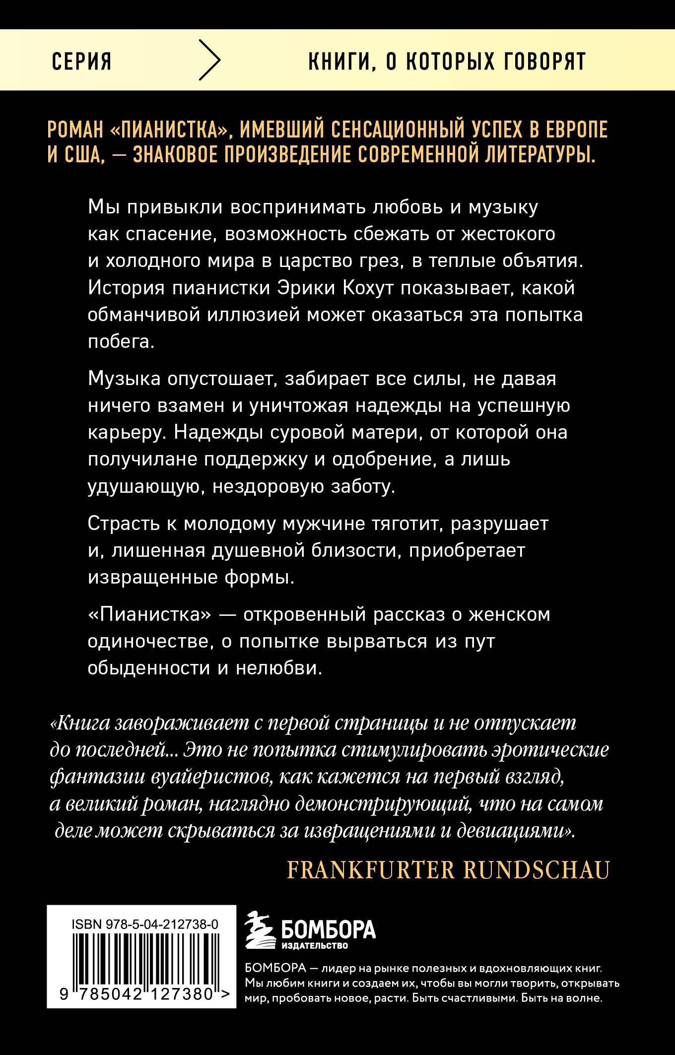 Мы привыкли воспринимать любовь и музыку как спасение, возможность сбежать от жестокого и холодного мира в царство грез, в теплые объятия. История пианистки Эрики Кохут показывает, какой обманчивой иллюзией может оказаться эта попытка побега. Музыка опустошает, забирает все силы, не давая ничего взамен и уничтожая надежды об успешной карьере. Надежды суровой матери, от которой она получила не поддержку и одобрение, а лишь удушающую, нездоровую заботу. Страсть к молодому мужчине тяготит, разрушает и, лишенная душевной близости, приобретает извращенные формы. «Пианистка» - откровенный рассказ о женском одиночестве, о попытке вырваться из пут обыденности и нелюбви.| Издательство | ООО "Издательство "Эксмо" |