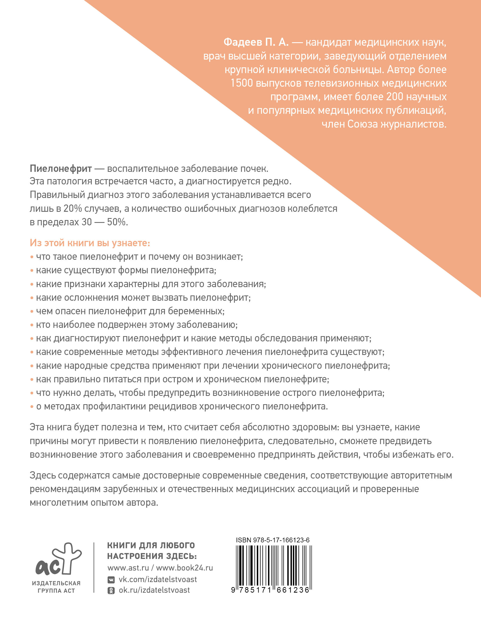 В книге в доступной форме изложены все основные вопросы, связанные с самым распространённым заболеванием почек - пиелонефритом. Читатель узнает, что такое пиелонефрит и какие факторы его провоцируют; каковы методы диагностики заболевания; какие бывают осложнения и как распознать их самостоятельно; как проводить правильные профилактические мероприятия, чтобы оставаться здоровым, и какой образ жизни и питания следует вести, если уже заразился. Настоящее издание опирается на самые современные медицинские, научные и статистические данные, собранные из самых авторитетных источников и соответствующие рекомендациям самых главных мировых здравоохранительных организаций.| Издательство | Издательство "АСТ" |